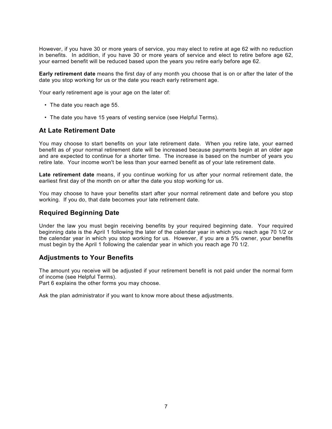 7 However, if you have 30 or more years of service, you may elect to retire at age 62 with no reduction in benefits. In addition, if you have 30 or more years of service and elect to retire before age 62, your earned benefit will be reduced based upon the years you retire early before age 62. Early retirement date means the first day of any month you choose that is on or after the later of the date you stop working for us or the date you reach early retirement age. Your early retirement age is your age on the later of: • The date you reach age 55. • The date you have 15 years of vesting service (see Helpful Terms). At Late Retirement Date You may choose to start benefits on your late retirement date. When you retire late, your earned benefit as of your normal retirement date will be increased because payments begin at an older age and are expected to continue for a shorter time. The increase is based on the number of years you retire late. Your income won't be less than your earned benefit as of your late retirement date. Late retirement date means, if you continue working for us after your normal retirement date, the earliest first day of the month on or after the date you stop working for us. You may choose to have your benefits start after your normal retirement date and before you stop working. If you do, that date becomes your late retirement date. Required Beginning Date Under the law you must begin receiving benefits by your required beginning date. Your required beginning date is the April 1 following the later of the calendar year in which you reach age 70 1/2 or the calendar year in which you stop working for us. However, if you are a 5% owner, your benefits must begin by the April 1 following the calendar year in which you reach age 70 1/2. Adjustments to Your Benefits The amount you receive will be adjusted if your retirement benefit is not paid under the normal form of income (see Helpful Terms). Part 6 explains the other forms you may choose. Ask the plan administrator if you want to know more about these adjustments.