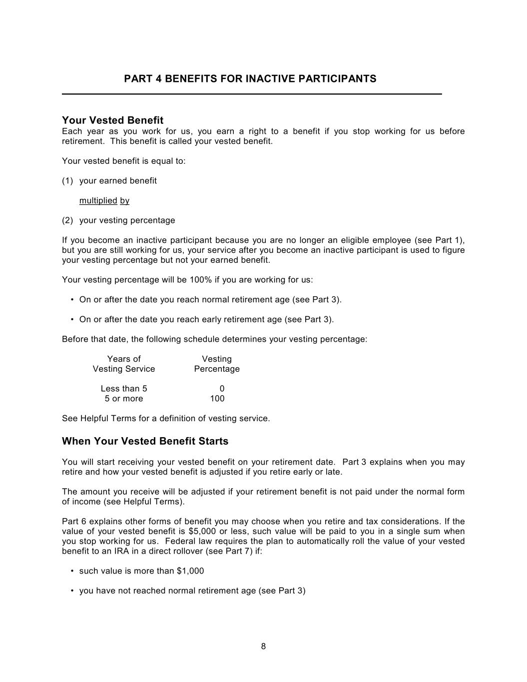 8 PART 4 BENEFITS FOR INACTIVE PARTICIPANTS Your Vested Benefit Each year as you work for us, you earn a right to a benefit if you stop working for us before retirement. This benefit is called your vested benefit. Your vested benefit is equal to: (1) your earned benefit multiplied by (2) your vesting percentage If you become an inactive participant because you are no longer an eligible employee (see Part 1), but you are still working for us, your service after you become an inactive participant is used to figure your vesting percentage but not your earned benefit. Your vesting percentage will be 100% if you are working for us: • On or after the date you reach normal retirement age (see Part 3). • On or after the date you reach early retirement age (see Part 3). Before that date, the following schedule determines your vesting percentage: Years of Vesting Vesting Service Percentage Less than 5 0 5 or more 100 See Helpful Terms for a definition of vesting service. When Your Vested Benefit Starts You will start receiving your vested benefit on your retirement date. Part 3 explains when you may retire and how your vested benefit is adjusted if you retire early or late. The amount you receive will be adjusted if your retirement benefit is not paid under the normal form of income (see Helpful Terms). Part 6 explains other forms of benefit you may choose when you retire and tax considerations. If the value of your vested benefit is $5,000 or less, such value will be paid to you in a single sum when you stop working for us. Federal law requires the plan to automatically roll the value of your vested benefit to an IRA in a direct rollover (see Part 7) if: • such value is more than $1,000 • you have not reached normal retirement age (see Part 3)