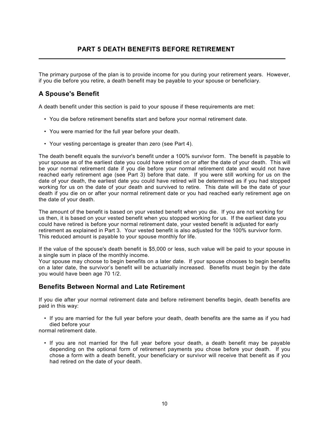 10 PART 5 DEATH BENEFITS BEFORE RETIREMENT The primary purpose of the plan is to provide income for you during your retirement years. However, if you die before you retire, a death benefit may be payable to your spouse or beneficiary. A Spouse's Benefit A death benefit under this section is paid to your spouse if these requirements are met: • You die before retirement benefits start and before your normal retirement date. • You were married for the full year before your death. • Your vesting percentage is greater than zero (see Part 4). The death benefit equals the survivor's benefit under a 100% survivor form. The benefit is payable to your spouse as of the earliest date you could have retired on or after the date of your death. This will be your normal retirement date if you die before your normal retirement date and would not have reached early retirement age (see Part 3) before that date. If you were still working for us on the date of your death, the earliest date you could have retired will be determined as if you had stopped working for us on the date of your death and survived to retire. This date will be the date of your death if you die on or after your normal retirement date or you had reached early retirement age on the date of your death. The amount of the benefit is based on your vested benefit when you die. If you are not working for us then, it is based on your vested benefit when you stopped working for us. If the earliest date you could have retired is before your normal retirement date, your vested benefit is adjusted for early retirement as explained in Part 3. Your vested benefit is also adjusted for the 100% survivor form. This reduced amount is payable to your spouse monthly for life. If the value of the spouse's death benefit is $5,000 or less, such value will be paid to your spouse in a single sum in place of the monthly income. Your spouse may choose to begin benefits on a later date. If your spouse chooses to begin benefits on a later date, the survivor’s benefit will be actuarially increased. Benefits must begin by the date you would have been age 70 1/2. Benefits Between Normal and Late Retirement If you die after your normal retirement date and before retirement benefits begin, death benefits are paid in this way: • If you are married for the full year before your death, death benefits are the same as if you had died before your normal retirement date. • If you are not married for the full year before your death, a death benefit may be payable depending on the optional form of retirement payments you chose before your death. If you chose a form with a death benefit, your beneficiary or survivor will receive that benefit as if you had retired on the date of your death.