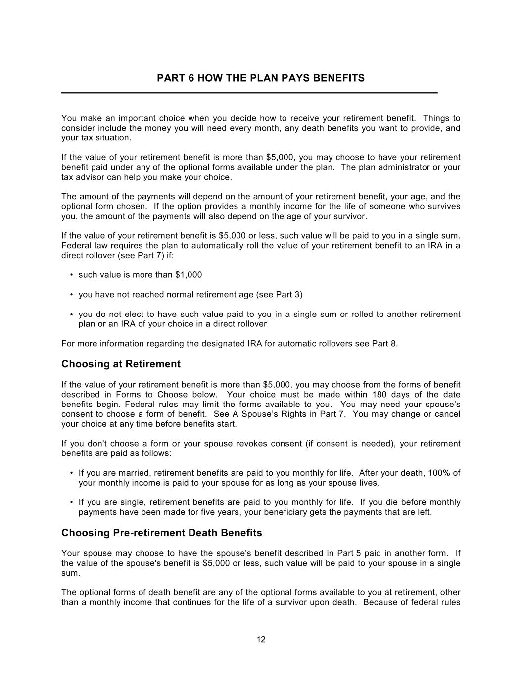 12 PART 6 HOW THE PLAN PAYS BENEFITS You make an important choice when you decide how to receive your retirement benefit. Things to consider include the money you will need every month, any death benefits you want to provide, and your tax situation. If the value of your retirement benefit is more than $5,000, you may choose to have your retirement benefit paid under any of the optional forms available under the plan. The plan administrator or your tax advisor can help you make your choice. The amount of the payments will depend on the amount of your retirement benefit, your age, and the optional form chosen. If the option provides a monthly income for the life of someone who survives you, the amount of the payments will also depend on the age of your survivor. If the value of your retirement benefit is $5,000 or less, such value will be paid to you in a single sum. Federal law requires the plan to automatically roll the value of your retirement benefit to an IRA in a direct rollover (see Part 7) if: • such value is more than $1,000 • you have not reached normal retirement age (see Part 3) • you do not elect to have such value paid to you in a single sum or rolled to another retirement plan or an IRA of your choice in a direct rollover For more information regarding the designated IRA for automatic rollovers see Part 8. Choosing at Retirement If the value of your retirement benefit is more than $5,000, you may choose from the forms of benefit described in Forms to Choose below. Your choice must be made within 180 days of the date benefits begin. Federal rules may limit the forms available to you. You may need your spouse’s consent to choose a form of benefit. See A Spouse’s Rights in Part 7. You may change or cancel your choice at any time before benefits start. If you don't choose a form or your spouse revokes consent (if consent is needed), your retirement benefits are paid as follows: • If you are married, retirement benefits are paid to you monthly for life. After your death, 100% of your monthly income is paid to your spouse for as long as your spouse lives. • If you are single, retirement benefits are paid to you monthly for life. If you die before monthly payments have been made for five years, your beneficiary gets the payments that are left. Choosing Pre-retirement Death Benefits Your spouse may choose to have the spouse's benefit described in Part 5 paid in another form. If the value of the spouse's benefit is $5,000 or less, such value will be paid to your spouse in a single sum. The optional forms of death benefit are any of the optional forms available to you at retirement, other than a monthly income that continues for the life of a survivor upon death. Because of federal rules