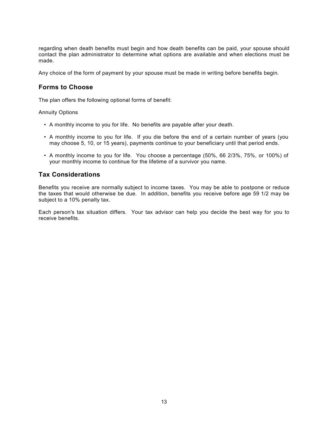 13 regarding when death benefits must begin and how death benefits can be paid, your spouse should contact the plan administrator to determine what options are available and when elections must be made. Any choice of the form of payment by your spouse must be made in writing before benefits begin. Forms to Choose The plan offers the following optional forms of benefit: Annuity Options • A monthly income to you for life. No benefits are payable after your death. • A monthly income to you for life. If you die before the end of a certain number of years (you may choose 5, 10, or 15 years), payments continue to your beneficiary until that period ends. • A monthly income to you for life. You choose a percentage (50%, 66 2/3%, 75%, or 100%) of your monthly income to continue for the lifetime of a survivor you name. Tax Considerations Benefits you receive are normally subject to income taxes. You may be able to postpone or reduce the taxes that would otherwise be due. In addition, benefits you receive before age 59 1/2 may be subject to a 10% penalty tax. Each person's tax situation differs. Your tax advisor can help you decide the best way for you to receive benefits.