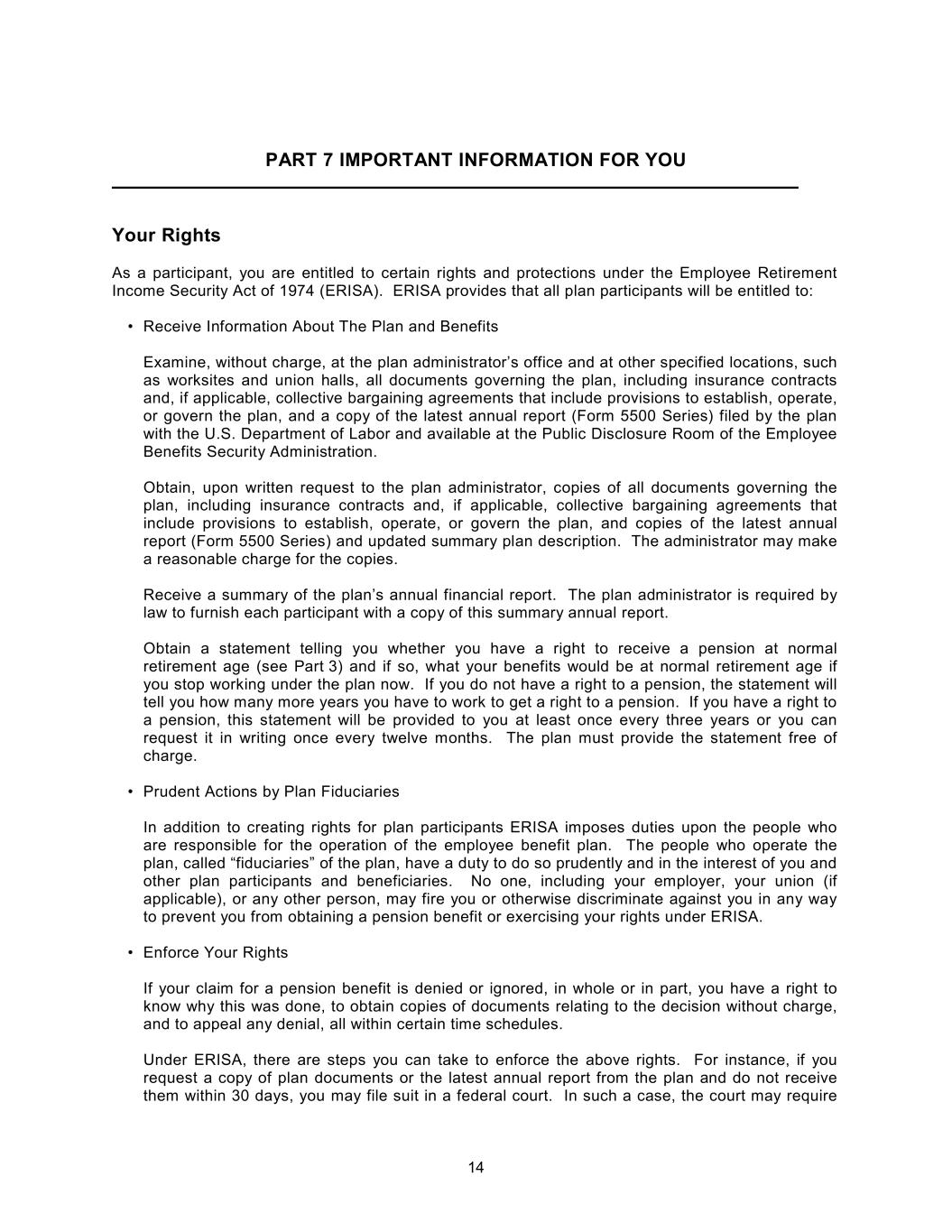 14 PART 7 IMPORTANT INFORMATION FOR YOU Your Rights As a participant, you are entitled to certain rights and protections under the Employee Retirement Income Security Act of 1974 (ERISA). ERISA provides that all plan participants will be entitled to: • Receive Information About The Plan and Benefits Examine, without charge, at the plan administrator’s office and at other specified locations, such as worksites and union halls, all documents governing the plan, including insurance contracts and, if applicable, collective bargaining agreements that include provisions to establish, operate, or govern the plan, and a copy of the latest annual report (Form 5500 Series) filed by the plan with the U.S. Department of Labor and available at the Public Disclosure Room of the Employee Benefits Security Administration. Obtain, upon written request to the plan administrator, copies of all documents governing the plan, including insurance contracts and, if applicable, collective bargaining agreements that include provisions to establish, operate, or govern the plan, and copies of the latest annual report (Form 5500 Series) and updated summary plan description. The administrator may make a reasonable charge for the copies. Receive a summary of the plan’s annual financial report. The plan administrator is required by law to furnish each participant with a copy of this summary annual report. Obtain a statement telling you whether you have a right to receive a pension at normal retirement age (see Part 3) and if so, what your benefits would be at normal retirement age if you stop working under the plan now. If you do not have a right to a pension, the statement will tell you how many more years you have to work to get a right to a pension. If you have a right to a pension, this statement will be provided to you at least once every three years or you can request it in writing once every twelve months. The plan must provide the statement free of charge. • Prudent Actions by Plan Fiduciaries In addition to creating rights for plan participants ERISA imposes duties upon the people who are responsible for the operation of the employee benefit plan. The people who operate the plan, called “fiduciaries” of the plan, have a duty to do so prudently and in the interest of you and other plan participants and beneficiaries. No one, including your employer, your union (if applicable), or any other person, may fire you or otherwise discriminate against you in any way to prevent you from obtaining a pension benefit or exercising your rights under ERISA. • Enforce Your Rights If your claim for a pension benefit is denied or ignored, in whole or in part, you have a right to know why this was done, to obtain copies of documents relating to the decision without charge, and to appeal any denial, all within certain time schedules. Under ERISA, there are steps you can take to enforce the above rights. For instance, if you request a copy of plan documents or the latest annual report from the plan and do not receive them within 30 days, you may file suit in a federal court. In such a case, the court may require