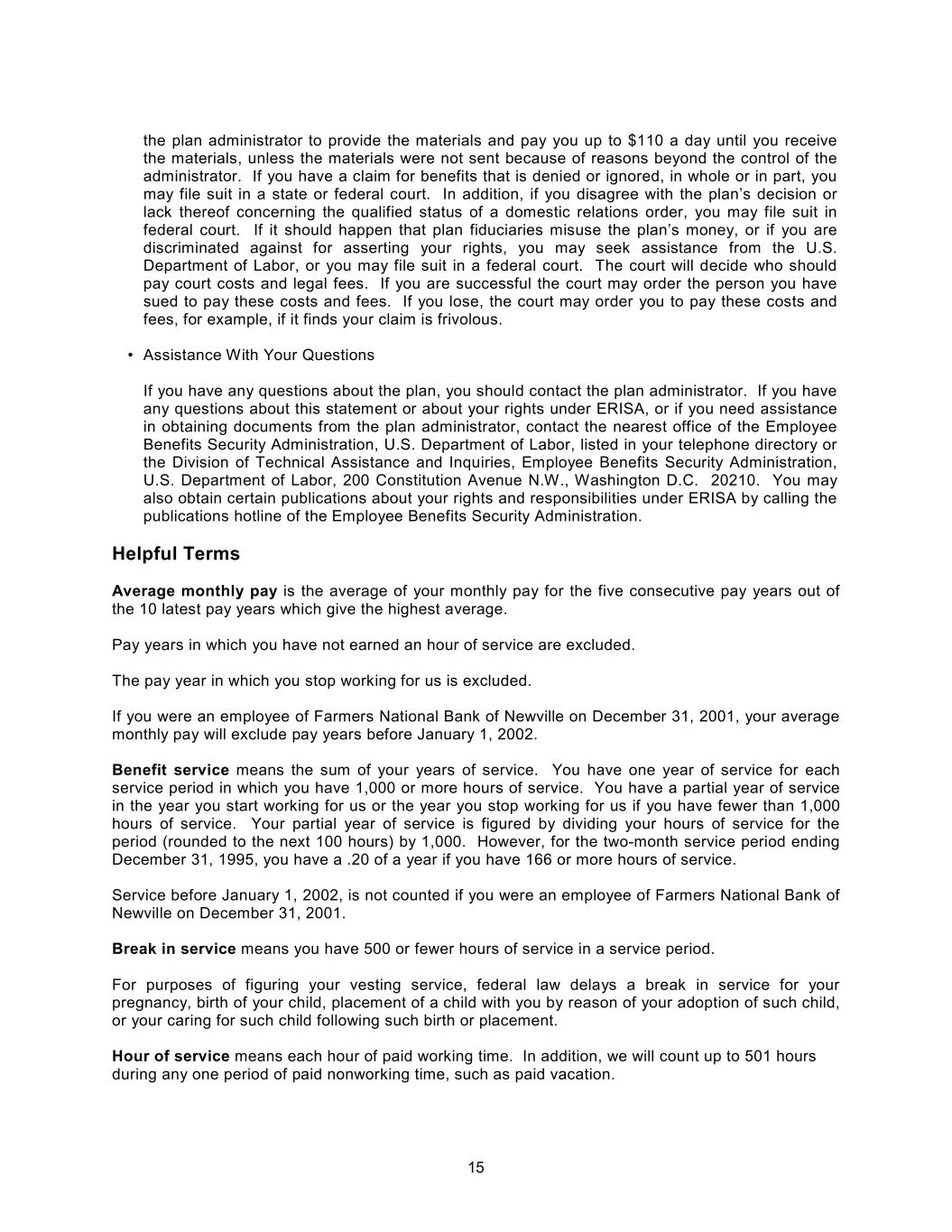 15 the plan administrator to provide the materials and pay you up to $110 a day until you receive the materials, unless the materials were not sent because of reasons beyond the control of the administrator. If you have a claim for benefits that is denied or ignored, in whole or in part, you may file suit in a state or federal court. In addition, if you disagree with the plan’s decision or lack thereof concerning the qualified status of a domestic relations order, you may file suit in federal court. If it should happen that plan fiduciaries misuse the plan’s money, or if you are discriminated against for asserting your rights, you may seek assistance from the U.S. Department of Labor, or you may file suit in a federal court. The court will decide who should pay court costs and legal fees. If you are successful the court may order the person you have sued to pay these costs and fees. If you lose, the court may order you to pay these costs and fees, for example, if it finds your claim is frivolous. • Assistance With Your Questions If you have any questions about the plan, you should contact the plan administrator. If you have any questions about this statement or about your rights under ERISA, or if you need assistance in obtaining documents from the plan administrator, contact the nearest office of the Employee Benefits Security Administration, U.S. Department of Labor, listed in your telephone directory or the Division of Technical Assistance and Inquiries, Employee Benefits Security Administration, U.S. Department of Labor, 200 Constitution Avenue N.W., Washington D.C. 20210. You may also obtain certain publications about your rights and responsibilities under ERISA by calling the publications hotline of the Employee Benefits Security Administration. Helpful Terms Average monthly pay is the average of your monthly pay for the five consecutive pay years out of the 10 latest pay years which give the highest average. Pay years in which you have not earned an hour of service are excluded. The pay year in which you stop working for us is excluded. If you were an employee of Farmers National Bank of Newville on December 31, 2001, your average monthly pay will exclude pay years before January 1, 2002. Benefit service means the sum of your years of service. You have one year of service for each service period in which you have 1,000 or more hours of service. You have a partial year of service in the year you start working for us or the year you stop working for us if you have fewer than 1,000 hours of service. Your partial year of service is figured by dividing your hours of service for the period (rounded to the next 100 hours) by 1,000. However, for the two-month service period ending December 31, 1995, you have a .20 of a year if you have 166 or more hours of service. Service before January 1, 2002, is not counted if you were an employee of Farmers National Bank of Newville on December 31, 2001. Break in service means you have 500 or fewer hours of service in a service period. For purposes of figuring your vesting service, federal law delays a break in service for your pregnancy, birth of your child, placement of a child with you by reason of your adoption of such child, or your caring for such child following such birth or placement. Hour of service means each hour of paid working time. In addition, we will count up to 501 hours during any one period of paid nonworking time, such as paid vacation.