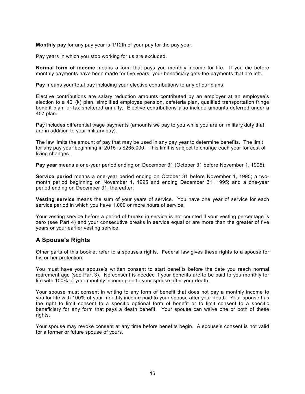 16 Monthly pay for any pay year is 1/12th of your pay for the pay year. Pay years in which you stop working for us are excluded. Normal form of income means a form that pays you monthly income for life. If you die before monthly payments have been made for five years, your beneficiary gets the payments that are left. Pay means your total pay including your elective contributions to any of our plans. Elective contributions are salary reduction amounts contributed by an employer at an employee’s election to a 401(k) plan, simplified employee pension, cafeteria plan, qualified transportation fringe benefit plan, or tax sheltered annuity. Elective contributions also include amounts deferred under a 457 plan. Pay includes differential wage payments (amounts we pay to you while you are on military duty that are in addition to your military pay). The law limits the amount of pay that may be used in any pay year to determine benefits. The limit for any pay year beginning in 2015 is $265,000. This limit is subject to change each year for cost of living changes. Pay year means a one-year period ending on December 31 (October 31 before November 1, 1995). Service period means a one-year period ending on October 31 before November 1, 1995; a two- month period beginning on November 1, 1995 and ending December 31, 1995; and a one-year period ending on December 31, thereafter. Vesting service means the sum of your years of service. You have one year of service for each service period in which you have 1,000 or more hours of service. Your vesting service before a period of breaks in service is not counted if your vesting percentage is zero (see Part 4) and your consecutive breaks in service equal or are more than the greater of five years or your earlier vesting service. A Spouse's Rights Other parts of this booklet refer to a spouse's rights. Federal law gives these rights to a spouse for his or her protection. You must have your spouse’s written consent to start benefits before the date you reach normal retirement age (see Part 3). No consent is needed if your benefits are to be paid to you monthly for life with 100% of your monthly income paid to your spouse after your death. Your spouse must consent in writing to any form of benefit that does not pay a monthly income to you for life with 100% of your monthly income paid to your spouse after your death. Your spouse has the right to limit consent to a specific optional form of benefit or to limit consent to a specific beneficiary for any form that pays a death benefit. Your spouse can waive one or both of these rights. Your spouse may revoke consent at any time before benefits begin. A spouse’s consent is not valid for a former or future spouse of yours.