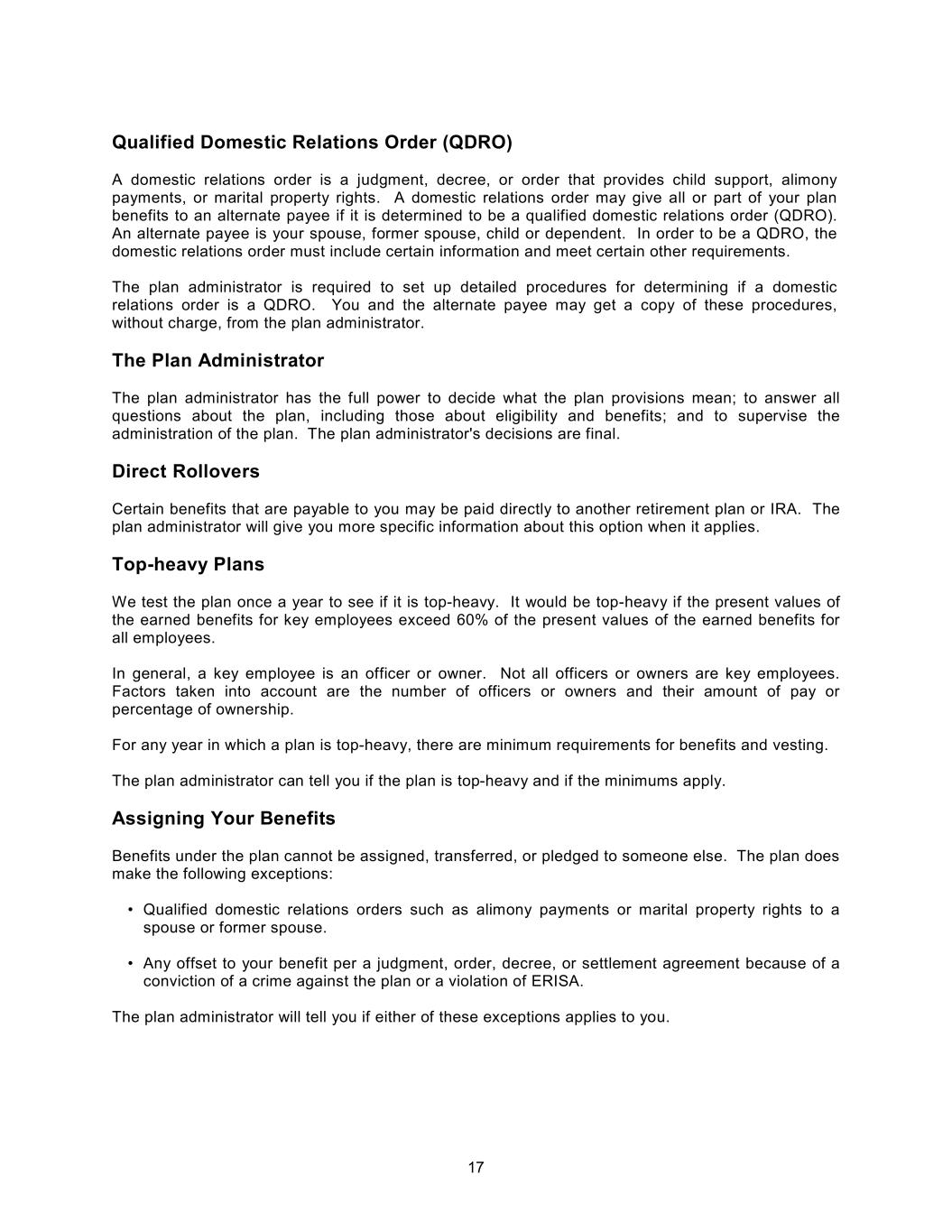17 Qualified Domestic Relations Order (QDRO) A domestic relations order is a judgment, decree, or order that provides child support, alimony payments, or marital property rights. A domestic relations order may give all or part of your plan benefits to an alternate payee if it is determined to be a qualified domestic relations order (QDRO). An alternate payee is your spouse, former spouse, child or dependent. In order to be a QDRO, the domestic relations order must include certain information and meet certain other requirements. The plan administrator is required to set up detailed procedures for determining if a domestic relations order is a QDRO. You and the alternate payee may get a copy of these procedures, without charge, from the plan administrator. The Plan Administrator The plan administrator has the full power to decide what the plan provisions mean; to answer all questions about the plan, including those about eligibility and benefits; and to supervise the administration of the plan. The plan administrator's decisions are final. Direct Rollovers Certain benefits that are payable to you may be paid directly to another retirement plan or IRA. The plan administrator will give you more specific information about this option when it applies. Top-heavy Plans We test the plan once a year to see if it is top-heavy. It would be top-heavy if the present values of the earned benefits for key employees exceed 60% of the present values of the earned benefits for all employees. In general, a key employee is an officer or owner. Not all officers or owners are key employees. Factors taken into account are the number of officers or owners and their amount of pay or percentage of ownership. For any year in which a plan is top-heavy, there are minimum requirements for benefits and vesting. The plan administrator can tell you if the plan is top-heavy and if the minimums apply. Assigning Your Benefits Benefits under the plan cannot be assigned, transferred, or pledged to someone else. The plan does make the following exceptions: • Qualified domestic relations orders such as alimony payments or marital property rights to a spouse or former spouse. • Any offset to your benefit per a judgment, order, decree, or settlement agreement because of a conviction of a crime against the plan or a violation of ERISA. The plan administrator will tell you if either of these exceptions applies to you.