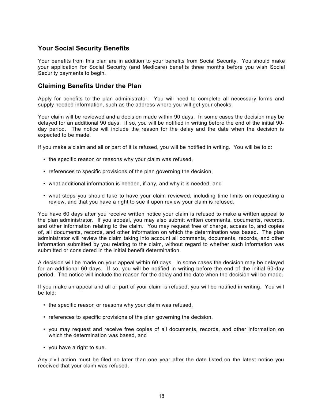18 Your Social Security Benefits Your benefits from this plan are in addition to your benefits from Social Security. You should make your application for Social Security (and Medicare) benefits three months before you wish Social Security payments to begin. Claiming Benefits Under the Plan Apply for benefits to the plan administrator. You will need to complete all necessary forms and supply needed information, such as the address where you will get your checks. Your claim will be reviewed and a decision made within 90 days. In some cases the decision may be delayed for an additional 90 days. If so, you will be notified in writing before the end of the initial 90- day period. The notice will include the reason for the delay and the date when the decision is expected to be made. If you make a claim and all or part of it is refused, you will be notified in writing. You will be told: • the specific reason or reasons why your claim was refused, • references to specific provisions of the plan governing the decision, • what additional information is needed, if any, and why it is needed, and • what steps you should take to have your claim reviewed, including time limits on requesting a review, and that you have a right to sue if upon review your claim is refused. You have 60 days after you receive written notice your claim is refused to make a written appeal to the plan administrator. If you appeal, you may also submit written comments, documents, records, and other information relating to the claim. You may request free of charge, access to, and copies of, all documents, records, and other information on which the determination was based. The plan administrator will review the claim taking into account all comments, documents, records, and other information submitted by you relating to the claim, without regard to whether such information was submitted or considered in the initial benefit determination. A decision will be made on your appeal within 60 days. In some cases the decision may be delayed for an additional 60 days. If so, you will be notified in writing before the end of the initial 60-day period. The notice will include the reason for the delay and the date when the decision will be made. If you make an appeal and all or part of your claim is refused, you will be notified in writing. You will be told: • the specific reason or reasons why your claim was refused, • references to specific provisions of the plan governing the decision, • you may request and receive free copies of all documents, records, and other information on which the determination was based, and • you have a right to sue. Any civil action must be filed no later than one year after the date listed on the latest notice you received that your claim was refused.