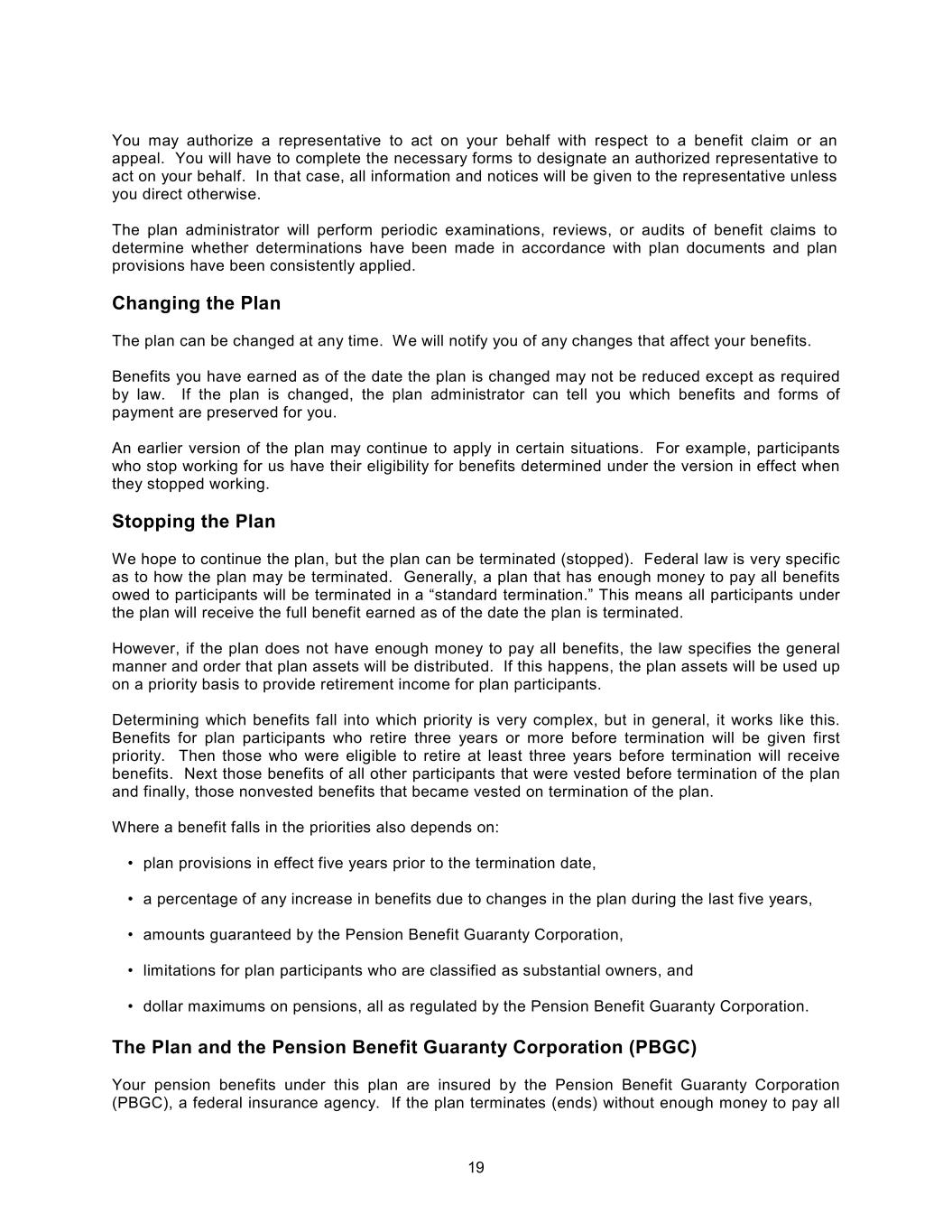 19 You may authorize a representative to act on your behalf with respect to a benefit claim or an appeal. You will have to complete the necessary forms to designate an authorized representative to act on your behalf. In that case, all information and notices will be given to the representative unless you direct otherwise. The plan administrator will perform periodic examinations, reviews, or audits of benefit claims to determine whether determinations have been made in accordance with plan documents and plan provisions have been consistently applied. Changing the Plan The plan can be changed at any time. We will notify you of any changes that affect your benefits. Benefits you have earned as of the date the plan is changed may not be reduced except as required by law. If the plan is changed, the plan administrator can tell you which benefits and forms of payment are preserved for you. An earlier version of the plan may continue to apply in certain situations. For example, participants who stop working for us have their eligibility for benefits determined under the version in effect when they stopped working. Stopping the Plan We hope to continue the plan, but the plan can be terminated (stopped). Federal law is very specific as to how the plan may be terminated. Generally, a plan that has enough money to pay all benefits owed to participants will be terminated in a “standard termination.” This means all participants under the plan will receive the full benefit earned as of the date the plan is terminated. However, if the plan does not have enough money to pay all benefits, the law specifies the general manner and order that plan assets will be distributed. If this happens, the plan assets will be used up on a priority basis to provide retirement income for plan participants. Determining which benefits fall into which priority is very complex, but in general, it works like this. Benefits for plan participants who retire three years or more before termination will be given first priority. Then those who were eligible to retire at least three years before termination will receive benefits. Next those benefits of all other participants that were vested before termination of the plan and finally, those nonvested benefits that became vested on termination of the plan. Where a benefit falls in the priorities also depends on: • plan provisions in effect five years prior to the termination date, • a percentage of any increase in benefits due to changes in the plan during the last five years, • amounts guaranteed by the Pension Benefit Guaranty Corporation, • limitations for plan participants who are classified as substantial owners, and • dollar maximums on pensions, all as regulated by the Pension Benefit Guaranty Corporation. The Plan and the Pension Benefit Guaranty Corporation (PBGC) Your pension benefits under this plan are insured by the Pension Benefit Guaranty Corporation (PBGC), a federal insurance agency. If the plan terminates (ends) without enough money to pay all