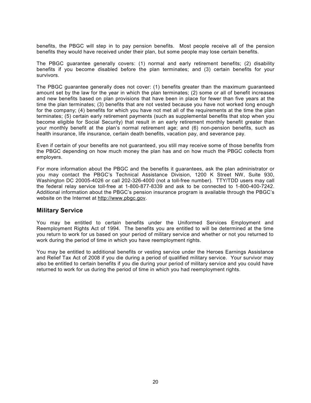 20 benefits, the PBGC will step in to pay pension benefits. Most people receive all of the pension benefits they would have received under their plan, but some people may lose certain benefits. The PBGC guarantee generally covers: (1) normal and early retirement benefits; (2) disability benefits if you become disabled before the plan terminates; and (3) certain benefits for your survivors. The PBGC guarantee generally does not cover: (1) benefits greater than the maximum guaranteed amount set by the law for the year in which the plan terminates; (2) some or all of benefit increases and new benefits based on plan provisions that have been in place for fewer than five years at the time the plan terminates; (3) benefits that are not vested because you have not worked long enough for the company; (4) benefits for which you have not met all of the requirements at the time the plan terminates; (5) certain early retirement payments (such as supplemental benefits that stop when you become eligible for Social Security) that result in an early retirement monthly benefit greater than your monthly benefit at the plan’s normal retirement age; and (6) non-pension benefits, such as health insurance, life insurance, certain death benefits, vacation pay, and severance pay. Even if certain of your benefits are not guaranteed, you still may receive some of those benefits from the PBGC depending on how much money the plan has and on how much the PBGC collects from employers. For more information about the PBGC and the benefits it guarantees, ask the plan administrator or you may contact the PBGC’s Technical Assistance Division, 1200 K Street NW, Suite 930, Washington DC 20005-4026 or call 202-326-4000 (not a toll-free number). TTY/TDD users may call the federal relay service toll-free at 1-800-877-8339 and ask to be connected to 1-800-400-7242. Additional information about the PBGC’s pension insurance program is available through the PBGC’s website on the Internet at http://www.pbgc.gov. Military Service You may be entitled to certain benefits under the Uniformed Services Employment and Reemployment Rights Act of 1994. The benefits you are entitled to will be determined at the time you return to work for us based on your period of military service and whether or not you returned to work during the period of time in which you have reemployment rights. You may be entitled to additional benefits or vesting service under the Heroes Earnings Assistance and Relief Tax Act of 2008 if you die during a period of qualified military service. Your survivor may also be entitled to certain benefits if you die during your period of military service and you could have returned to work for us during the period of time in which you had reemployment rights.