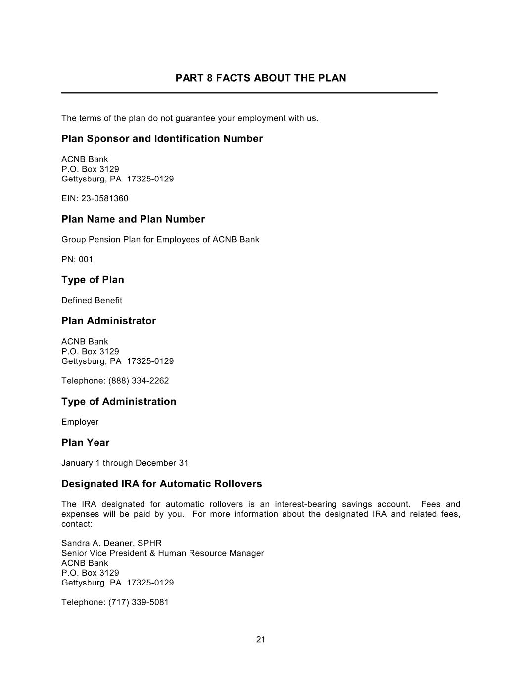 21 PART 8 FACTS ABOUT THE PLAN The terms of the plan do not guarantee your employment with us. Plan Sponsor and Identification Number ACNB Bank P.O. Box 3129 Gettysburg, PA 17325-0129 EIN: 23-0581360 Plan Name and Plan Number Group Pension Plan for Employees of ACNB Bank PN: 001 Type of Plan Defined Benefit Plan Administrator ACNB Bank P.O. Box 3129 Gettysburg, PA 17325-0129 Telephone: (888) 334-2262 Type of Administration Employer Plan Year January 1 through December 31 Designated IRA for Automatic Rollovers The IRA designated for automatic rollovers is an interest-bearing savings account. Fees and expenses will be paid by you. For more information about the designated IRA and related fees, contact: Sandra A. Deaner, SPHR Senior Vice President & Human Resource Manager ACNB Bank P.O. Box 3129 Gettysburg, PA 17325-0129 Telephone: (717) 339-5081