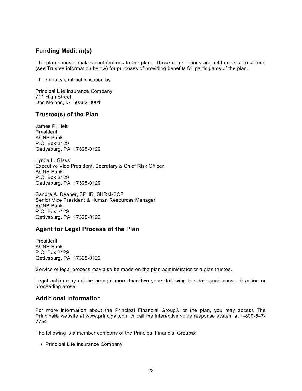 22 Funding Medium(s) The plan sponsor makes contributions to the plan. Those contributions are held under a trust fund (see Trustee information below) for purposes of providing benefits for participants of the plan. The annuity contract is issued by: Principal Life Insurance Company 711 High Street Des Moines, IA 50392-0001 Trustee(s) of the Plan James P. Helt President ACNB Bank P.O. Box 3129 Gettysburg, PA 17325-0129 Lynda L. Glass Executive Vice President, Secretary & Chief Risk Officer ACNB Bank P.O. Box 3129 Gettysburg, PA 17325-0129 Sandra A. Deaner, SPHR, SHRM-SCP Senior Vice President & Human Resources Manager ACNB Bank P.O. Box 3129 Gettysburg, PA 17325-0129 Agent for Legal Process of the Plan President ACNB Bank P.O. Box 3129 Gettysburg, PA 17325-0129 Service of legal process may also be made on the plan administrator or a plan trustee. Legal action may not be brought more than two years following the date such cause of action or proceeding arose. Additional Information For more information about the Principal Financial Group® or the plan, you may access The Principal® website at www.principal.com or call the interactive voice response system at 1-800-547- 7754. The following is a member company of the Principal Financial Group®: • Principal Life Insurance Company