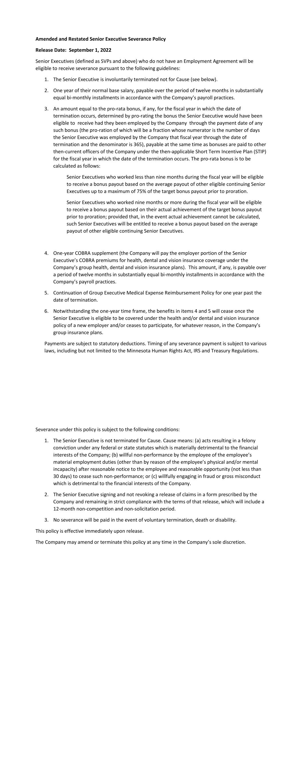 Amended and Restated Senior Executive Severance Policy Release Date: September 1, 2022 Senior Executives (defined as SVPs and above) who do not have an Employment Agreement will be eligible to receive severance pursuant to the following guidelines: 1. The Senior Executive is involuntarily terminated not for Cause (see below). 2. One year of their normal base salary, payable over the period of twelve months in substantially equal bi-monthly installments in accordance with the Company’s payroll practices. 3. An amount equal to the pro-rata bonus, if any, for the fiscal year in which the date of termination occurs, determined by pro-rating the bonus the Senior Executive would have been eligible to receive had they been employed by the Company through the payment date of any such bonus (the pro-ration of which will be a fraction whose numerator is the number of days the Senior Executive was employed by the Company that fiscal year through the date of termination and the denominator is 365), payable at the same time as bonuses are paid to other then-current officers of the Company under the then-applicable Short Term Incentive Plan (STIP) for the fiscal year in which the date of the termination occurs. The pro-rata bonus is to be calculated as follows: Senior Executives who worked less than nine months during the fiscal year will be eligible to receive a bonus payout based on the average payout of other eligible continuing Senior Executives up to a maximum of 75% of the target bonus payout prior to proration. Senior Executives who worked nine months or more during the fiscal year will be eligible to receive a bonus payout based on their actual achievement of the target bonus payout prior to proration; provided that, in the event actual achievement cannot be calculated, such Senior Executives will be entitled to receive a bonus payout based on the average payout of other eligible continuing Senior Executives. 4. One-year COBRA supplement (the Company will pay the employer portion of the Senior Executive’s COBRA premiums for health, dental and vision insurance coverage under the Company’s group health, dental and vision insurance plans). This amount, if any, is payable over a period of twelve months in substantially equal bi-monthly installments in accordance with the Company’s payroll practices. 5. Continuation of Group Executive Medical Expense Reimbursement Policy for one year past the date of termination. 6. Notwithstanding the one-year time frame, the benefits in items 4 and 5 will cease once the Senior Executive is eligible to be covered under the health and/or dental and vision insurance policy of a new employer and/or ceases to participate, for whatever reason, in the Company’s group insurance plans. Payments are subject to statutory deductions. Timing of any severance payment is subject to various laws, including but not limited to the Minnesota Human Rights Act, IRS and Treasury Regulations. Severance under this policy is subject to the following conditions: 1. The Senior Executive is not terminated for Cause. Cause means: (a) acts resulting in a felony conviction under any federal or state statutes which is materially detrimental to the financial interests of the Company; (b) willful non-performance by the employee of the employee’s material employment duties (other than by reason of the employee’s physical and/or mental incapacity) after reasonable notice to the employee and reasonable opportunity (not less than 30 days) to cease such non-performance; or (c) willfully engaging in fraud or gross misconduct which is detrimental to the financial interests of the Company. 2. The Senior Executive signing and not revoking a release of claims in a form prescribed by the Company and remaining in strict compliance with the terms of that release, which will include a 12-month non-competition and non-solicitation period. 3. No severance will be paid in the event of voluntary termination, death or disability. This policy is effective immediately upon release. The Company may amend or terminate this policy at any time in the Company’s sole discretion.