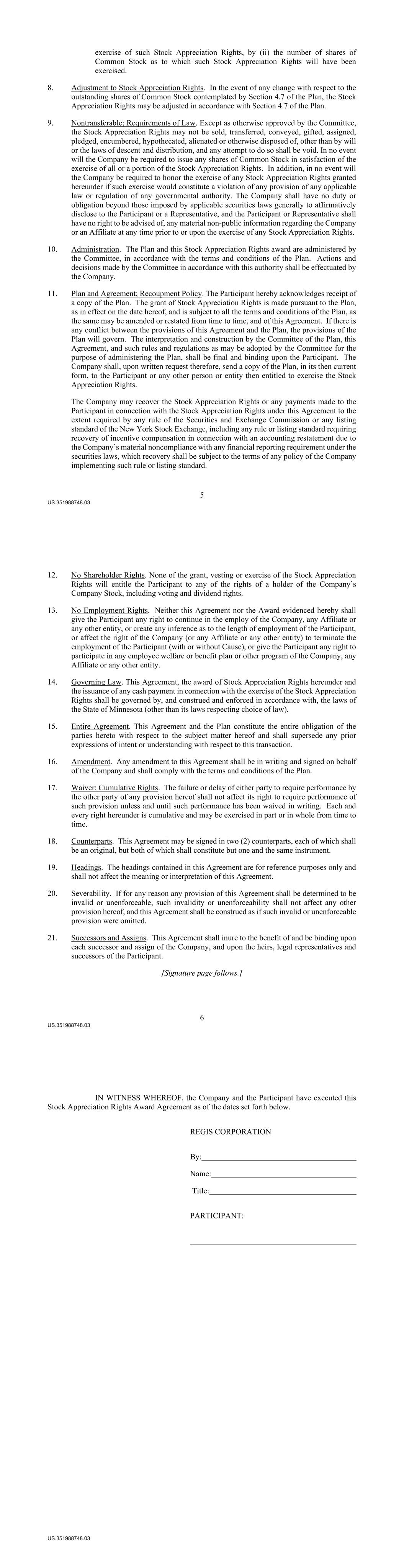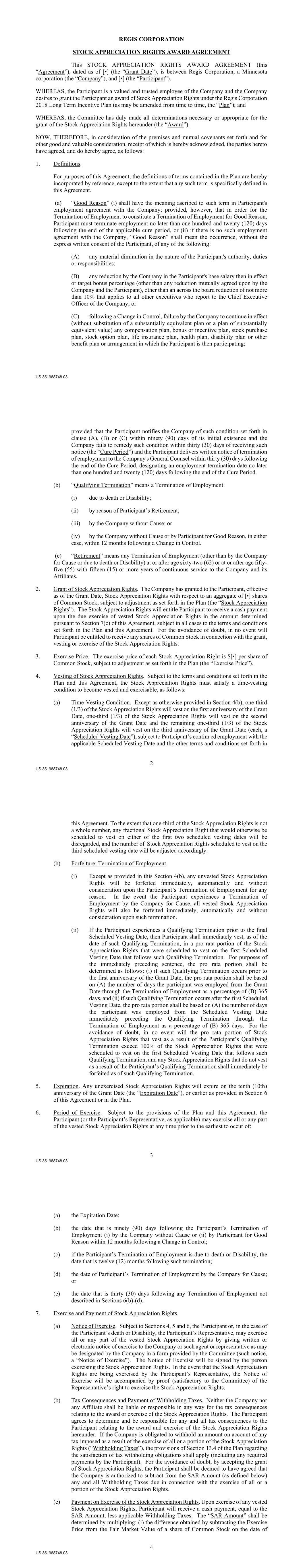 US.351988748.03 REGIS CORPORATION STOCK APPRECIATION RIGHTS AWARD AGREEMENT This STOCK APPRECIATION RIGHTS AWARD AGREEMENT (this “Agreement”), dated as of [•] (the “Grant Date”), is between Regis Corporation, a Minnesota corporation (the “Company”), and [•] (the “Participant”). WHEREAS, the Participant is a valued and trusted employee of the Company and the Company desires to grant the Participant an award of Stock Appreciation Rights under the Regis Corporation 2018 Long Term Incentive Plan (as may be amended from time to time, the “Plan”); and WHEREAS, the Committee has duly made all determinations necessary or appropriate for the grant of the Stock Appreciation Rights hereunder (the “Award”). NOW, THEREFORE, in consideration of the premises and mutual covenants set forth and for other good and valuable consideration, receipt of which is hereby acknowledged, the parties hereto have agreed, and do hereby agree, as follows: 1. Definitions. For purposes of this Agreement, the definitions of terms contained in the Plan are hereby incorporated by reference, except to the extent that any such term is specifically defined in this Agreement. (a) “Good Reason” (i) shall have the meaning ascribed to such term in Participant's employment agreement with the Company; provided, however, that in order for the Termination of Employment to constitute a Termination of Employment for Good Reason, Participant must terminate employment no later than one hundred and twenty (120) days following the end of the applicable cure period, or (ii) if there is no such employment agreement with the Company, “Good Reason” shall mean the occurrence, without the express written consent of the Participant, of any of the following: (A) any material diminution in the nature of the Participant's authority, duties or responsibilities; (B) any reduction by the Company in the Participant's base salary then in effect or target bonus percentage (other than any reduction mutually agreed upon by the Company and the Participant), other than an across the board reduction of not more than 10% that applies to all other executives who report to the Chief Executive Officer of the Company; or (C) following a Change in Control, failure by the Company to continue in effect (without substitution of a substantially equivalent plan or a plan of substantially equivalent value) any compensation plan, bonus or incentive plan, stock purchase plan, stock option plan, life insurance plan, health plan, disability plan or other benefit plan or arrangement in which the Participant is then participating; US.351988748.03 2 provided that the Participant notifies the Company of such condition set forth in clause (A), (B) or (C) within ninety (90) days of its initial existence and the Company fails to remedy such condition within thirty (30) days of receiving such notice (the “Cure Period”) and the Participant delivers written notice of termination of employment to the Company's General Counsel within thirty (30) days following the end of the Cure Period, designating an employment termination date no later than one hundred and twenty (120) days following the end of the Cure Period. (b) “Qualifying Termination” means a Termination of Employment: (i) due to death or Disability; (ii) by reason of Participant’s Retirement; (iii) by the Company without Cause; or (iv) by the Company without Cause or by Participant for Good Reason, in either case, within 12 months following a Change in Control. (c) “Retirement” means any Termination of Employment (other than by the Company for Cause or due to death or Disability) at or after age sixty-two (62) or at or after age fifty- five (55) with fifteen (15) or more years of continuous service to the Company and its Affiliates. 2. Grant of Stock Appreciation Rights. The Company has granted to the Participant, effective as of the Grant Date, Stock Appreciation Rights with respect to an aggregate of [•] shares of Common Stock, subject to adjustment as set forth in the Plan (the “Stock Appreciation Rights”). The Stock Appreciation Rights will entitle Participant to receive a cash payment upon the due exercise of vested Stock Appreciation Rights in the amount determined pursuant to Section 7(c) of this Agreement, subject in all cases to the terms and conditions set forth in the Plan and this Agreement. For the avoidance of doubt, in no event will Participant be entitled to receive any shares of Common Stock in connection with the grant, vesting or exercise of the Stock Appreciation Rights. 3. Exercise Price. The exercise price of each Stock Appreciation Right is $[•] per share of Common Stock, subject to adjustment as set forth in the Plan (the “Exercise Price”). 4. Vesting of Stock Appreciation Rights. Subject to the terms and conditions set forth in the Plan and this Agreement, the Stock Appreciation Rights must satisfy a time-vesting condition to become vested and exercisable, as follows: (a) Time-Vesting Condition. Except as otherwise provided in Section 4(b), one-third (1/3) of the Stock Appreciation Rights will vest on the first anniversary of the Grant Date, one-third (1/3) of the Stock Appreciation Rights will vest on the second anniversary of the Grant Date and the remaining one-third (1/3) of the Stock Appreciation Rights will vest on the third anniversary of the Grant Date (each, a “Scheduled Vesting Date”), subject to Participant’s continued employment with the applicable Scheduled Vesting Date and the other terms and conditions set forth in US.351988748.03 3 this Agreement. To the extent that one-third of the Stock Appreciation Rights is not a whole number, any fractional Stock Appreciation Right that would otherwise be scheduled to vest on either of the first two scheduled vesting dates will be disregarded, and the number of Stock Appreciation Rights scheduled to vest on the third scheduled vesting date will be adjusted accordingly. (b) Forfeiture;