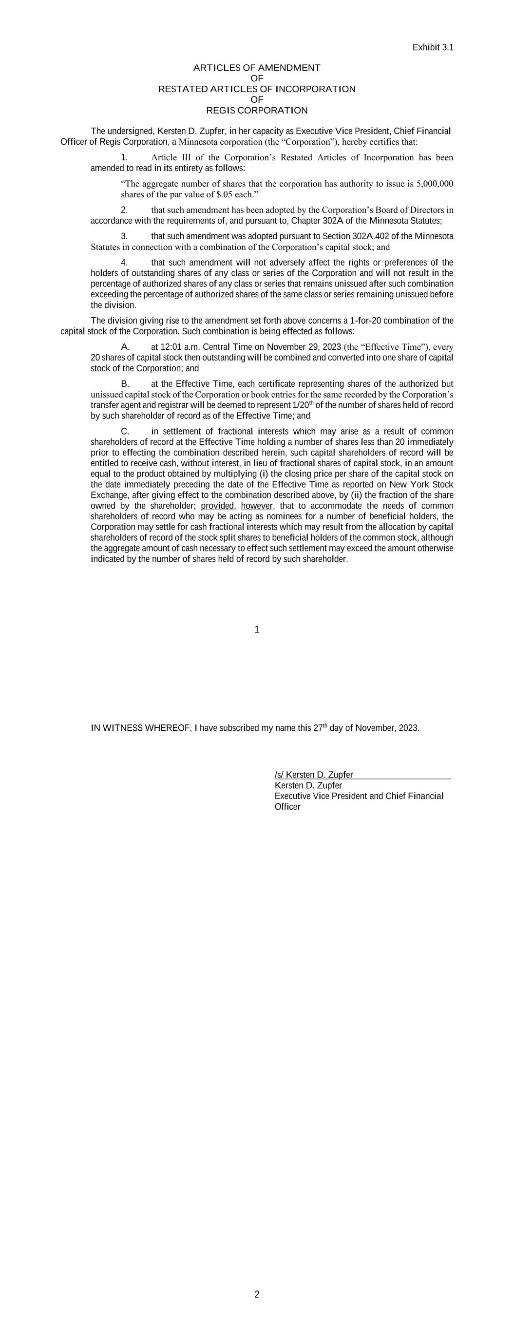 1 Exhibit 3.1 ARTICLES OF AMENDMENT OF RESTATED ARTICLES OF INCORPORATION OF REGIS CORPORATION The undersigned, Kersten D. Zupfer, in her capacity as Executive Vice President, Chief Financial Officer of Regis Corporation, a Minnesota corporation (the “Corporation”), hereby certifies that: 1. Article III of the Corporation’s Restated Articles of Incorporation has been amended to read in its entirety as follows: “The aggregate number of shares that the corporation has authority to issue is 5,000,000 shares of the par value of $.05 each.” 2. that such amendment has been adopted by the Corporation’s Board of Directors in accordance with the requirements of, and pursuant to, Chapter 302A of the Minnesota Statutes; 3. that such amendment was adopted pursuant to Section 302A.402 of the Minnesota Statutes in connection with a combination of the Corporation’s capital stock; and 4. that such amendment will not adversely affect the rights or preferences of the holders of outstanding shares of any class or series of the Corporation and will not result in the percentage of authorized shares of any class or series that remains unissued after such combination exceeding the percentage of authorized shares of the same class or series remaining unissued before the division. The division giving rise to the amendment set forth above concerns a 1-for-20 combination of the capital stock of the Corporation. Such combination is being effected as follows: A. at 12:01 a.m. Central Time on November 29, 2023 (the “Effective Time”), every 20 shares of capital stock then outstanding will be combined and converted into one share of capital stock of the Corporation; and B. at the Effective Time, each certificate representing shares of the authorized but unissued capital stock of the Corporation or book entries for the same recorded by the Corporation’s transfer agent and registrar will be deemed to represent 1/20th of the number of shares held of record by such shareholder of record as of the Effective Time; and C. in settlement of fractional interests which may arise as a result of common shareholders of record at the Effective Time holding a number of shares less than 20 immediately prior to effecting the combination described herein, such capital shareholders of record will be entitled to receive cash, without interest, in lieu of fractional shares of capital stock, in an amount equal to the product obtained by multiplying (i) the closing price per share of the capital stock on the date immediately preceding the date of the Effective Time as reported on New York Stock Exchange, after giving effect to the combination described above, by (ii) the fraction of the share owned by the shareholder; provided, however, that to accommodate the needs of common shareholders of record who may be acting as nominees for a number of beneficial holders, the Corporation may settle for cash fractional interests which may result from the allocation by capital shareholders of record of the stock split shares to beneficial holders of the common stock, although the aggregate amount of cash necessary to effect such settlement may exceed the amount otherwise indicated by the number of shares held of record by such shareholder. 2 IN WITNESS WHEREOF, I have subscribed my name this 27th day of November, 2023. /s/ Kersten D. Zupfer Kersten D. Zupfer Executive Vice President and Chief Financial Officer