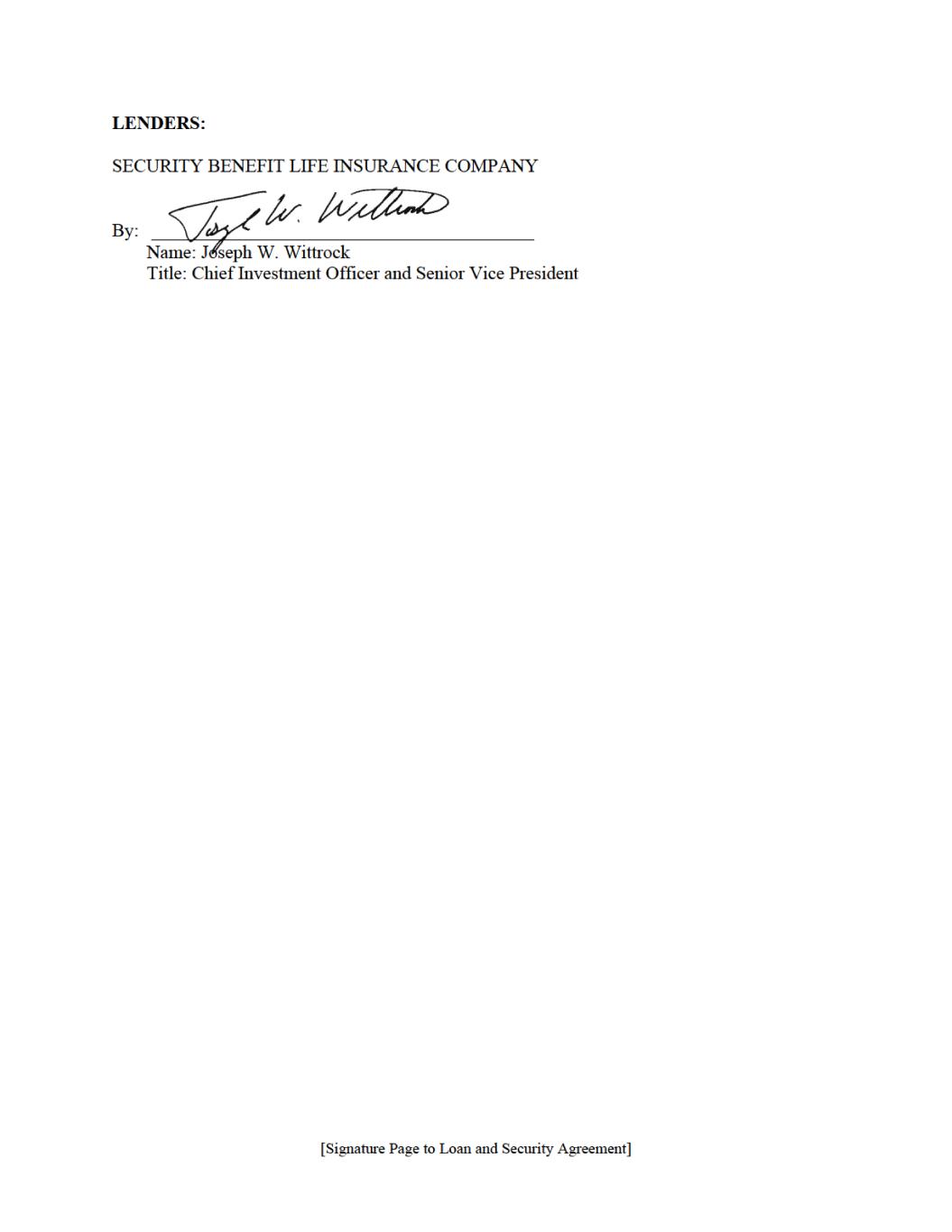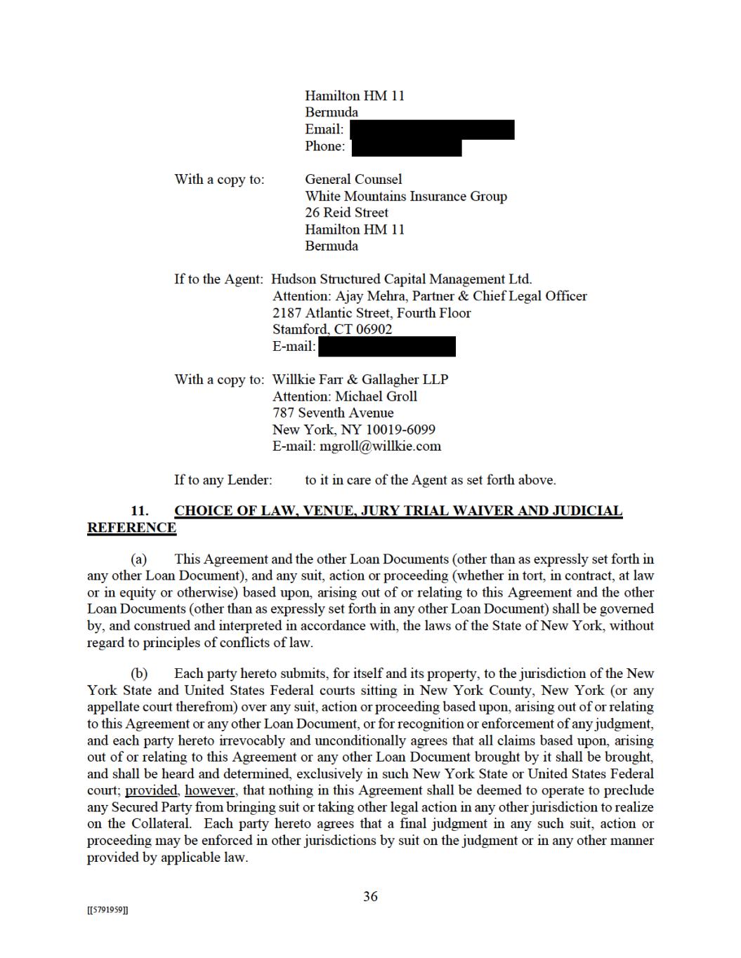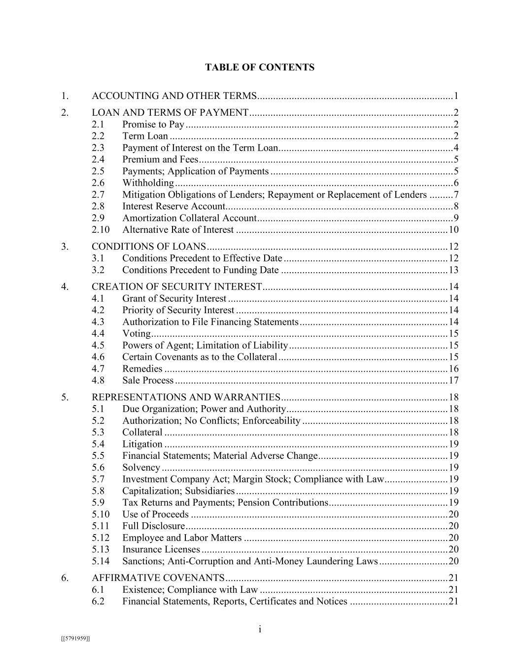 i [[5791959]] TABLE OF CONTENTS 1. ACCOUNTING AND OTHER TERMS .......................................................................... 1 2. LOAN AND TERMS OF PAYMENT ............................................................................. 2 2.1 Promise to Pay ..................................................................................................... 2 2.2 Term Loan ........................................................................................................... 2 2.3 Payment of Interest on the Term Loan .................................................................. 4 2.4 Premium and Fees ................................................................................................ 5 2.5 Payments; Application of Payments ..................................................................... 5 2.6 Withholding ......................................................................................................... 6 2.7 Mitigation Obligations of Lenders; Repayment or Replacement of Lenders ......... 7 2.8 Interest Reserve Account...................................................................................... 8 2.9 Amortization Collateral Account .......................................................................... 9 2.10 Alternative Rate of Interest ................................................................................ 10 3. CONDITIONS OF LOANS ........................................................................................... 12 3.1 Conditions Precedent to Effective Date .............................................................. 12 3.2 Conditions Precedent to Funding Date ............................................................... 13 4. CREATION OF SECURITY INTEREST ...................................................................... 14 4.1 Grant of Security Interest ................................................................................... 14 4.2 Priority of Security Interest ................................................................................ 14 4.3 Authorization to File Financing Statements ........................................................ 14 4.4 Voting ................................................................................................................ 15 4.5 Powers of Agent; Limitation of Liability ............................................................ 15 4.6 Certain Covenants as to the Collateral ................................................................ 15 4.7 Remedies ........................................................................................................... 16 4.8 Sale Process ....................................................................................................... 17 5. REPRESENTATIONS AND WARRANTIES ............................................................... 18 5.1 Due Organization; Power and Authority ............................................................. 18 5.2 Authorization; No Conflicts; Enforceability ....................................................... 18 5.3 Collateral ........................................................................................................... 18 5.4 Litigation ........................................................................................................... 19 5.5 Financial Statements; Material Adverse Change ................................................. 19 5.6 Solvency ............................................................................................................ 19 5.7 Investment Company Act; Margin Stock; Compliance with Law ........................ 19 5.8 Capitalization; Subsidiaries ................................................................................ 19 5.9 Tax Returns and Payments; Pension Contributions ............................................. 19 5.10 Use of Proceeds ................................................................................................. 20 5.11 Full Disclosure ................................................................................................... 20 5.12 Employee and Labor Matters ............................................................................. 20 5.13 Insurance Licenses ............................................................................................. 20 5.14 Sanctions; Anti-Corruption and Anti-Money Laundering Laws .......................... 20 6. AFFIRMATIVE COVENANTS .................................................................................... 21 6.1 Existence; Compliance with Law ....................................................................... 21 6.2 Financial Statements, Reports, Certificates and Notices ..................................... 21