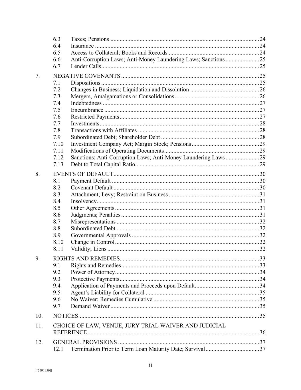 ii [[5791959]] 6.3 Taxes; Pensions ................................................................................................. 24 6.4 Insurance ........................................................................................................... 24 6.5 Access to Collateral; Books and Records ........................................................... 24 6.6 Anti-Corruption Laws; Anti-Money Laundering Laws; Sanctions ...................... 25 6.7 Lender Calls ....................................................................................................... 25 7. NEGATIVE COVENANTS .......................................................................................... 25 7.1 Dispositions ....................................................................................................... 25 7.2 Changes in Business; Liquidation and Dissolution ............................................. 26 7.3 Mergers, Amalgamations or Consolidations ....................................................... 26 7.4 Indebtedness ...................................................................................................... 27 7.5 Encumbrance ..................................................................................................... 27 7.6 Restricted Payments ........................................................................................... 27 7.7 Investments ........................................................................................................ 28 7.8 Transactions with Affiliates ............................................................................... 28 7.9 Subordinated Debt; Shareholder Debt ................................................................ 28 7.10 Investment Company Act; Margin Stock; Pensions ............................................ 29 7.11 Modifications of Operating Documents .............................................................. 29 7.12 Sanctions; Anti-Corruption Laws; Anti-Money Laundering Laws ...................... 29 7.13 Debt to Total Capital Ratio................................................................................. 29 8. EVENTS OF DEFAULT ............................................................................................... 30 8.1 Payment Default ................................................................................................ 30 8.2 Covenant Default ............................................................................................... 30 8.3 Attachment; Levy; Restraint on Business ........................................................... 31 8.4 Insolvency.......................................................................................................... 31 8.5 Other Agreements .............................................................................................. 31 8.6 Judgments; Penalties .......................................................................................... 31 8.7 Misrepresentations ............................................................................................. 32 8.8 Subordinated Debt ............................................................................................. 32 8.9 Governmental Approvals ................................................................................... 32 8.10 Change in Control .............................................................................................. 32 8.11 Validity; Liens ................................................................................................... 32 9. RIGHTS AND REMEDIES........................................................................................... 33 9.1 Rights and Remedies .......................................................................................... 33 9.2 Power of Attorney .............................................................................................. 34 9.3 Protective Payments ........................................................................................... 34 9.4 Application of Payments and Proceeds upon Default .......................................... 34 9.5 Agent’s Liability for Collateral .......................................................................... 35 9.6 No Waiver; Remedies Cumulative ..................................................................... 35 9.7 Demand Waiver ................................................................................................. 35 10. NOTICES ...................................................................................................................... 35 11. CHOICE OF LAW, VENUE, JURY TRIAL WAIVER AND JUDICIAL REFERENCE ................................................................................................................ 36 12. GENERAL PROVISIONS ............................................................................................ 37 12.1 Termination Prior to Term Loan Maturity Date; Survival ................................... 37