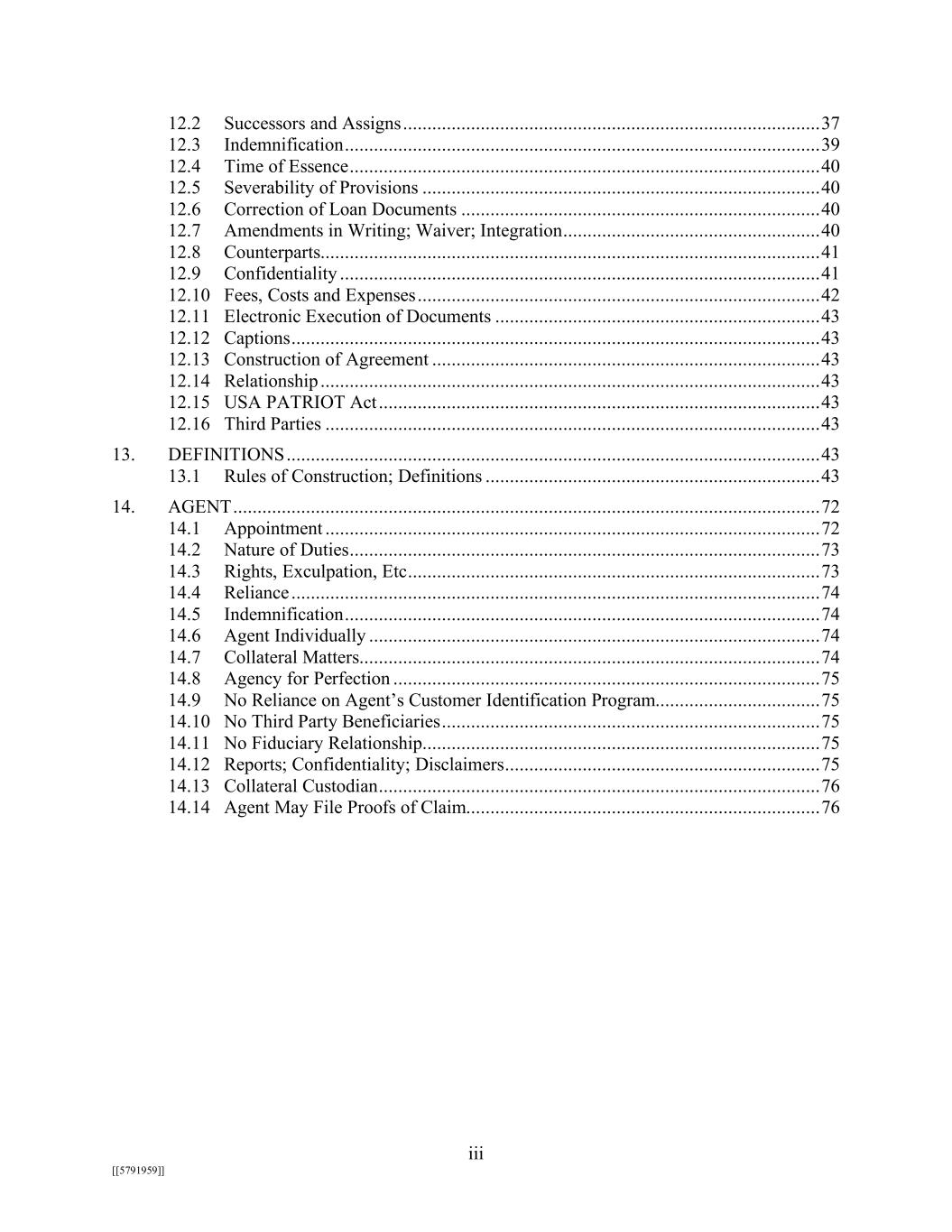 iii [[5791959]] 12.2 Successors and Assigns ...................................................................................... 37 12.3 Indemnification .................................................................................................. 39 12.4 Time of Essence ................................................................................................. 40 12.5 Severability of Provisions .................................................................................. 40 12.6 Correction of Loan Documents .......................................................................... 40 12.7 Amendments in Writing; Waiver; Integration ..................................................... 40 12.8 Counterparts....................................................................................................... 41 12.9 Confidentiality ................................................................................................... 41 12.10 Fees, Costs and Expenses ................................................................................... 42 12.11 Electronic Execution of Documents ................................................................... 43 12.12 Captions ............................................................................................................. 43 12.13 Construction of Agreement ................................................................................ 43 12.14 Relationship ....................................................................................................... 43 12.15 USA PATRIOT Act ........................................................................................... 43 12.16 Third Parties ...................................................................................................... 43 13. DEFINITIONS .............................................................................................................. 43 13.1 Rules of Construction; Definitions ..................................................................... 43 14. AGENT ......................................................................................................................... 72 14.1 Appointment ...................................................................................................... 72 14.2 Nature of Duties ................................................................................................. 73 14.3 Rights, Exculpation, Etc ..................................................................................... 73 14.4 Reliance ............................................................................................................. 74 14.5 Indemnification .................................................................................................. 74 14.6 Agent Individually ............................................................................................. 74 14.7 Collateral Matters............................................................................................... 74 14.8 Agency for Perfection ........................................................................................ 75 14.9 No Reliance on Agent’s Customer Identification Program.................................. 75 14.10 No Third Party Beneficiaries .............................................................................. 75 14.11 No Fiduciary Relationship .................................................................................. 75 14.12 Reports; Confidentiality; Disclaimers ................................................................. 75 14.13 Collateral Custodian ........................................................................................... 76 14.14 Agent May File Proofs of Claim......................................................................... 76