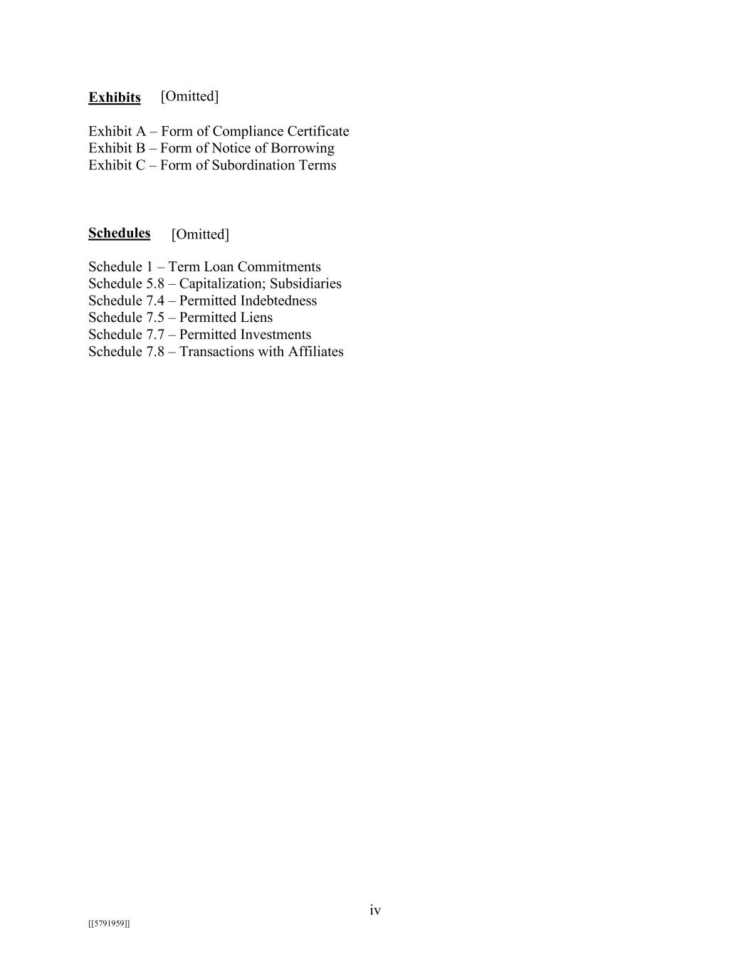 iv [[5791959]] Exhibits Exhibit A – Form of Compliance Certificate Exhibit B – Form of Notice of Borrowing Exhibit C – Form of Subordination Terms Schedules Schedule 1 – Term Loan Commitments Schedule 5.8 – Capitalization; Subsidiaries Schedule 7.4 – Permitted Indebtedness Schedule 7.5 – Permitted Liens Schedule 7.7 – Permitted Investments Schedule 7.8 – Transactions with Affiliates [Omitted] [Omitted]