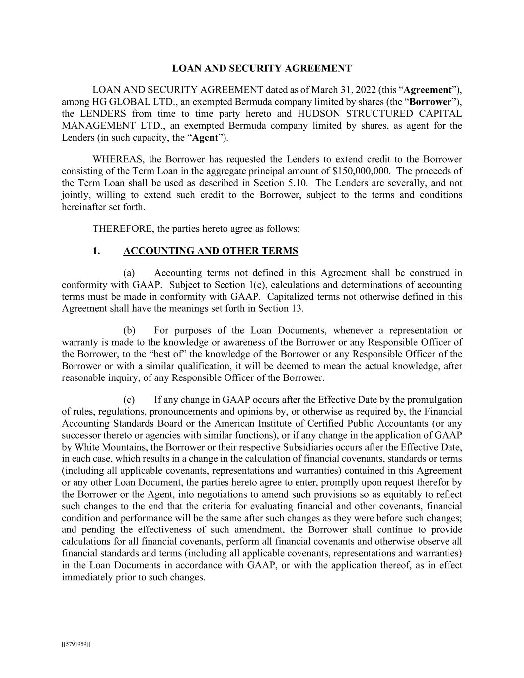 [[5791959]] LOAN AND SECURITY AGREEMENT LOAN AND SECURITY AGREEMENT dated as of March 31, 2022 (this “Agreement”), among HG GLOBAL LTD., an exempted Bermuda company limited by shares (the “Borrower”), the LENDERS from time to time party hereto and HUDSON STRUCTURED CAPITAL MANAGEMENT LTD., an exempted Bermuda company limited by shares, as agent for the Lenders (in such capacity, the “Agent”). WHEREAS, the Borrower has requested the Lenders to extend credit to the Borrower consisting of the Term Loan in the aggregate principal amount of $150,000,000. The proceeds of the Term Loan shall be used as described in Section 5.10. The Lenders are severally, and not jointly, willing to extend such credit to the Borrower, subject to the terms and conditions hereinafter set forth. THEREFORE, the parties hereto agree as follows: 1. ACCOUNTING AND OTHER TERMS (a) Accounting terms not defined in this Agreement shall be construed in conformity with GAAP. Subject to Section 1(c), calculations and determinations of accounting terms must be made in conformity with GAAP. Capitalized terms not otherwise defined in this Agreement shall have the meanings set forth in Section 13. (b) For purposes of the Loan Documents, whenever a representation or warranty is made to the knowledge or awareness of the Borrower or any Responsible Officer of the Borrower, to the “best of” the knowledge of the Borrower or any Responsible Officer of the Borrower or with a similar qualification, it will be deemed to mean the actual knowledge, after reasonable inquiry, of any Responsible Officer of the Borrower. (c) If any change in GAAP occurs after the Effective Date by the promulgation of rules, regulations, pronouncements and opinions by, or otherwise as required by, the Financial Accounting Standards Board or the American Institute of Certified Public Accountants (or any successor thereto or agencies with similar functions), or if any change in the application of GAAP by White Mountains, the Borrower or their respective Subsidiaries occurs after the Effective Date, in each case, which results in a change in the calculation of financial covenants, standards or terms (including all applicable covenants, representations and warranties) contained in this Agreement or any other Loan Document, the parties hereto agree to enter, promptly upon request therefor by the Borrower or the Agent, into negotiations to amend such provisions so as equitably to reflect such changes to the end that the criteria for evaluating financial and other covenants, financial condition and performance will be the same after such changes as they were before such changes; and pending the effectiveness of such amendment, the Borrower shall continue to provide calculations for all financial covenants, perform all financial covenants and otherwise observe all financial standards and terms (including all applicable covenants, representations and warranties) in the Loan Documents in accordance with GAAP, or with the application thereof, as in effect immediately prior to such changes.