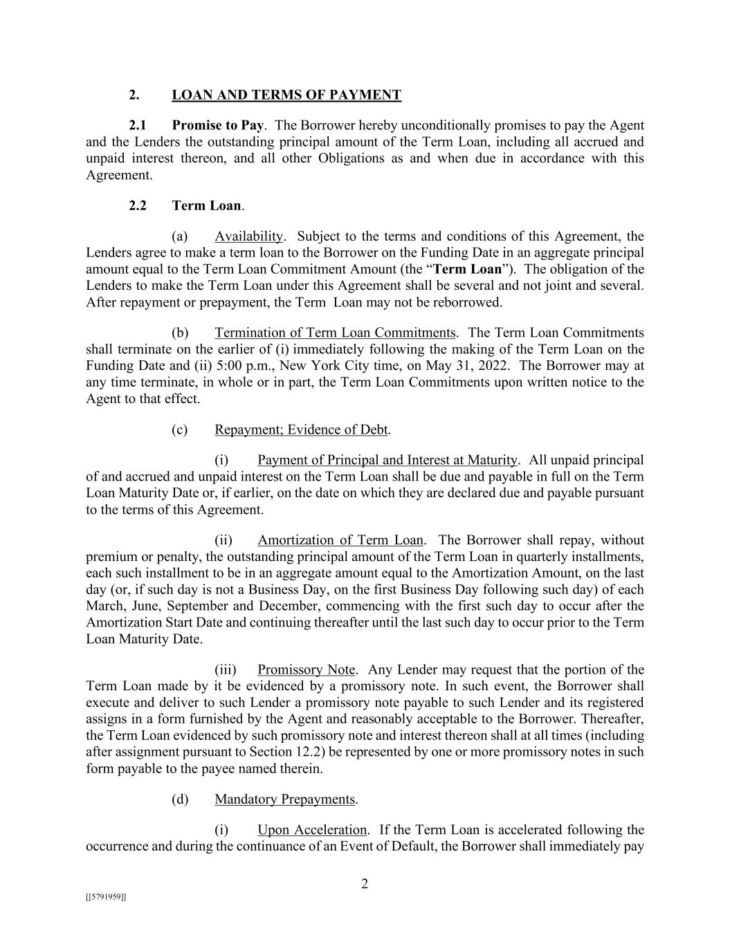 2 [[5791959]] 2. LOAN AND TERMS OF PAYMENT 2.1 Promise to Pay. The Borrower hereby unconditionally promises to pay the Agent and the Lenders the outstanding principal amount of the Term Loan, including all accrued and unpaid interest thereon, and all other Obligations as and when due in accordance with this Agreement. 2.2 Term Loan. (a) Availability. Subject to the terms and conditions of this Agreement, the Lenders agree to make a term loan to the Borrower on the Funding Date in an aggregate principal amount equal to the Term Loan Commitment Amount (the “Term Loan”). The obligation of the Lenders to make the Term Loan under this Agreement shall be several and not joint and several. After repayment or prepayment, the Term Loan may not be reborrowed. (b) Termination of Term Loan Commitments. The Term Loan Commitments shall terminate on the earlier of (i) immediately following the making of the Term Loan on the Funding Date and (ii) 5:00 p.m., New York City time, on May 31, 2022. The Borrower may at any time terminate, in whole or in part, the Term Loan Commitments upon written notice to the Agent to that effect. (c) Repayment; Evidence of Debt. (i) Payment of Principal and Interest at Maturity. All unpaid principal of and accrued and unpaid interest on the Term Loan shall be due and payable in full on the Term Loan Maturity Date or, if earlier, on the date on which they are declared due and payable pursuant to the terms of this Agreement. (ii) Amortization of Term Loan. The Borrower shall repay, without premium or penalty, the outstanding principal amount of the Term Loan in quarterly installments, each such installment to be in an aggregate amount equal to the Amortization Amount, on the last day (or, if such day is not a Business Day, on the first Business Day following such day) of each March, June, September and December, commencing with the first such day to occur after the Amortization Start Date and continuing thereafter until the last such day to occur prior to the Term Loan Maturity Date. (iii) Promissory Note. Any Lender may request that the portion of the Term Loan made by it be evidenced by a promissory note. In such event, the Borrower shall execute and deliver to such Lender a promissory note payable to such Lender and its registered assigns in a form furnished by the Agent and reasonably acceptable to the Borrower. Thereafter, the Term Loan evidenced by such promissory note and interest thereon shall at all times (including after assignment pursuant to Section 12.2) be represented by one or more promissory notes in such form payable to the payee named therein. (d) Mandatory Prepayments. (i) Upon Acceleration. If the Term Loan is accelerated following the occurrence and during the continuance of an Event of Default, the Borrower shall immediately pay