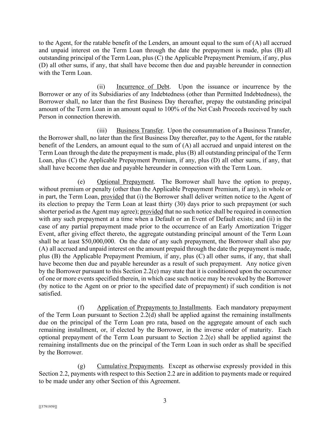 3 [[5791959]] to the Agent, for the ratable benefit of the Lenders, an amount equal to the sum of (A) all accrued and unpaid interest on the Term Loan through the date the prepayment is made, plus (B) all outstanding principal of the Term Loan, plus (C) the Applicable Prepayment Premium, if any, plus (D) all other sums, if any, that shall have become then due and payable hereunder in connection with the Term Loan. (ii) Incurrence of Debt. Upon the issuance or incurrence by the Borrower or any of its Subsidiaries of any Indebtedness (other than Permitted Indebtedness), the Borrower shall, no later than the first Business Day thereafter, prepay the outstanding principal amount of the Term Loan in an amount equal to 100% of the Net Cash Proceeds received by such Person in connection therewith. (iii) Business Transfer. Upon the consummation of a Business Transfer, the Borrower shall, no later than the first Business Day thereafter, pay to the Agent, for the ratable benefit of the Lenders, an amount equal to the sum of (A) all accrued and unpaid interest on the Term Loan through the date the prepayment is made, plus (B) all outstanding principal of the Term Loan, plus (C) the Applicable Prepayment Premium, if any, plus (D) all other sums, if any, that shall have become then due and payable hereunder in connection with the Term Loan. (e) Optional Prepayment. The Borrower shall have the option to prepay, without premium or penalty (other than the Applicable Prepayment Premium, if any), in whole or in part, the Term Loan, provided that (i) the Borrower shall deliver written notice to the Agent of its election to prepay the Term Loan at least thirty (30) days prior to such prepayment (or such shorter period as the Agent may agree); provided that no such notice shall be required in connection with any such prepayment at a time when a Default or an Event of Default exists; and (ii) in the case of any partial prepayment made prior to the occurrence of an Early Amortization Trigger Event, after giving effect thereto, the aggregate outstanding principal amount of the Term Loan shall be at least $50,000,000. On the date of any such prepayment, the Borrower shall also pay (A) all accrued and unpaid interest on the amount prepaid through the date the prepayment is made, plus (B) the Applicable Prepayment Premium, if any, plus (C) all other sums, if any, that shall have become then due and payable hereunder as a result of such prepayment. Any notice given by the Borrower pursuant to this Section 2.2(e) may state that it is conditioned upon the occurrence of one or more events specified therein, in which case such notice may be revoked by the Borrower (by notice to the Agent on or prior to the specified date of prepayment) if such condition is not satisfied. (f) Application of Prepayments to Installments. Each mandatory prepayment of the Term Loan pursuant to Section 2.2(d) shall be applied against the remaining installments due on the principal of the Term Loan pro rata, based on the aggregate amount of each such remaining installment, or, if elected by the Borrower, in the inverse order of maturity. Each optional prepayment of the Term Loan pursuant to Section 2.2(e) shall be applied against the remaining installments due on the principal of the Term Loan in such order as shall be specified by the Borrower. (g) Cumulative Prepayments. Except as otherwise expressly provided in this Section 2.2, payments with respect to this Section 2.2 are in addition to payments made or required to be made under any other Section of this Agreement.