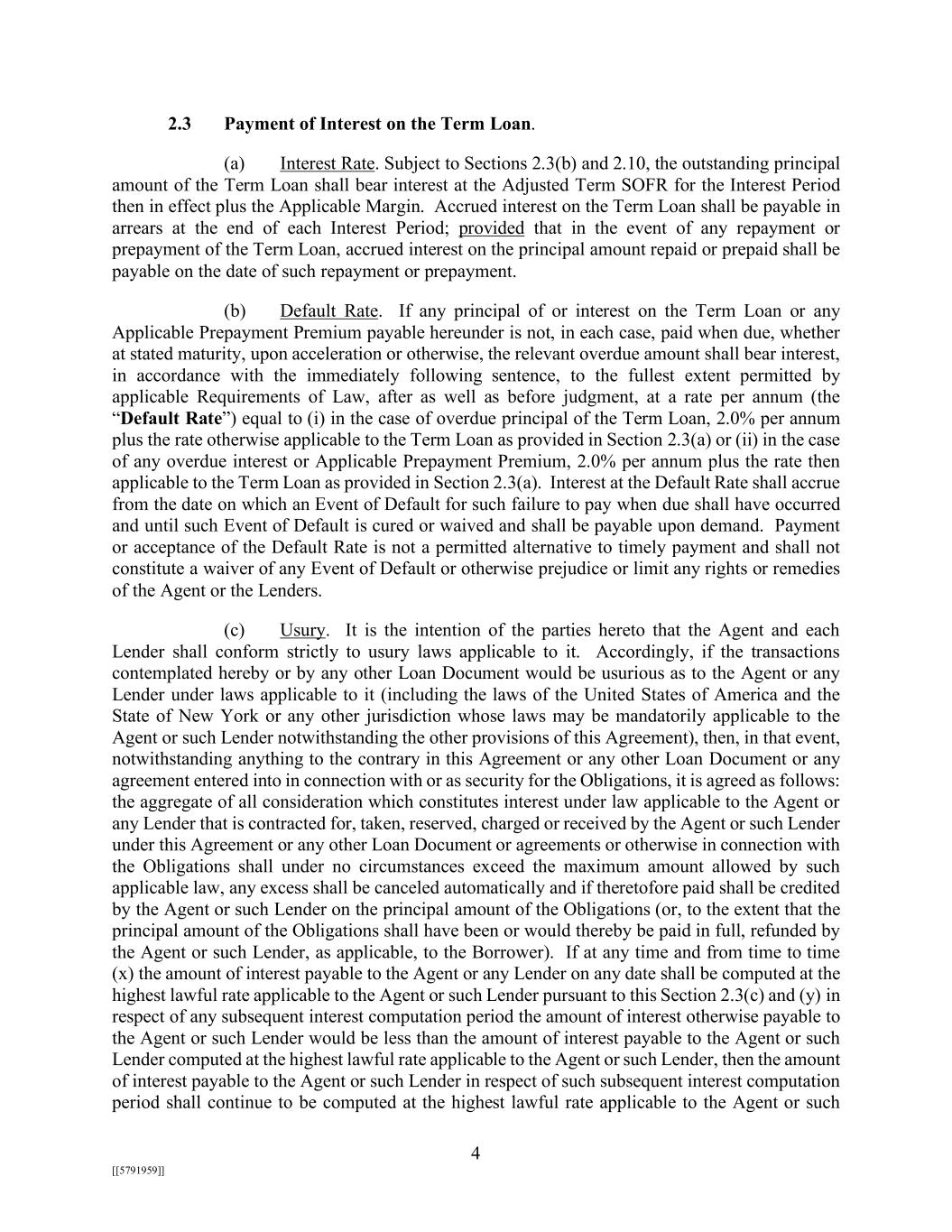 4 [[5791959]] 2.3 Payment of Interest on the Term Loan. (a) Interest Rate. Subject to Sections 2.3(b) and 2.10, the outstanding principal amount of the Term Loan shall bear interest at the Adjusted Term SOFR for the Interest Period then in effect plus the Applicable Margin. Accrued interest on the Term Loan shall be payable in arrears at the end of each Interest Period; provided that in the event of any repayment or prepayment of the Term Loan, accrued interest on the principal amount repaid or prepaid shall be payable on the date of such repayment or prepayment. (b) Default Rate. If any principal of or interest on the Term Loan or any Applicable Prepayment Premium payable hereunder is not, in each case, paid when due, whether at stated maturity, upon acceleration or otherwise, the relevant overdue amount shall bear interest, in accordance with the immediately following sentence, to the fullest extent permitted by applicable Requirements of Law, after as well as before judgment, at a rate per annum (the “Default Rate”) equal to (i) in the case of overdue principal of the Term Loan, 2.0% per annum plus the rate otherwise applicable to the Term Loan as provided in Section 2.3(a) or (ii) in the case of any overdue interest or Applicable Prepayment Premium, 2.0% per annum plus the rate then applicable to the Term Loan as provided in Section 2.3(a). Interest at the Default Rate shall accrue from the date on which an Event of Default for such failure to pay when due shall have occurred and until such Event of Default is cured or waived and shall be payable upon demand. Payment or acceptance of the Default Rate is not a permitted alternative to timely payment and shall not constitute a waiver of any Event of Default or otherwise prejudice or limit any rights or remedies of the Agent or the Lenders. (c) Usury. It is the intention of the parties hereto that the Agent and each Lender shall conform strictly to usury laws applicable to it. Accordingly, if the transactions contemplated hereby or by any other Loan Document would be usurious as to the Agent or any Lender under laws applicable to it (including the laws of the United States of America and the State of New York or any other jurisdiction whose laws may be mandatorily applicable to the Agent or such Lender notwithstanding the other provisions of this Agreement), then, in that event, notwithstanding anything to the contrary in this Agreement or any other Loan Document or any agreement entered into in connection with or as security for the Obligations, it is agreed as follows: the aggregate of all consideration which constitutes interest under law applicable to the Agent or any Lender that is contracted for, taken, reserved, charged or received by the Agent or such Lender under this Agreement or any other Loan Document or agreements or otherwise in connection with the Obligations shall under no circumstances exceed the maximum amount allowed by such applicable law, any excess shall be canceled automatically and if theretofore paid shall be credited by the Agent or such Lender on the principal amount of the Obligations (or, to the extent that the principal amount of the Obligations shall have been or would thereby be paid in full, refunded by the Agent or such Lender, as applicable, to the Borrower). If at any time and from time to time (x) the amount of interest payable to the Agent or any Lender on any date shall be computed at the highest lawful rate applicable to the Agent or such Lender pursuant to this Section 2.3(c) and (y) in respect of any subsequent interest computation period the amount of interest otherwise payable to the Agent or such Lender would be less than the amount of interest payable to the Agent or such Lender computed at the highest lawful rate applicable to the Agent or such Lender, then the amount of interest payable to the Agent or such Lender in respect of such subsequent interest computation period shall continue to be computed at the highest lawful rate applicable to the Agent or such