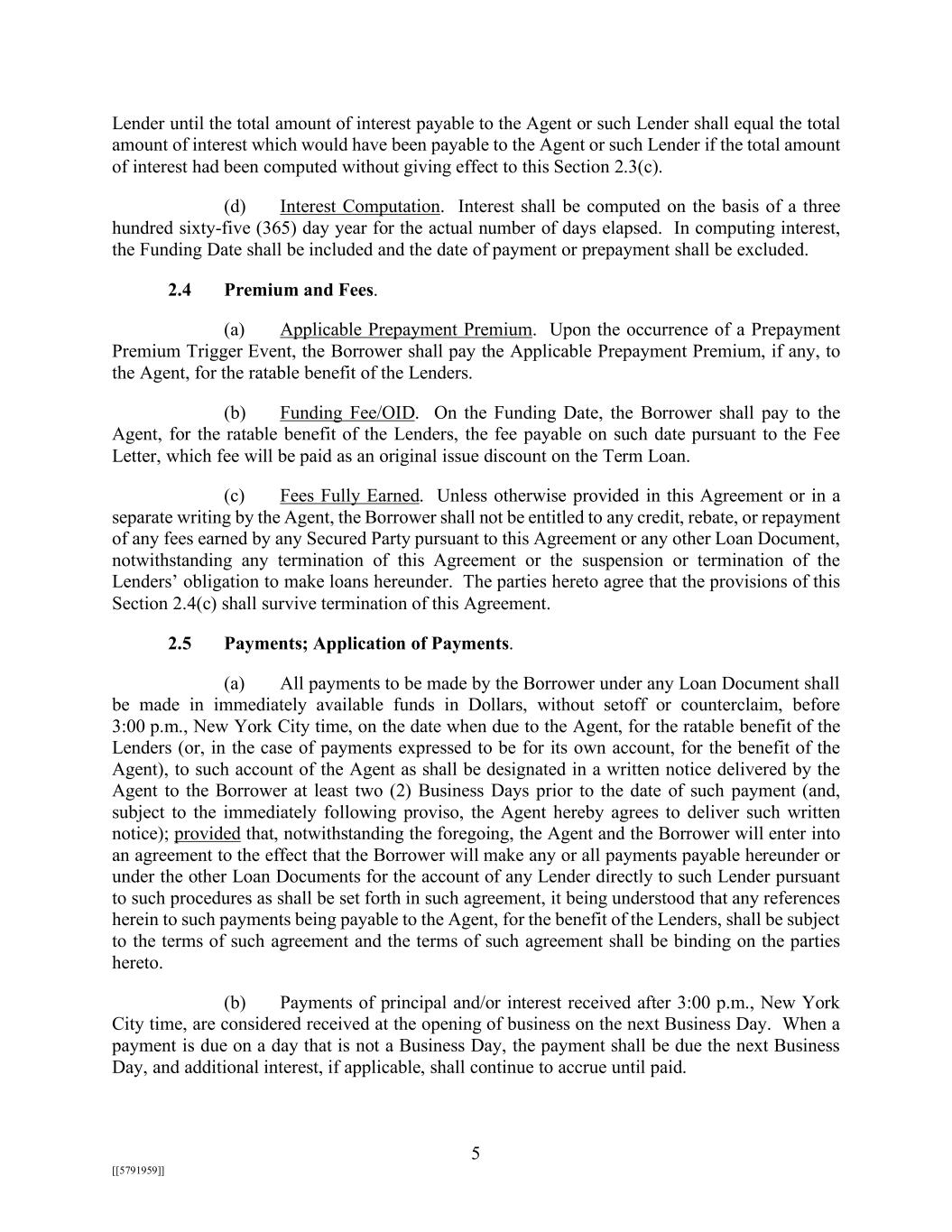 5 [[5791959]] Lender until the total amount of interest payable to the Agent or such Lender shall equal the total amount of interest which would have been payable to the Agent or such Lender if the total amount of interest had been computed without giving effect to this Section 2.3(c). (d) Interest Computation. Interest shall be computed on the basis of a three hundred sixty-five (365) day year for the actual number of days elapsed. In computing interest, the Funding Date shall be included and the date of payment or prepayment shall be excluded. 2.4 Premium and Fees. (a) Applicable Prepayment Premium. Upon the occurrence of a Prepayment Premium Trigger Event, the Borrower shall pay the Applicable Prepayment Premium, if any, to the Agent, for the ratable benefit of the Lenders. (b) Funding Fee/OID. On the Funding Date, the Borrower shall pay to the Agent, for the ratable benefit of the Lenders, the fee payable on such date pursuant to the Fee Letter, which fee will be paid as an original issue discount on the Term Loan. (c) Fees Fully Earned. Unless otherwise provided in this Agreement or in a separate writing by the Agent, the Borrower shall not be entitled to any credit, rebate, or repayment of any fees earned by any Secured Party pursuant to this Agreement or any other Loan Document, notwithstanding any termination of this Agreement or the suspension or termination of the Lenders’ obligation to make loans hereunder. The parties hereto agree that the provisions of this Section 2.4(c) shall survive termination of this Agreement. 2.5 Payments; Application of Payments. (a) All payments to be made by the Borrower under any Loan Document shall be made in immediately available funds in Dollars, without setoff or counterclaim, before 3:00 p.m., New York City time, on the date when due to the Agent, for the ratable benefit of the Lenders (or, in the case of payments expressed to be for its own account, for the benefit of the Agent), to such account of the Agent as shall be designated in a written notice delivered by the Agent to the Borrower at least two (2) Business Days prior to the date of such payment (and, subject to the immediately following proviso, the Agent hereby agrees to deliver such written notice); provided that, notwithstanding the foregoing, the Agent and the Borrower will enter into an agreement to the effect that the Borrower will make any or all payments payable hereunder or under the other Loan Documents for the account of any Lender directly to such Lender pursuant to such procedures as shall be set forth in such agreement, it being understood that any references herein to such payments being payable to the Agent, for the benefit of the Lenders, shall be subject to the terms of such agreement and the terms of such agreement shall be binding on the parties hereto. (b) Payments of principal and/or interest received after 3:00 p.m., New York City time, are considered received at the opening of business on the next Business Day. When a payment is due on a day that is not a Business Day, the payment shall be due the next Business Day, and additional interest, if applicable, shall continue to accrue until paid.
