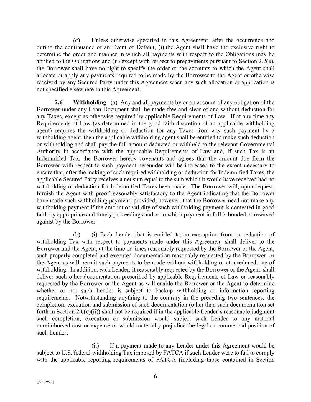 6 [[5791959]] (c) Unless otherwise specified in this Agreement, after the occurrence and during the continuance of an Event of Default, (i) the Agent shall have the exclusive right to determine the order and manner in which all payments with respect to the Obligations may be applied to the Obligations and (ii) except with respect to prepayments pursuant to Section 2.2(e), the Borrower shall have no right to specify the order or the accounts to which the Agent shall allocate or apply any payments required to be made by the Borrower to the Agent or otherwise received by any Secured Party under this Agreement when any such allocation or application is not specified elsewhere in this Agreement. 2.6 Withholding. (a) Any and all payments by or on account of any obligation of the Borrower under any Loan Document shall be made free and clear of and without deduction for any Taxes, except as otherwise required by applicable Requirements of Law. If at any time any Requirements of Law (as determined in the good faith discretion of an applicable withholding agent) requires the withholding or deduction for any Taxes from any such payment by a withholding agent, then the applicable withholding agent shall be entitled to make such deduction or withholding and shall pay the full amount deducted or withheld to the relevant Governmental Authority in accordance with the applicable Requirements of Law and, if such Tax is an Indemnified Tax, the Borrower hereby covenants and agrees that the amount due from the Borrower with respect to such payment hereunder will be increased to the extent necessary to ensure that, after the making of such required withholding or deduction for Indemnified Taxes, the applicable Secured Party receives a net sum equal to the sum which it would have received had no withholding or deduction for Indemnified Taxes been made. The Borrower will, upon request, furnish the Agent with proof reasonably satisfactory to the Agent indicating that the Borrower have made such withholding payment; provided, however, that the Borrower need not make any withholding payment if the amount or validity of such withholding payment is contested in good faith by appropriate and timely proceedings and as to which payment in full is bonded or reserved against by the Borrower. (b) (i) Each Lender that is entitled to an exemption from or reduction of withholding Tax with respect to payments made under this Agreement shall deliver to the Borrower and the Agent, at the time or times reasonably requested by the Borrower or the Agent, such properly completed and executed documentation reasonably requested by the Borrower or the Agent as will permit such payments to be made without withholding or at a reduced rate of withholding. In addition, each Lender, if reasonably requested by the Borrower or the Agent, shall deliver such other documentation prescribed by applicable Requirements of Law or reasonably requested by the Borrower or the Agent as will enable the Borrower or the Agent to determine whether or not such Lender is subject to backup withholding or information reporting requirements. Notwithstanding anything to the contrary in the preceding two sentences, the completion, execution and submission of such documentation (other than such documentation set forth in Section 2.6(d)(ii)) shall not be required if in the applicable Lender’s reasonable judgment such completion, execution or submission would subject such Lender to any material unreimbursed cost or expense or would materially prejudice the legal or commercial position of such Lender. (ii) If a payment made to any Lender under this Agreement would be subject to U.S. federal withholding Tax imposed by FATCA if such Lender were to fail to comply with the applicable reporting requirements of FATCA (including those contained in Section