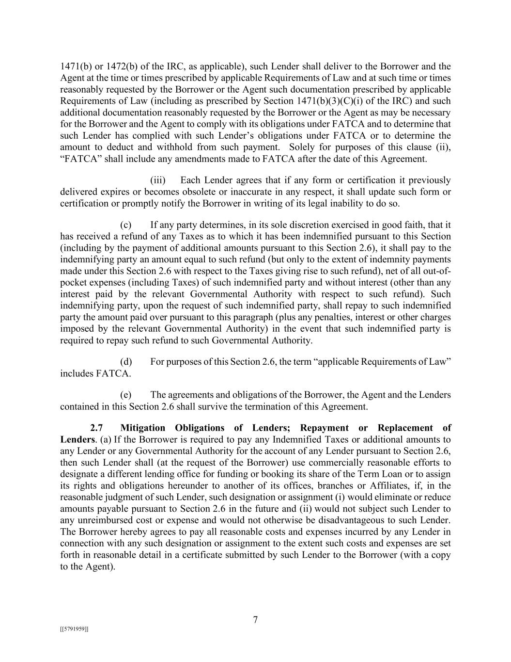 7 [[5791959]] 1471(b) or 1472(b) of the IRC, as applicable), such Lender shall deliver to the Borrower and the Agent at the time or times prescribed by applicable Requirements of Law and at such time or times reasonably requested by the Borrower or the Agent such documentation prescribed by applicable Requirements of Law (including as prescribed by Section 1471(b)(3)(C)(i) of the IRC) and such additional documentation reasonably requested by the Borrower or the Agent as may be necessary for the Borrower and the Agent to comply with its obligations under FATCA and to determine that such Lender has complied with such Lender’s obligations under FATCA or to determine the amount to deduct and withhold from such payment. Solely for purposes of this clause (ii), “FATCA” shall include any amendments made to FATCA after the date of this Agreement. (iii) Each Lender agrees that if any form or certification it previously delivered expires or becomes obsolete or inaccurate in any respect, it shall update such form or certification or promptly notify the Borrower in writing of its legal inability to do so. (c) If any party determines, in its sole discretion exercised in good faith, that it has received a refund of any Taxes as to which it has been indemnified pursuant to this Section (including by the payment of additional amounts pursuant to this Section 2.6), it shall pay to the indemnifying party an amount equal to such refund (but only to the extent of indemnity payments made under this Section 2.6 with respect to the Taxes giving rise to such refund), net of all out-of- pocket expenses (including Taxes) of such indemnified party and without interest (other than any interest paid by the relevant Governmental Authority with respect to such refund). Such indemnifying party, upon the request of such indemnified party, shall repay to such indemnified party the amount paid over pursuant to this paragraph (plus any penalties, interest or other charges imposed by the relevant Governmental Authority) in the event that such indemnified party is required to repay such refund to such Governmental Authority. (d) For purposes of this Section 2.6, the term “applicable Requirements of Law” includes FATCA. (e) The agreements and obligations of the Borrower, the Agent and the Lenders contained in this Section 2.6 shall survive the termination of this Agreement. 2.7 Mitigation Obligations of Lenders; Repayment or Replacement of Lenders. (a) If the Borrower is required to pay any Indemnified Taxes or additional amounts to any Lender or any Governmental Authority for the account of any Lender pursuant to Section 2.6, then such Lender shall (at the request of the Borrower) use commercially reasonable efforts to designate a different lending office for funding or booking its share of the Term Loan or to assign its rights and obligations hereunder to another of its offices, branches or Affiliates, if, in the reasonable judgment of such Lender, such designation or assignment (i) would eliminate or reduce amounts payable pursuant to Section 2.6 in the future and (ii) would not subject such Lender to any unreimbursed cost or expense and would not otherwise be disadvantageous to such Lender. The Borrower hereby agrees to pay all reasonable costs and expenses incurred by any Lender in connection with any such designation or assignment to the extent such costs and expenses are set forth in reasonable detail in a certificate submitted by such Lender to the Borrower (with a copy to the Agent).