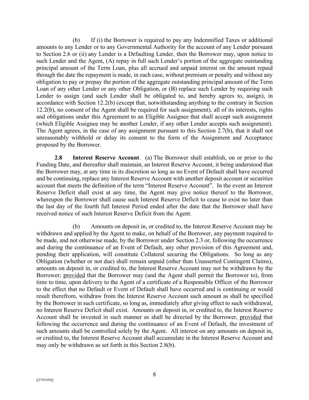 8 [[5791959]] (b) If (i) the Borrower is required to pay any Indemnified Taxes or additional amounts to any Lender or to any Governmental Authority for the account of any Lender pursuant to Section 2.6 or (ii) any Lender is a Defaulting Lender, then the Borrower may, upon notice to such Lender and the Agent, (A) repay in full such Lender’s portion of the aggregate outstanding principal amount of the Term Loan, plus all accrued and unpaid interest on the amount repaid through the date the repayment is made, in each case, without premium or penalty and without any obligation to pay or prepay the portion of the aggregate outstanding principal amount of the Term Loan of any other Lender or any other Obligation, or (B) replace such Lender by requiring such Lender to assign (and such Lender shall be obligated to, and hereby agrees to, assign), in accordance with Section 12.2(b) (except that, notwithstanding anything to the contrary in Section 12.2(b), no consent of the Agent shall be required for such assignment), all of its interests, rights and obligations under this Agreement to an Eligible Assignee that shall accept such assignment (which Eligible Assignee may be another Lender, if any other Lender accepts such assignment). The Agent agrees, in the case of any assignment pursuant to this Section 2.7(b), that it shall not unreasonably withhold or delay its consent to the form of the Assignment and Acceptance proposed by the Borrower. 2.8 Interest Reserve Account. (a) The Borrower shall establish, on or prior to the Funding Date, and thereafter shall maintain, an Interest Reserve Account, it being understood that the Borrower may, at any time in its discretion so long as no Event of Default shall have occurred and be continuing, replace any Interest Reserve Account with another deposit account or securities account that meets the definition of the term “Interest Reserve Account”. In the event an Interest Reserve Deficit shall exist at any time, the Agent may give notice thereof to the Borrower, whereupon the Borrower shall cause such Interest Reserve Deficit to cease to exist no later than the last day of the fourth full Interest Period ended after the date that the Borrower shall have received notice of such Interest Reserve Deficit from the Agent. (b) Amounts on deposit in, or credited to, the Interest Reserve Account may be withdrawn and applied by the Agent to make, on behalf of the Borrower, any payment required to be made, and not otherwise made, by the Borrower under Section 2.3 or, following the occurrence and during the continuance of an Event of Default, any other provision of this Agreement and, pending their application, will constitute Collateral securing the Obligations. So long as any Obligation (whether or not due) shall remain unpaid (other than Unasserted Contingent Claims), amounts on deposit in, or credited to, the Interest Reserve Account may not be withdrawn by the Borrower; provided that the Borrower may (and the Agent shall permit the Borrower to), from time to time, upon delivery to the Agent of a certificate of a Responsible Officer of the Borrower to the effect that no Default or Event of Default shall have occurred and is continuing or would result therefrom, withdraw from the Interest Reserve Account such amount as shall be specified by the Borrower in such certificate, so long as, immediately after giving effect to such withdrawal, no Interest Reserve Deficit shall exist. Amounts on deposit in, or credited to, the Interest Reserve Account shall be invested in such manner as shall be directed by the Borrower, provided that following the occurrence and during the continuance of an Event of Default, the investment of such amounts shall be controlled solely by the Agent. All interest on any amounts on deposit in, or credited to, the Interest Reserve Account shall accumulate in the Interest Reserve Account and may only be withdrawn as set forth in this Section 2.8(b).