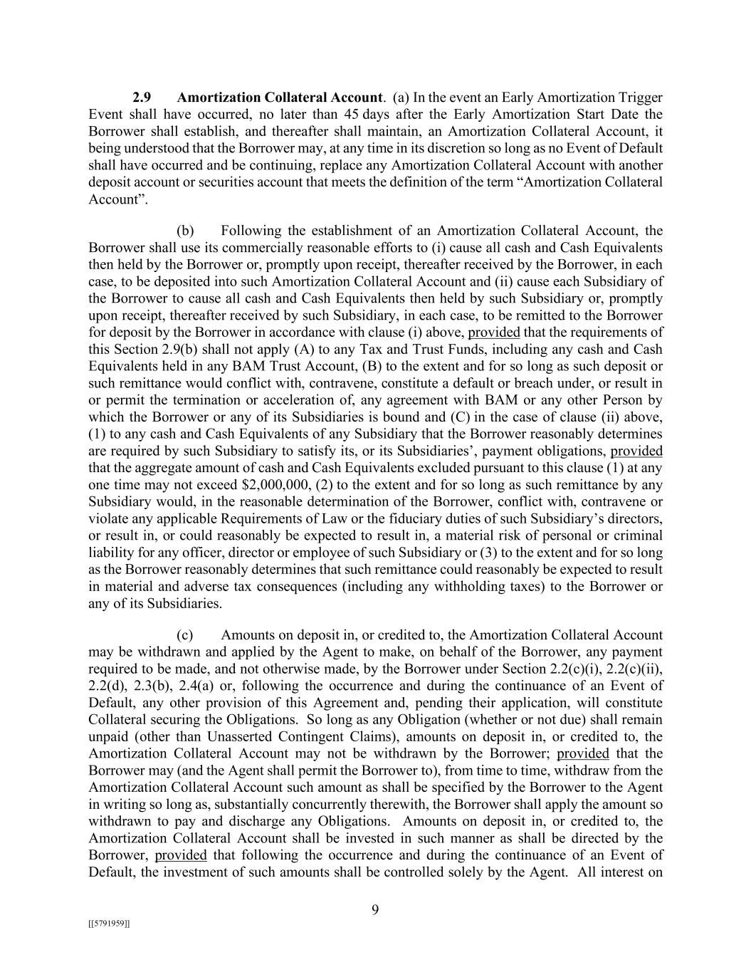 9 [[5791959]] 2.9 Amortization Collateral Account. (a) In the event an Early Amortization Trigger Event shall have occurred, no later than 45 days after the Early Amortization Start Date the Borrower shall establish, and thereafter shall maintain, an Amortization Collateral Account, it being understood that the Borrower may, at any time in its discretion so long as no Event of Default shall have occurred and be continuing, replace any Amortization Collateral Account with another deposit account or securities account that meets the definition of the term “Amortization Collateral Account”. (b) Following the establishment of an Amortization Collateral Account, the Borrower shall use its commercially reasonable efforts to (i) cause all cash and Cash Equivalents then held by the Borrower or, promptly upon receipt, thereafter received by the Borrower, in each case, to be deposited into such Amortization Collateral Account and (ii) cause each Subsidiary of the Borrower to cause all cash and Cash Equivalents then held by such Subsidiary or, promptly upon receipt, thereafter received by such Subsidiary, in each case, to be remitted to the Borrower for deposit by the Borrower in accordance with clause (i) above, provided that the requirements of this Section 2.9(b) shall not apply (A) to any Tax and Trust Funds, including any cash and Cash Equivalents held in any BAM Trust Account, (B) to the extent and for so long as such deposit or such remittance would conflict with, contravene, constitute a default or breach under, or result in or permit the termination or acceleration of, any agreement with BAM or any other Person by which the Borrower or any of its Subsidiaries is bound and (C) in the case of clause (ii) above, (1) to any cash and Cash Equivalents of any Subsidiary that the Borrower reasonably determines are required by such Subsidiary to satisfy its, or its Subsidiaries’, payment obligations, provided that the aggregate amount of cash and Cash Equivalents excluded pursuant to this clause (1) at any one time may not exceed $2,000,000, (2) to the extent and for so long as such remittance by any Subsidiary would, in the reasonable determination of the Borrower, conflict with, contravene or violate any applicable Requirements of Law or the fiduciary duties of such Subsidiary’s directors, or result in, or could reasonably be expected to result in, a material risk of personal or criminal liability for any officer, director or employee of such Subsidiary or (3) to the extent and for so long as the Borrower reasonably determines that such remittance could reasonably be expected to result in material and adverse tax consequences (including any withholding taxes) to the Borrower or any of its Subsidiaries. (c) Amounts on deposit in, or credited to, the Amortization Collateral Account may be withdrawn and applied by the Agent to make, on behalf of the Borrower, any payment required to be made, and not otherwise made, by the Borrower under Section 2.2(c)(i), 2.2(c)(ii), 2.2(d), 2.3(b), 2.4(a) or, following the occurrence and during the continuance of an Event of Default, any other provision of this Agreement and, pending their application, will constitute Collateral securing the Obligations. So long as any Obligation (whether or not due) shall remain unpaid (other than Unasserted Contingent Claims), amounts on deposit in, or credited to, the Amortization Collateral Account may not be withdrawn by the Borrower; provided that the Borrower may (and the Agent shall permit the Borrower to), from time to time, withdraw from the Amortization Collateral Account such amount as shall be specified by the Borrower to the Agent in writing so long as, substantially concurrently therewith, the Borrower shall apply the amount so withdrawn to pay and discharge any Obligations. Amounts on deposit in, or credited to, the Amortization Collateral Account shall be invested in such manner as shall be directed by the Borrower, provided that following the occurrence and during the continuance of an Event of Default, the investment of such amounts shall be controlled solely by the Agent. All interest on