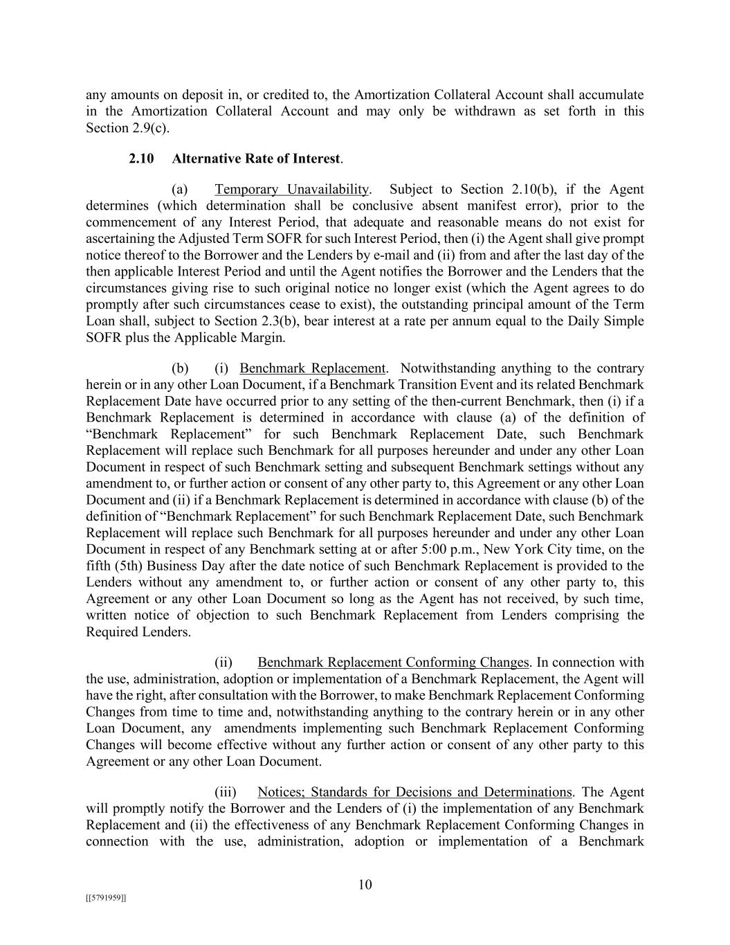 10 [[5791959]] any amounts on deposit in, or credited to, the Amortization Collateral Account shall accumulate in the Amortization Collateral Account and may only be withdrawn as set forth in this Section 2.9(c). 2.10 Alternative Rate of Interest. (a) Temporary Unavailability. Subject to Section 2.10(b), if the Agent determines (which determination shall be conclusive absent manifest error), prior to the commencement of any Interest Period, that adequate and reasonable means do not exist for ascertaining the Adjusted Term SOFR for such Interest Period, then (i) the Agent shall give prompt notice thereof to the Borrower and the Lenders by e-mail and (ii) from and after the last day of the then applicable Interest Period and until the Agent notifies the Borrower and the Lenders that the circumstances giving rise to such original notice no longer exist (which the Agent agrees to do promptly after such circumstances cease to exist), the outstanding principal amount of the Term Loan shall, subject to Section 2.3(b), bear interest at a rate per annum equal to the Daily Simple SOFR plus the Applicable Margin. (b) (i) Benchmark Replacement. Notwithstanding anything to the contrary herein or in any other Loan Document, if a Benchmark Transition Event and its related Benchmark Replacement Date have occurred prior to any setting of the then-current Benchmark, then (i) if a Benchmark Replacement is determined in accordance with clause (a) of the definition of “Benchmark Replacement” for such Benchmark Replacement Date, such Benchmark Replacement will replace such Benchmark for all purposes hereunder and under any other Loan Document in respect of such Benchmark setting and subsequent Benchmark settings without any amendment to, or further action or consent of any other party to, this Agreement or any other Loan Document and (ii) if a Benchmark Replacement is determined in accordance with clause (b) of the definition of “Benchmark Replacement” for such Benchmark Replacement Date, such Benchmark Replacement will replace such Benchmark for all purposes hereunder and under any other Loan Document in respect of any Benchmark setting at or after 5:00 p.m., New York City time, on the fifth (5th) Business Day after the date notice of such Benchmark Replacement is provided to the Lenders without any amendment to, or further action or consent of any other party to, this Agreement or any other Loan Document so long as the Agent has not received, by such time, written notice of objection to such Benchmark Replacement from Lenders comprising the Required Lenders. (ii) Benchmark Replacement Conforming Changes. In connection with the use, administration, adoption or implementation of a Benchmark Replacement, the Agent will have the right, after consultation with the Borrower, to make Benchmark Replacement Conforming Changes from time to time and, notwithstanding anything to the contrary herein or in any other Loan Document, any amendments implementing such Benchmark Replacement Conforming Changes will become effective without any further action or consent of any other party to this Agreement or any other Loan Document. (iii) Notices; Standards for Decisions and Determinations. The Agent will promptly notify the Borrower and the Lenders of (i) the implementation of any Benchmark Replacement and (ii) the effectiveness of any Benchmark Replacement Conforming Changes in connection with the use, administration, adoption or implementation of a Benchmark