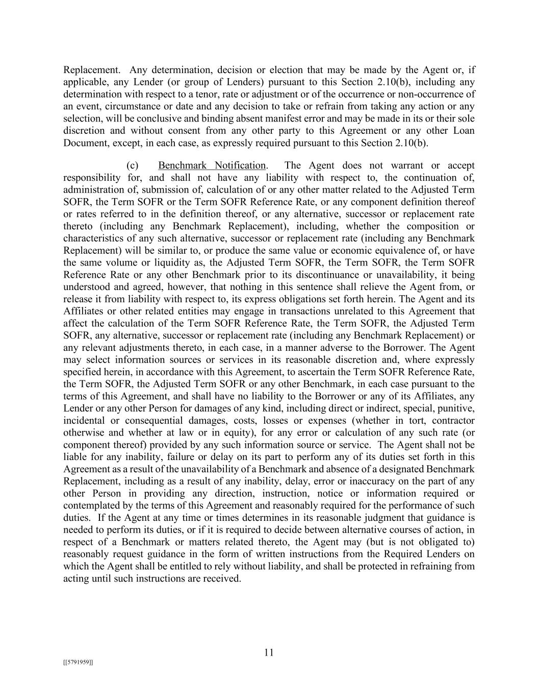11 [[5791959]] Replacement. Any determination, decision or election that may be made by the Agent or, if applicable, any Lender (or group of Lenders) pursuant to this Section 2.10(b), including any determination with respect to a tenor, rate or adjustment or of the occurrence or non-occurrence of an event, circumstance or date and any decision to take or refrain from taking any action or any selection, will be conclusive and binding absent manifest error and may be made in its or their sole discretion and without consent from any other party to this Agreement or any other Loan Document, except, in each case, as expressly required pursuant to this Section 2.10(b). (c) Benchmark Notification. The Agent does not warrant or accept responsibility for, and shall not have any liability with respect to, the continuation of, administration of, submission of, calculation of or any other matter related to the Adjusted Term SOFR, the Term SOFR or the Term SOFR Reference Rate, or any component definition thereof or rates referred to in the definition thereof, or any alternative, successor or replacement rate thereto (including any Benchmark Replacement), including, whether the composition or characteristics of any such alternative, successor or replacement rate (including any Benchmark Replacement) will be similar to, or produce the same value or economic equivalence of, or have the same volume or liquidity as, the Adjusted Term SOFR, the Term SOFR, the Term SOFR Reference Rate or any other Benchmark prior to its discontinuance or unavailability, it being understood and agreed, however, that nothing in this sentence shall relieve the Agent from, or release it from liability with respect to, its express obligations set forth herein. The Agent and its Affiliates or other related entities may engage in transactions unrelated to this Agreement that affect the calculation of the Term SOFR Reference Rate, the Term SOFR, the Adjusted Term SOFR, any alternative, successor or replacement rate (including any Benchmark Replacement) or any relevant adjustments thereto, in each case, in a manner adverse to the Borrower. The Agent may select information sources or services in its reasonable discretion and, where expressly specified herein, in accordance with this Agreement, to ascertain the Term SOFR Reference Rate, the Term SOFR, the Adjusted Term SOFR or any other Benchmark, in each case pursuant to the terms of this Agreement, and shall have no liability to the Borrower or any of its Affiliates, any Lender or any other Person for damages of any kind, including direct or indirect, special, punitive, incidental or consequential damages, costs, losses or expenses (whether in tort, contractor otherwise and whether at law or in equity), for any error or calculation of any such rate (or component thereof) provided by any such information source or service. The Agent shall not be liable for any inability, failure or delay on its part to perform any of its duties set forth in this Agreement as a result of the unavailability of a Benchmark and absence of a designated Benchmark Replacement, including as a result of any inability, delay, error or inaccuracy on the part of any other Person in providing any direction, instruction, notice or information required or contemplated by the terms of this Agreement and reasonably required for the performance of such duties. If the Agent at any time or times determines in its reasonable judgment that guidance is needed to perform its duties, or if it is required to decide between alternative courses of action, in respect of a Benchmark or matters related thereto, the Agent may (but is not obligated to) reasonably request guidance in the form of written instructions from the Required Lenders on which the Agent shall be entitled to rely without liability, and shall be protected in refraining from acting until such instructions are received.