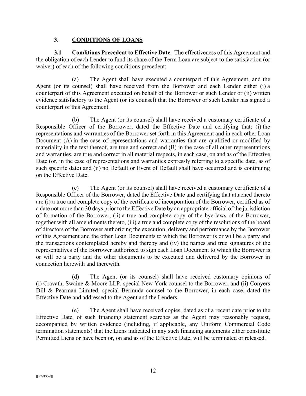 12 [[5791959]] 3. CONDITIONS OF LOANS 3.1 Conditions Precedent to Effective Date. The effectiveness of this Agreement and the obligation of each Lender to fund its share of the Term Loan are subject to the satisfaction (or waiver) of each of the following conditions precedent: (a) The Agent shall have executed a counterpart of this Agreement, and the Agent (or its counsel) shall have received from the Borrower and each Lender either (i) a counterpart of this Agreement executed on behalf of the Borrower or such Lender or (ii) written evidence satisfactory to the Agent (or its counsel) that the Borrower or such Lender has signed a counterpart of this Agreement. (b) The Agent (or its counsel) shall have received a customary certificate of a Responsible Officer of the Borrower, dated the Effective Date and certifying that: (i) the representations and warranties of the Borrower set forth in this Agreement and in each other Loan Document (A) in the case of representations and warranties that are qualified or modified by materiality in the text thereof, are true and correct and (B) in the case of all other representations and warranties, are true and correct in all material respects, in each case, on and as of the Effective Date (or, in the case of representations and warranties expressly referring to a specific date, as of such specific date) and (ii) no Default or Event of Default shall have occurred and is continuing on the Effective Date. (c) The Agent (or its counsel) shall have received a customary certificate of a Responsible Officer of the Borrower, dated the Effective Date and certifying that attached thereto are (i) a true and complete copy of the certificate of incorporation of the Borrower, certified as of a date not more than 30 days prior to the Effective Date by an appropriate official of the jurisdiction of formation of the Borrower, (ii) a true and complete copy of the bye-laws of the Borrower, together with all amendments thereto, (iii) a true and complete copy of the resolutions of the board of directors of the Borrower authorizing the execution, delivery and performance by the Borrower of this Agreement and the other Loan Documents to which the Borrower is or will be a party and the transactions contemplated hereby and thereby and (iv) the names and true signatures of the representatives of the Borrower authorized to sign each Loan Document to which the Borrower is or will be a party and the other documents to be executed and delivered by the Borrower in connection herewith and therewith. (d) The Agent (or its counsel) shall have received customary opinions of (i) Cravath, Swaine & Moore LLP, special New York counsel to the Borrower, and (ii) Conyers Dill & Pearman Limited, special Bermuda counsel to the Borrower, in each case, dated the Effective Date and addressed to the Agent and the Lenders. (e) The Agent shall have received copies, dated as of a recent date prior to the Effective Date, of such financing statement searches as the Agent may reasonably request, accompanied by written evidence (including, if applicable, any Uniform Commercial Code termination statements) that the Liens indicated in any such financing statements either constitute Permitted Liens or have been or, on and as of the Effective Date, will be terminated or released.
