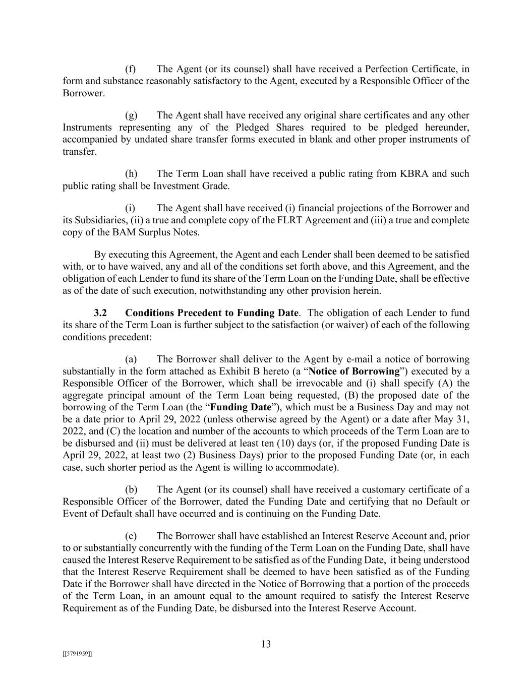 13 [[5791959]] (f) The Agent (or its counsel) shall have received a Perfection Certificate, in form and substance reasonably satisfactory to the Agent, executed by a Responsible Officer of the Borrower. (g) The Agent shall have received any original share certificates and any other Instruments representing any of the Pledged Shares required to be pledged hereunder, accompanied by undated share transfer forms executed in blank and other proper instruments of transfer. (h) The Term Loan shall have received a public rating from KBRA and such public rating shall be Investment Grade. (i) The Agent shall have received (i) financial projections of the Borrower and its Subsidiaries, (ii) a true and complete copy of the FLRT Agreement and (iii) a true and complete copy of the BAM Surplus Notes. By executing this Agreement, the Agent and each Lender shall been deemed to be satisfied with, or to have waived, any and all of the conditions set forth above, and this Agreement, and the obligation of each Lender to fund its share of the Term Loan on the Funding Date, shall be effective as of the date of such execution, notwithstanding any other provision herein. 3.2 Conditions Precedent to Funding Date. The obligation of each Lender to fund its share of the Term Loan is further subject to the satisfaction (or waiver) of each of the following conditions precedent: (a) The Borrower shall deliver to the Agent by e-mail a notice of borrowing substantially in the form attached as Exhibit B hereto (a “Notice of Borrowing”) executed by a Responsible Officer of the Borrower, which shall be irrevocable and (i) shall specify (A) the aggregate principal amount of the Term Loan being requested, (B) the proposed date of the borrowing of the Term Loan (the “Funding Date”), which must be a Business Day and may not be a date prior to April 29, 2022 (unless otherwise agreed by the Agent) or a date after May 31, 2022, and (C) the location and number of the accounts to which proceeds of the Term Loan are to be disbursed and (ii) must be delivered at least ten (10) days (or, if the proposed Funding Date is April 29, 2022, at least two (2) Business Days) prior to the proposed Funding Date (or, in each case, such shorter period as the Agent is willing to accommodate). (b) The Agent (or its counsel) shall have received a customary certificate of a Responsible Officer of the Borrower, dated the Funding Date and certifying that no Default or Event of Default shall have occurred and is continuing on the Funding Date. (c) The Borrower shall have established an Interest Reserve Account and, prior to or substantially concurrently with the funding of the Term Loan on the Funding Date, shall have caused the Interest Reserve Requirement to be satisfied as of the Funding Date, it being understood that the Interest Reserve Requirement shall be deemed to have been satisfied as of the Funding Date if the Borrower shall have directed in the Notice of Borrowing that a portion of the proceeds of the Term Loan, in an amount equal to the amount required to satisfy the Interest Reserve Requirement as of the Funding Date, be disbursed into the Interest Reserve Account.