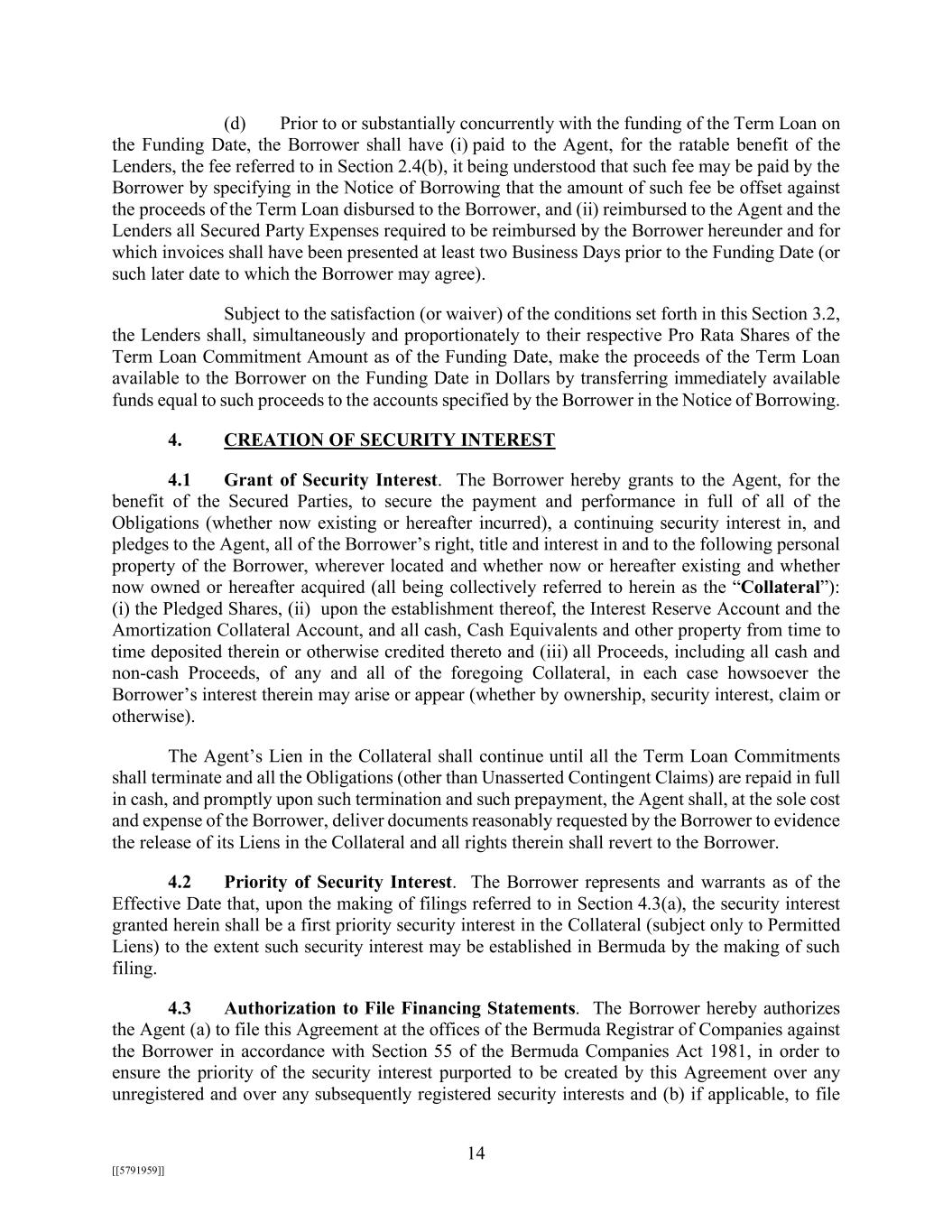 14 [[5791959]] (d) Prior to or substantially concurrently with the funding of the Term Loan on the Funding Date, the Borrower shall have (i) paid to the Agent, for the ratable benefit of the Lenders, the fee referred to in Section 2.4(b), it being understood that such fee may be paid by the Borrower by specifying in the Notice of Borrowing that the amount of such fee be offset against the proceeds of the Term Loan disbursed to the Borrower, and (ii) reimbursed to the Agent and the Lenders all Secured Party Expenses required to be reimbursed by the Borrower hereunder and for which invoices shall have been presented at least two Business Days prior to the Funding Date (or such later date to which the Borrower may agree). Subject to the satisfaction (or waiver) of the conditions set forth in this Section 3.2, the Lenders shall, simultaneously and proportionately to their respective Pro Rata Shares of the Term Loan Commitment Amount as of the Funding Date, make the proceeds of the Term Loan available to the Borrower on the Funding Date in Dollars by transferring immediately available funds equal to such proceeds to the accounts specified by the Borrower in the Notice of Borrowing. 4. CREATION OF SECURITY INTEREST 4.1 Grant of Security Interest. The Borrower hereby grants to the Agent, for the benefit of the Secured Parties, to secure the payment and performance in full of all of the Obligations (whether now existing or hereafter incurred), a continuing security interest in, and pledges to the Agent, all of the Borrower’s right, title and interest in and to the following personal property of the Borrower, wherever located and whether now or hereafter existing and whether now owned or hereafter acquired (all being collectively referred to herein as the “Collateral”): (i) the Pledged Shares, (ii) upon the establishment thereof, the Interest Reserve Account and the Amortization Collateral Account, and all cash, Cash Equivalents and other property from time to time deposited therein or otherwise credited thereto and (iii) all Proceeds, including all cash and non-cash Proceeds, of any and all of the foregoing Collateral, in each case howsoever the Borrower’s interest therein may arise or appear (whether by ownership, security interest, claim or otherwise). The Agent’s Lien in the Collateral shall continue until all the Term Loan Commitments shall terminate and all the Obligations (other than Unasserted Contingent Claims) are repaid in full in cash, and promptly upon such termination and such prepayment, the Agent shall, at the sole cost and expense of the Borrower, deliver documents reasonably requested by the Borrower to evidence the release of its Liens in the Collateral and all rights therein shall revert to the Borrower. 4.2 Priority of Security Interest. The Borrower represents and warrants as of the Effective Date that, upon the making of filings referred to in Section 4.3(a), the security interest granted herein shall be a first priority security interest in the Collateral (subject only to Permitted Liens) to the extent such security interest may be established in Bermuda by the making of such filing. 4.3 Authorization to File Financing Statements. The Borrower hereby authorizes the Agent (a) to file this Agreement at the offices of the Bermuda Registrar of Companies against the Borrower in accordance with Section 55 of the Bermuda Companies Act 1981, in order to ensure the priority of the security interest purported to be created by this Agreement over any unregistered and over any subsequently registered security interests and (b) if applicable, to file