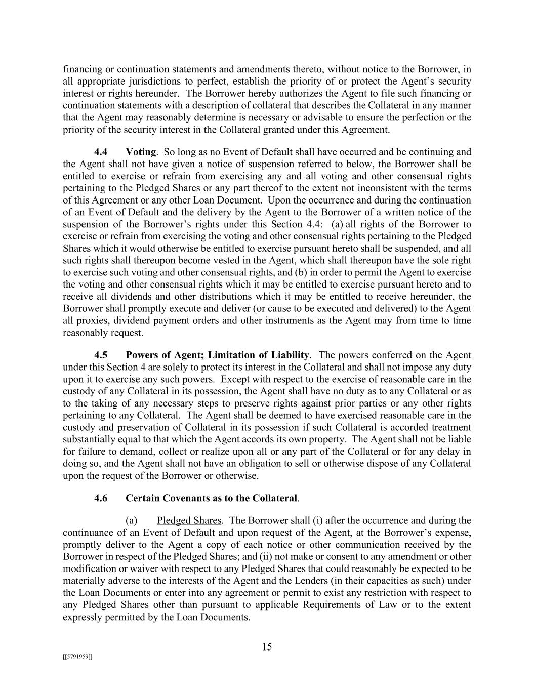 15 [[5791959]] financing or continuation statements and amendments thereto, without notice to the Borrower, in all appropriate jurisdictions to perfect, establish the priority of or protect the Agent’s security interest or rights hereunder. The Borrower hereby authorizes the Agent to file such financing or continuation statements with a description of collateral that describes the Collateral in any manner that the Agent may reasonably determine is necessary or advisable to ensure the perfection or the priority of the security interest in the Collateral granted under this Agreement. 4.4 Voting. So long as no Event of Default shall have occurred and be continuing and the Agent shall not have given a notice of suspension referred to below, the Borrower shall be entitled to exercise or refrain from exercising any and all voting and other consensual rights pertaining to the Pledged Shares or any part thereof to the extent not inconsistent with the terms of this Agreement or any other Loan Document. Upon the occurrence and during the continuation of an Event of Default and the delivery by the Agent to the Borrower of a written notice of the suspension of the Borrower’s rights under this Section 4.4: (a) all rights of the Borrower to exercise or refrain from exercising the voting and other consensual rights pertaining to the Pledged Shares which it would otherwise be entitled to exercise pursuant hereto shall be suspended, and all such rights shall thereupon become vested in the Agent, which shall thereupon have the sole right to exercise such voting and other consensual rights, and (b) in order to permit the Agent to exercise the voting and other consensual rights which it may be entitled to exercise pursuant hereto and to receive all dividends and other distributions which it may be entitled to receive hereunder, the Borrower shall promptly execute and deliver (or cause to be executed and delivered) to the Agent all proxies, dividend payment orders and other instruments as the Agent may from time to time reasonably request. 4.5 Powers of Agent; Limitation of Liability. The powers conferred on the Agent under this Section 4 are solely to protect its interest in the Collateral and shall not impose any duty upon it to exercise any such powers. Except with respect to the exercise of reasonable care in the custody of any Collateral in its possession, the Agent shall have no duty as to any Collateral or as to the taking of any necessary steps to preserve rights against prior parties or any other rights pertaining to any Collateral. The Agent shall be deemed to have exercised reasonable care in the custody and preservation of Collateral in its possession if such Collateral is accorded treatment substantially equal to that which the Agent accords its own property. The Agent shall not be liable for failure to demand, collect or realize upon all or any part of the Collateral or for any delay in doing so, and the Agent shall not have an obligation to sell or otherwise dispose of any Collateral upon the request of the Borrower or otherwise. 4.6 Certain Covenants as to the Collateral. (a) Pledged Shares. The Borrower shall (i) after the occurrence and during the continuance of an Event of Default and upon request of the Agent, at the Borrower’s expense, promptly deliver to the Agent a copy of each notice or other communication received by the Borrower in respect of the Pledged Shares; and (ii) not make or consent to any amendment or other modification or waiver with respect to any Pledged Shares that could reasonably be expected to be materially adverse to the interests of the Agent and the Lenders (in their capacities as such) under the Loan Documents or enter into any agreement or permit to exist any restriction with respect to any Pledged Shares other than pursuant to applicable Requirements of Law or to the extent expressly permitted by the Loan Documents.