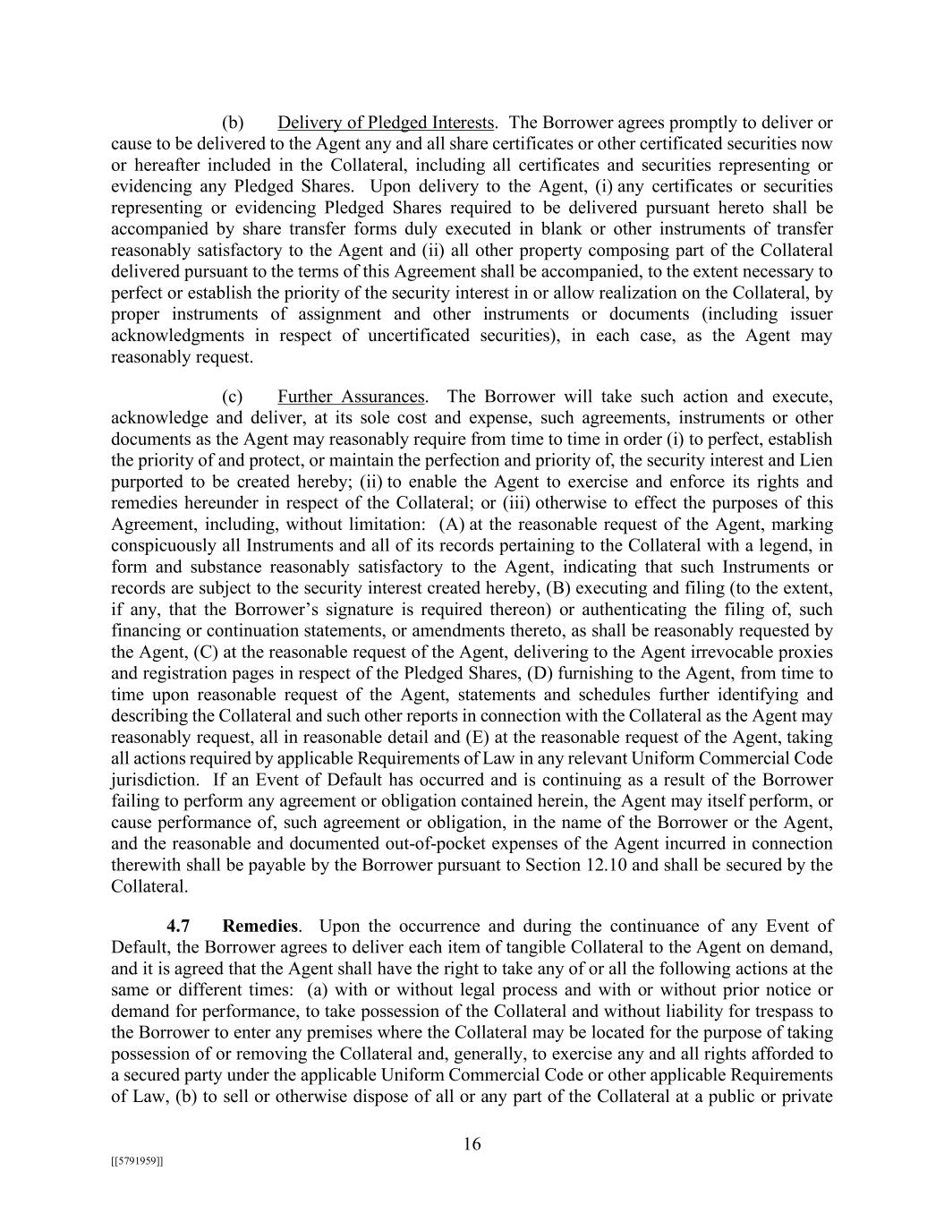 16 [[5791959]] (b) Delivery of Pledged Interests. The Borrower agrees promptly to deliver or cause to be delivered to the Agent any and all share certificates or other certificated securities now or hereafter included in the Collateral, including all certificates and securities representing or evidencing any Pledged Shares. Upon delivery to the Agent, (i) any certificates or securities representing or evidencing Pledged Shares required to be delivered pursuant hereto shall be accompanied by share transfer forms duly executed in blank or other instruments of transfer reasonably satisfactory to the Agent and (ii) all other property composing part of the Collateral delivered pursuant to the terms of this Agreement shall be accompanied, to the extent necessary to perfect or establish the priority of the security interest in or allow realization on the Collateral, by proper instruments of assignment and other instruments or documents (including issuer acknowledgments in respect of uncertificated securities), in each case, as the Agent may reasonably request. (c) Further Assurances. The Borrower will take such action and execute, acknowledge and deliver, at its sole cost and expense, such agreements, instruments or other documents as the Agent may reasonably require from time to time in order (i) to perfect, establish the priority of and protect, or maintain the perfection and priority of, the security interest and Lien purported to be created hereby; (ii) to enable the Agent to exercise and enforce its rights and remedies hereunder in respect of the Collateral; or (iii) otherwise to effect the purposes of this Agreement, including, without limitation: (A) at the reasonable request of the Agent, marking conspicuously all Instruments and all of its records pertaining to the Collateral with a legend, in form and substance reasonably satisfactory to the Agent, indicating that such Instruments or records are subject to the security interest created hereby, (B) executing and filing (to the extent, if any, that the Borrower’s signature is required thereon) or authenticating the filing of, such financing or continuation statements, or amendments thereto, as shall be reasonably requested by the Agent, (C) at the reasonable request of the Agent, delivering to the Agent irrevocable proxies and registration pages in respect of the Pledged Shares, (D) furnishing to the Agent, from time to time upon reasonable request of the Agent, statements and schedules further identifying and describing the Collateral and such other reports in connection with the Collateral as the Agent may reasonably request, all in reasonable detail and (E) at the reasonable request of the Agent, taking all actions required by applicable Requirements of Law in any relevant Uniform Commercial Code jurisdiction. If an Event of Default has occurred and is continuing as a result of the Borrower failing to perform any agreement or obligation contained herein, the Agent may itself perform, or cause performance of, such agreement or obligation, in the name of the Borrower or the Agent, and the reasonable and documented out-of-pocket expenses of the Agent incurred in connection therewith shall be payable by the Borrower pursuant to Section 12.10 and shall be secured by the Collateral. 4.7 Remedies. Upon the occurrence and during the continuance of any Event of Default, the Borrower agrees to deliver each item of tangible Collateral to the Agent on demand, and it is agreed that the Agent shall have the right to take any of or all the following actions at the same or different times: (a) with or without legal process and with or without prior notice or demand for performance, to take possession of the Collateral and without liability for trespass to the Borrower to enter any premises where the Collateral may be located for the purpose of taking possession of or removing the Collateral and, generally, to exercise any and all rights afforded to a secured party under the applicable Uniform Commercial Code or other applicable Requirements of Law, (b) to sell or otherwise dispose of all or any part of the Collateral at a public or private