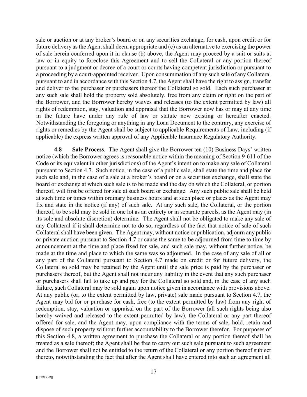 17 [[5791959]] sale or auction or at any broker’s board or on any securities exchange, for cash, upon credit or for future delivery as the Agent shall deem appropriate and (c) as an alternative to exercising the power of sale herein conferred upon it in clause (b) above, the Agent may proceed by a suit or suits at law or in equity to foreclose this Agreement and to sell the Collateral or any portion thereof pursuant to a judgment or decree of a court or courts having competent jurisdiction or pursuant to a proceeding by a court-appointed receiver. Upon consummation of any such sale of any Collateral pursuant to and in accordance with this Section 4.7, the Agent shall have the right to assign, transfer and deliver to the purchaser or purchasers thereof the Collateral so sold. Each such purchaser at any such sale shall hold the property sold absolutely, free from any claim or right on the part of the Borrower, and the Borrower hereby waives and releases (to the extent permitted by law) all rights of redemption, stay, valuation and appraisal that the Borrower now has or may at any time in the future have under any rule of law or statute now existing or hereafter enacted. Notwithstanding the foregoing or anything in any Loan Document to the contrary, any exercise of rights or remedies by the Agent shall be subject to applicable Requirements of Law, including (if applicable) the express written approval of any Applicable Insurance Regulatory Authority. 4.8 Sale Process. The Agent shall give the Borrower ten (10) Business Days’ written notice (which the Borrower agrees is reasonable notice within the meaning of Section 9-611 of the Code or its equivalent in other jurisdictions) of the Agent’s intention to make any sale of Collateral pursuant to Section 4.7. Such notice, in the case of a public sale, shall state the time and place for such sale and, in the case of a sale at a broker’s board or on a securities exchange, shall state the board or exchange at which such sale is to be made and the day on which the Collateral, or portion thereof, will first be offered for sale at such board or exchange. Any such public sale shall be held at such time or times within ordinary business hours and at such place or places as the Agent may fix and state in the notice (if any) of such sale. At any such sale, the Collateral, or the portion thereof, to be sold may be sold in one lot as an entirety or in separate parcels, as the Agent may (in its sole and absolute discretion) determine. The Agent shall not be obligated to make any sale of any Collateral if it shall determine not to do so, regardless of the fact that notice of sale of such Collateral shall have been given. The Agent may, without notice or publication, adjourn any public or private auction pursuant to Section 4.7 or cause the same to be adjourned from time to time by announcement at the time and place fixed for sale, and such sale may, without further notice, be made at the time and place to which the same was so adjourned. In the case of any sale of all or any part of the Collateral pursuant to Section 4.7 made on credit or for future delivery, the Collateral so sold may be retained by the Agent until the sale price is paid by the purchaser or purchasers thereof, but the Agent shall not incur any liability in the event that any such purchaser or purchasers shall fail to take up and pay for the Collateral so sold and, in the case of any such failure, such Collateral may be sold again upon notice given in accordance with provisions above. At any public (or, to the extent permitted by law, private) sale made pursuant to Section 4.7, the Agent may bid for or purchase for cash, free (to the extent permitted by law) from any right of redemption, stay, valuation or appraisal on the part of the Borrower (all such rights being also hereby waived and released to the extent permitted by law), the Collateral or any part thereof offered for sale, and the Agent may, upon compliance with the terms of sale, hold, retain and dispose of such property without further accountability to the Borrower therefor. For purposes of this Section 4.8, a written agreement to purchase the Collateral or any portion thereof shall be treated as a sale thereof; the Agent shall be free to carry out such sale pursuant to such agreement and the Borrower shall not be entitled to the return of the Collateral or any portion thereof subject thereto, notwithstanding the fact that after the Agent shall have entered into such an agreement all