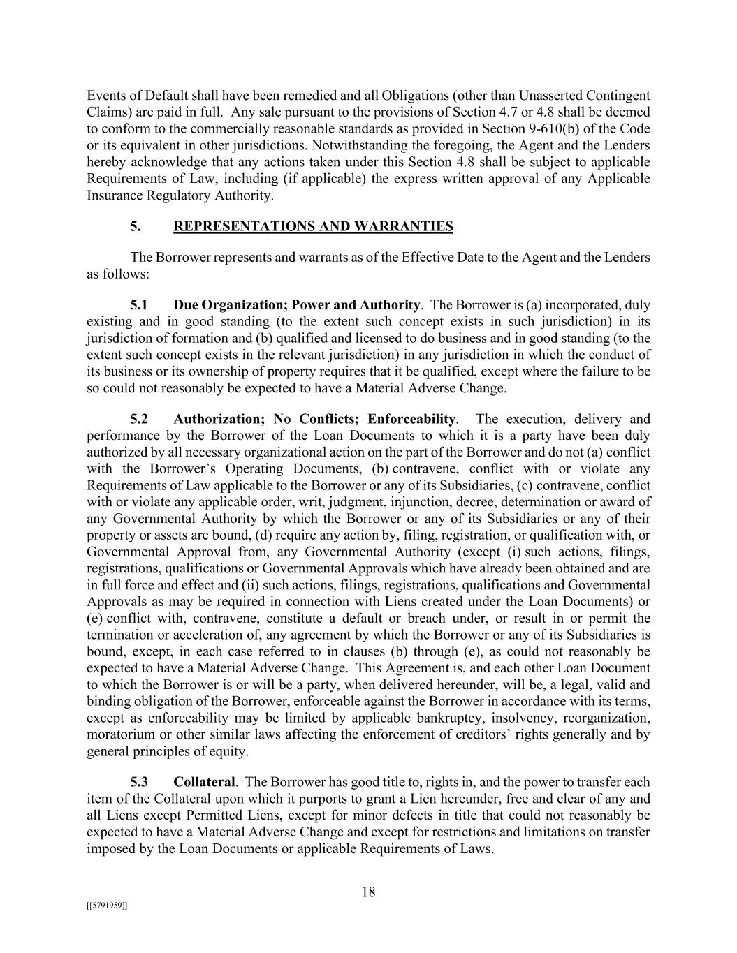18 [[5791959]] Events of Default shall have been remedied and all Obligations (other than Unasserted Contingent Claims) are paid in full. Any sale pursuant to the provisions of Section 4.7 or 4.8 shall be deemed to conform to the commercially reasonable standards as provided in Section 9-610(b) of the Code or its equivalent in other jurisdictions. Notwithstanding the foregoing, the Agent and the Lenders hereby acknowledge that any actions taken under this Section 4.8 shall be subject to applicable Requirements of Law, including (if applicable) the express written approval of any Applicable Insurance Regulatory Authority. 5. REPRESENTATIONS AND WARRANTIES The Borrower represents and warrants as of the Effective Date to the Agent and the Lenders as follows: 5.1 Due Organization; Power and Authority. The Borrower is (a) incorporated, duly existing and in good standing (to the extent such concept exists in such jurisdiction) in its jurisdiction of formation and (b) qualified and licensed to do business and in good standing (to the extent such concept exists in the relevant jurisdiction) in any jurisdiction in which the conduct of its business or its ownership of property requires that it be qualified, except where the failure to be so could not reasonably be expected to have a Material Adverse Change. 5.2 Authorization; No Conflicts; Enforceability. The execution, delivery and performance by the Borrower of the Loan Documents to which it is a party have been duly authorized by all necessary organizational action on the part of the Borrower and do not (a) conflict with the Borrower’s Operating Documents, (b) contravene, conflict with or violate any Requirements of Law applicable to the Borrower or any of its Subsidiaries, (c) contravene, conflict with or violate any applicable order, writ, judgment, injunction, decree, determination or award of any Governmental Authority by which the Borrower or any of its Subsidiaries or any of their property or assets are bound, (d) require any action by, filing, registration, or qualification with, or Governmental Approval from, any Governmental Authority (except (i) such actions, filings, registrations, qualifications or Governmental Approvals which have already been obtained and are in full force and effect and (ii) such actions, filings, registrations, qualifications and Governmental Approvals as may be required in connection with Liens created under the Loan Documents) or (e) conflict with, contravene, constitute a default or breach under, or result in or permit the termination or acceleration of, any agreement by which the Borrower or any of its Subsidiaries is bound, except, in each case referred to in clauses (b) through (e), as could not reasonably be expected to have a Material Adverse Change. This Agreement is, and each other Loan Document to which the Borrower is or will be a party, when delivered hereunder, will be, a legal, valid and binding obligation of the Borrower, enforceable against the Borrower in accordance with its terms, except as enforceability may be limited by applicable bankruptcy, insolvency, reorganization, moratorium or other similar laws affecting the enforcement of creditors’ rights generally and by general principles of equity. 5.3 Collateral. The Borrower has good title to, rights in, and the power to transfer each item of the Collateral upon which it purports to grant a Lien hereunder, free and clear of any and all Liens except Permitted Liens, except for minor defects in title that could not reasonably be expected to have a Material Adverse Change and except for restrictions and limitations on transfer imposed by the Loan Documents or applicable Requirements of Laws.