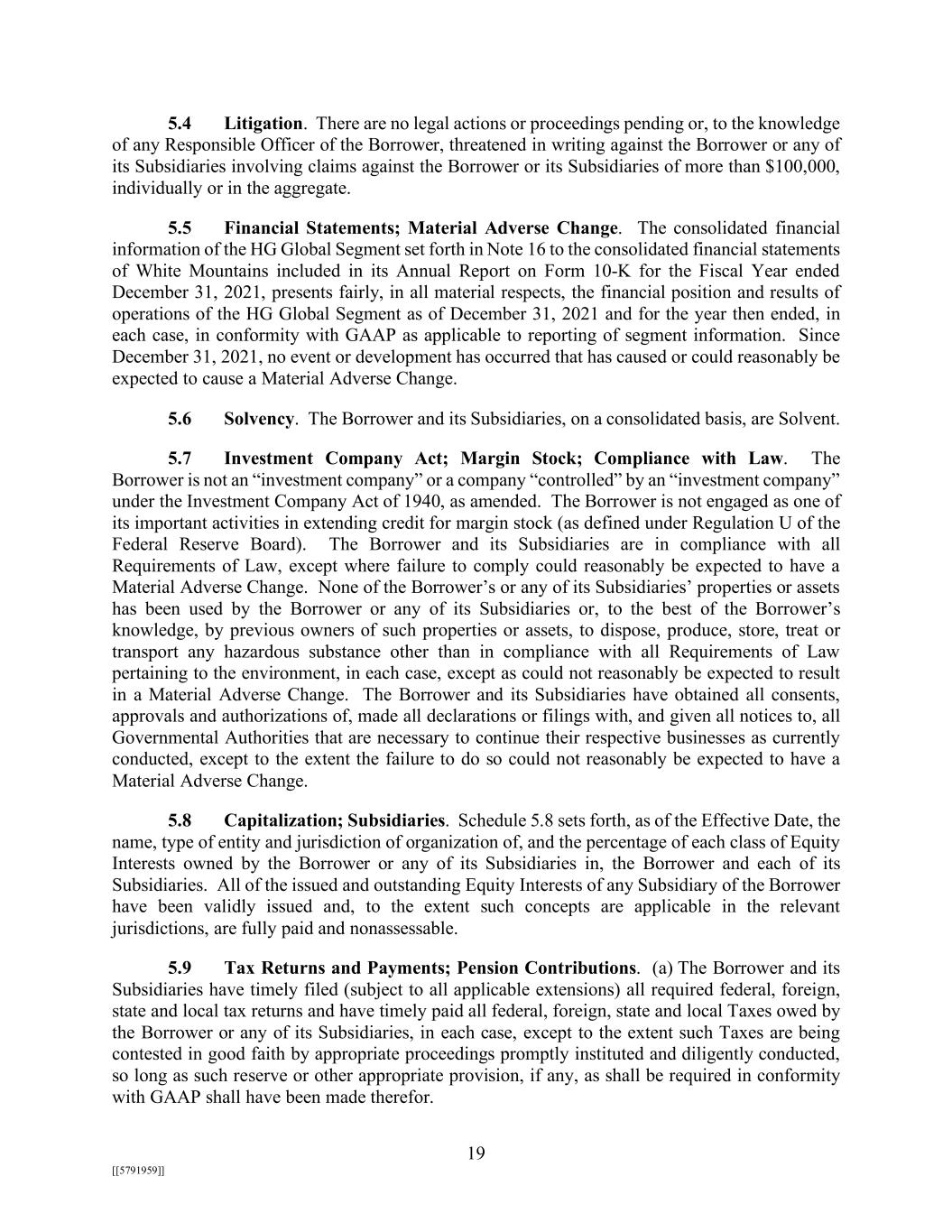19 [[5791959]] 5.4 Litigation. There are no legal actions or proceedings pending or, to the knowledge of any Responsible Officer of the Borrower, threatened in writing against the Borrower or any of its Subsidiaries involving claims against the Borrower or its Subsidiaries of more than $100,000, individually or in the aggregate. 5.5 Financial Statements; Material Adverse Change. The consolidated financial information of the HG Global Segment set forth in Note 16 to the consolidated financial statements of White Mountains included in its Annual Report on Form 10-K for the Fiscal Year ended December 31, 2021, presents fairly, in all material respects, the financial position and results of operations of the HG Global Segment as of December 31, 2021 and for the year then ended, in each case, in conformity with GAAP as applicable to reporting of segment information. Since December 31, 2021, no event or development has occurred that has caused or could reasonably be expected to cause a Material Adverse Change. 5.6 Solvency. The Borrower and its Subsidiaries, on a consolidated basis, are Solvent. 5.7 Investment Company Act; Margin Stock; Compliance with Law. The Borrower is not an “investment company” or a company “controlled” by an “investment company” under the Investment Company Act of 1940, as amended. The Borrower is not engaged as one of its important activities in extending credit for margin stock (as defined under Regulation U of the Federal Reserve Board). The Borrower and its Subsidiaries are in compliance with all Requirements of Law, except where failure to comply could reasonably be expected to have a Material Adverse Change. None of the Borrower’s or any of its Subsidiaries’ properties or assets has been used by the Borrower or any of its Subsidiaries or, to the best of the Borrower’s knowledge, by previous owners of such properties or assets, to dispose, produce, store, treat or transport any hazardous substance other than in compliance with all Requirements of Law pertaining to the environment, in each case, except as could not reasonably be expected to result in a Material Adverse Change. The Borrower and its Subsidiaries have obtained all consents, approvals and authorizations of, made all declarations or filings with, and given all notices to, all Governmental Authorities that are necessary to continue their respective businesses as currently conducted, except to the extent the failure to do so could not reasonably be expected to have a Material Adverse Change. 5.8 Capitalization; Subsidiaries. Schedule 5.8 sets forth, as of the Effective Date, the name, type of entity and jurisdiction of organization of, and the percentage of each class of Equity Interests owned by the Borrower or any of its Subsidiaries in, the Borrower and each of its Subsidiaries. All of the issued and outstanding Equity Interests of any Subsidiary of the Borrower have been validly issued and, to the extent such concepts are applicable in the relevant jurisdictions, are fully paid and nonassessable. 5.9 Tax Returns and Payments; Pension Contributions. (a) The Borrower and its Subsidiaries have timely filed (subject to all applicable extensions) all required federal, foreign, state and local tax returns and have timely paid all federal, foreign, state and local Taxes owed by the Borrower or any of its Subsidiaries, in each case, except to the extent such Taxes are being contested in good faith by appropriate proceedings promptly instituted and diligently conducted, so long as such reserve or other appropriate provision, if any, as shall be required in conformity with GAAP shall have been made therefor.