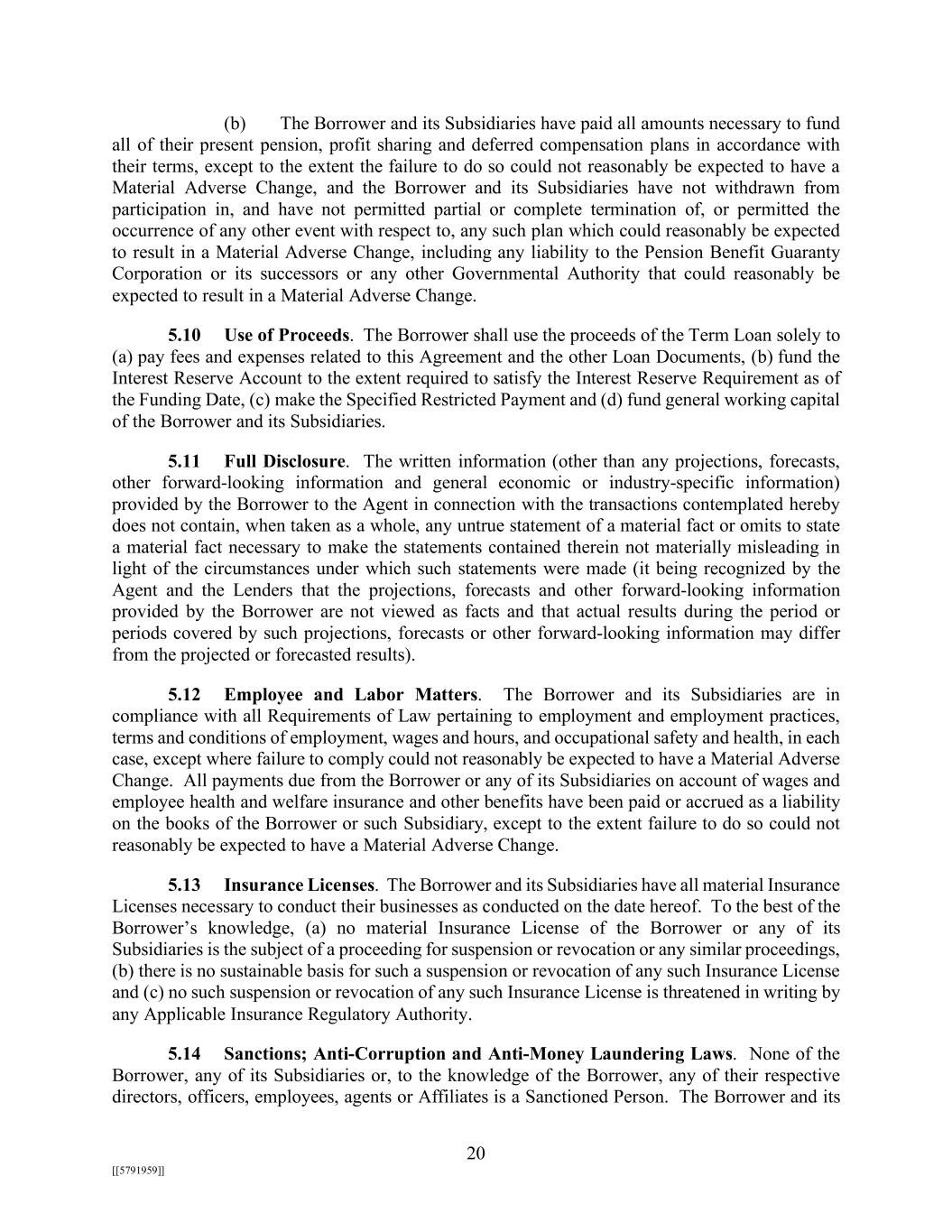 20 [[5791959]] (b) The Borrower and its Subsidiaries have paid all amounts necessary to fund all of their present pension, profit sharing and deferred compensation plans in accordance with their terms, except to the extent the failure to do so could not reasonably be expected to have a Material Adverse Change, and the Borrower and its Subsidiaries have not withdrawn from participation in, and have not permitted partial or complete termination of, or permitted the occurrence of any other event with respect to, any such plan which could reasonably be expected to result in a Material Adverse Change, including any liability to the Pension Benefit Guaranty Corporation or its successors or any other Governmental Authority that could reasonably be expected to result in a Material Adverse Change. 5.10 Use of Proceeds. The Borrower shall use the proceeds of the Term Loan solely to (a) pay fees and expenses related to this Agreement and the other Loan Documents, (b) fund the Interest Reserve Account to the extent required to satisfy the Interest Reserve Requirement as of the Funding Date, (c) make the Specified Restricted Payment and (d) fund general working capital of the Borrower and its Subsidiaries. 5.11 Full Disclosure. The written information (other than any projections, forecasts, other forward-looking information and general economic or industry-specific information) provided by the Borrower to the Agent in connection with the transactions contemplated hereby does not contain, when taken as a whole, any untrue statement of a material fact or omits to state a material fact necessary to make the statements contained therein not materially misleading in light of the circumstances under which such statements were made (it being recognized by the Agent and the Lenders that the projections, forecasts and other forward-looking information provided by the Borrower are not viewed as facts and that actual results during the period or periods covered by such projections, forecasts or other forward-looking information may differ from the projected or forecasted results). 5.12 Employee and Labor Matters. The Borrower and its Subsidiaries are in compliance with all Requirements of Law pertaining to employment and employment practices, terms and conditions of employment, wages and hours, and occupational safety and health, in each case, except where failure to comply could not reasonably be expected to have a Material Adverse Change. All payments due from the Borrower or any of its Subsidiaries on account of wages and employee health and welfare insurance and other benefits have been paid or accrued as a liability on the books of the Borrower or such Subsidiary, except to the extent failure to do so could not reasonably be expected to have a Material Adverse Change. 5.13 Insurance Licenses. The Borrower and its Subsidiaries have all material Insurance Licenses necessary to conduct their businesses as conducted on the date hereof. To the best of the Borrower’s knowledge, (a) no material Insurance License of the Borrower or any of its Subsidiaries is the subject of a proceeding for suspension or revocation or any similar proceedings, (b) there is no sustainable basis for such a suspension or revocation of any such Insurance License and (c) no such suspension or revocation of any such Insurance License is threatened in writing by any Applicable Insurance Regulatory Authority. 5.14 Sanctions; Anti-Corruption and Anti-Money Laundering Laws. None of the Borrower, any of its Subsidiaries or, to the knowledge of the Borrower, any of their respective directors, officers, employees, agents or Affiliates is a Sanctioned Person. The Borrower and its