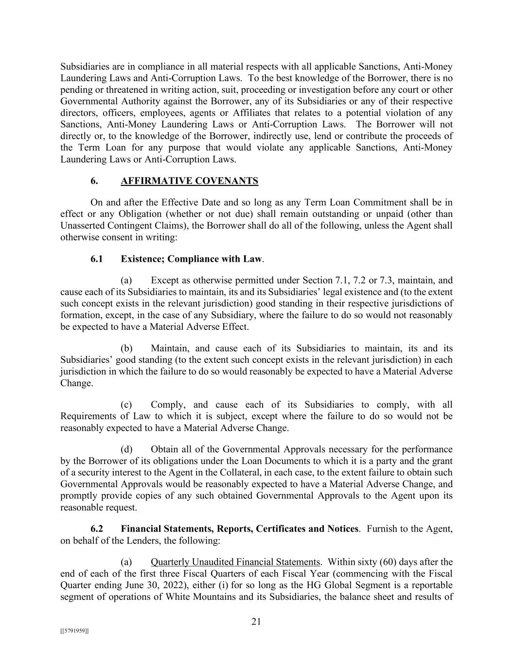 21 [[5791959]] Subsidiaries are in compliance in all material respects with all applicable Sanctions, Anti-Money Laundering Laws and Anti-Corruption Laws. To the best knowledge of the Borrower, there is no pending or threatened in writing action, suit, proceeding or investigation before any court or other Governmental Authority against the Borrower, any of its Subsidiaries or any of their respective directors, officers, employees, agents or Affiliates that relates to a potential violation of any Sanctions, Anti-Money Laundering Laws or Anti-Corruption Laws. The Borrower will not directly or, to the knowledge of the Borrower, indirectly use, lend or contribute the proceeds of the Term Loan for any purpose that would violate any applicable Sanctions, Anti-Money Laundering Laws or Anti-Corruption Laws. 6. AFFIRMATIVE COVENANTS On and after the Effective Date and so long as any Term Loan Commitment shall be in effect or any Obligation (whether or not due) shall remain outstanding or unpaid (other than Unasserted Contingent Claims), the Borrower shall do all of the following, unless the Agent shall otherwise consent in writing: 6.1 Existence; Compliance with Law. (a) Except as otherwise permitted under Section 7.1, 7.2 or 7.3, maintain, and cause each of its Subsidiaries to maintain, its and its Subsidiaries’ legal existence and (to the extent such concept exists in the relevant jurisdiction) good standing in their respective jurisdictions of formation, except, in the case of any Subsidiary, where the failure to do so would not reasonably be expected to have a Material Adverse Effect. (b) Maintain, and cause each of its Subsidiaries to maintain, its and its Subsidiaries’ good standing (to the extent such concept exists in the relevant jurisdiction) in each jurisdiction in which the failure to do so would reasonably be expected to have a Material Adverse Change. (c) Comply, and cause each of its Subsidiaries to comply, with all Requirements of Law to which it is subject, except where the failure to do so would not be reasonably expected to have a Material Adverse Change. (d) Obtain all of the Governmental Approvals necessary for the performance by the Borrower of its obligations under the Loan Documents to which it is a party and the grant of a security interest to the Agent in the Collateral, in each case, to the extent failure to obtain such Governmental Approvals would be reasonably expected to have a Material Adverse Change, and promptly provide copies of any such obtained Governmental Approvals to the Agent upon its reasonable request. 6.2 Financial Statements, Reports, Certificates and Notices. Furnish to the Agent, on behalf of the Lenders, the following: (a) Quarterly Unaudited Financial Statements. Within sixty (60) days after the end of each of the first three Fiscal Quarters of each Fiscal Year (commencing with the Fiscal Quarter ending June 30, 2022), either (i) for so long as the HG Global Segment is a reportable segment of operations of White Mountains and its Subsidiaries, the balance sheet and results of