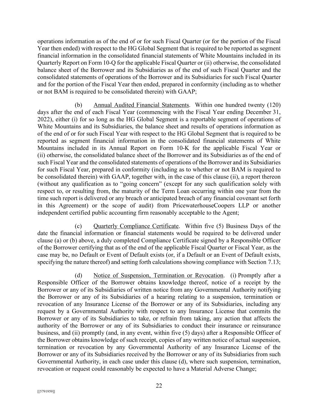 22 [[5791959]] operations information as of the end of or for such Fiscal Quarter (or for the portion of the Fiscal Year then ended) with respect to the HG Global Segment that is required to be reported as segment financial information in the consolidated financial statements of White Mountains included in its Quarterly Report on Form 10-Q for the applicable Fiscal Quarter or (ii) otherwise, the consolidated balance sheet of the Borrower and its Subsidiaries as of the end of such Fiscal Quarter and the consolidated statements of operations of the Borrower and its Subsidiaries for such Fiscal Quarter and for the portion of the Fiscal Year then ended, prepared in conformity (including as to whether or not BAM is required to be consolidated therein) with GAAP; (b) Annual Audited Financial Statements. Within one hundred twenty (120) days after the end of each Fiscal Year (commencing with the Fiscal Year ending December 31, 2022), either (i) for so long as the HG Global Segment is a reportable segment of operations of White Mountains and its Subsidiaries, the balance sheet and results of operations information as of the end of or for such Fiscal Year with respect to the HG Global Segment that is required to be reported as segment financial information in the consolidated financial statements of White Mountains included in its Annual Report on Form 10-K for the applicable Fiscal Year or (ii) otherwise, the consolidated balance sheet of the Borrower and its Subsidiaries as of the end of such Fiscal Year and the consolidated statements of operations of the Borrower and its Subsidiaries for such Fiscal Year, prepared in conformity (including as to whether or not BAM is required to be consolidated therein) with GAAP, together with, in the case of this clause (ii), a report thereon (without any qualification as to “going concern” (except for any such qualification solely with respect to, or resulting from, the maturity of the Term Loan occurring within one year from the time such report is delivered or any breach or anticipated breach of any financial covenant set forth in this Agreement) or the scope of audit) from PricewaterhouseCoopers LLP or another independent certified public accounting firm reasonably acceptable to the Agent; (c) Quarterly Compliance Certificate. Within five (5) Business Days of the date the financial information or financial statements would be required to be delivered under clause (a) or (b) above, a duly completed Compliance Certificate signed by a Responsible Officer of the Borrower certifying that as of the end of the applicable Fiscal Quarter or Fiscal Year, as the case may be, no Default or Event of Default exists (or, if a Default or an Event of Default exists, specifying the nature thereof) and setting forth calculations showing compliance with Section 7.13; (d) Notice of Suspension, Termination or Revocation. (i) Promptly after a Responsible Officer of the Borrower obtains knowledge thereof, notice of a receipt by the Borrower or any of its Subsidiaries of written notice from any Governmental Authority notifying the Borrower or any of its Subsidiaries of a hearing relating to a suspension, termination or revocation of any Insurance License of the Borrower or any of its Subsidiaries, including any request by a Governmental Authority with respect to any Insurance License that commits the Borrower or any of its Subsidiaries to take, or refrain from taking, any action that affects the authority of the Borrower or any of its Subsidiaries to conduct their insurance or reinsurance business, and (ii) promptly (and, in any event, within five (5) days) after a Responsible Officer of the Borrower obtains knowledge of such receipt, copies of any written notice of actual suspension, termination or revocation by any Governmental Authority of any Insurance License of the Borrower or any of its Subsidiaries received by the Borrower or any of its Subsidiaries from such Governmental Authority, in each case under this clause (d), where such suspension, termination, revocation or request could reasonably be expected to have a Material Adverse Change;