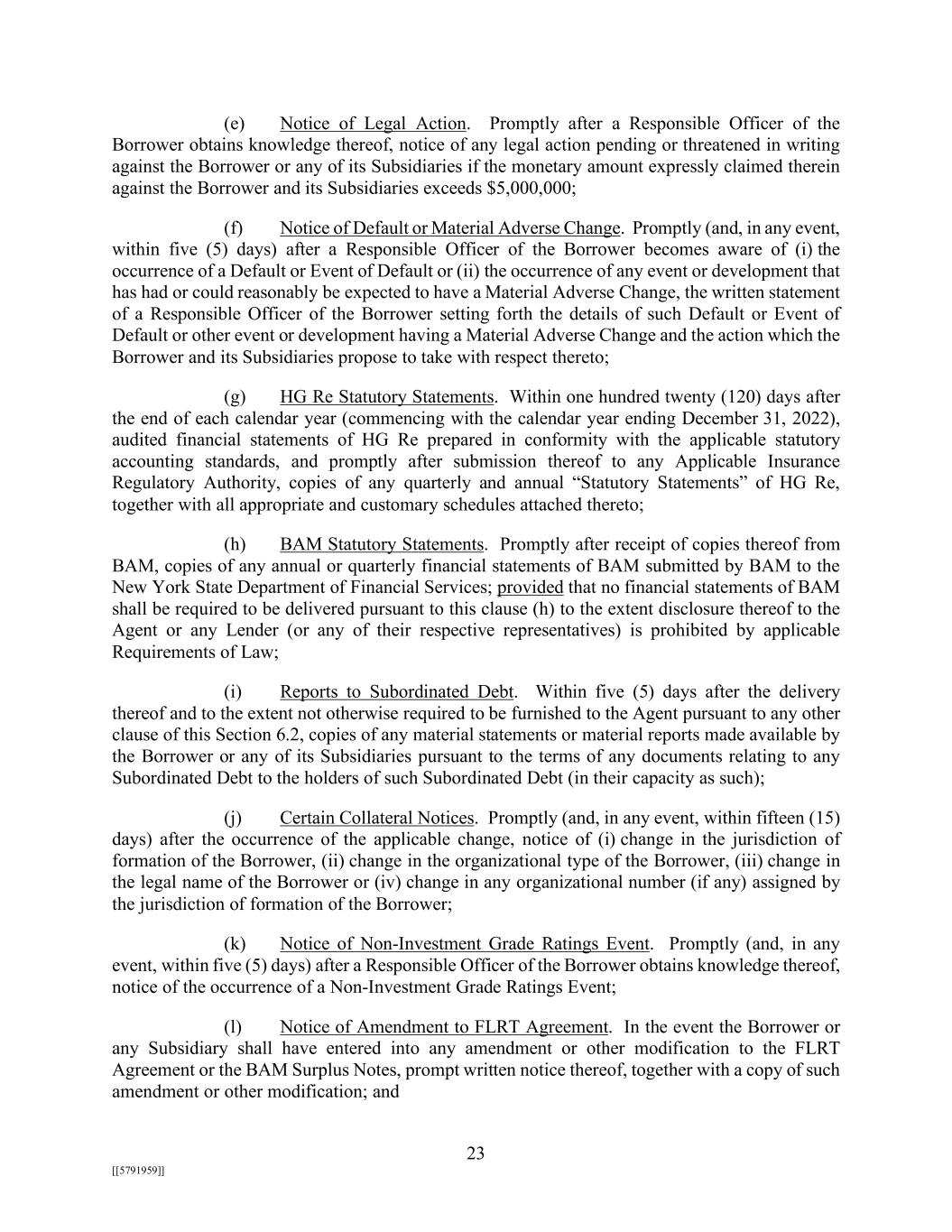 23 [[5791959]] (e) Notice of Legal Action. Promptly after a Responsible Officer of the Borrower obtains knowledge thereof, notice of any legal action pending or threatened in writing against the Borrower or any of its Subsidiaries if the monetary amount expressly claimed therein against the Borrower and its Subsidiaries exceeds $5,000,000; (f) Notice of Default or Material Adverse Change. Promptly (and, in any event, within five (5) days) after a Responsible Officer of the Borrower becomes aware of (i) the occurrence of a Default or Event of Default or (ii) the occurrence of any event or development that has had or could reasonably be expected to have a Material Adverse Change, the written statement of a Responsible Officer of the Borrower setting forth the details of such Default or Event of Default or other event or development having a Material Adverse Change and the action which the Borrower and its Subsidiaries propose to take with respect thereto; (g) HG Re Statutory Statements. Within one hundred twenty (120) days after the end of each calendar year (commencing with the calendar year ending December 31, 2022), audited financial statements of HG Re prepared in conformity with the applicable statutory accounting standards, and promptly after submission thereof to any Applicable Insurance Regulatory Authority, copies of any quarterly and annual “Statutory Statements” of HG Re, together with all appropriate and customary schedules attached thereto; (h) BAM Statutory Statements. Promptly after receipt of copies thereof from BAM, copies of any annual or quarterly financial statements of BAM submitted by BAM to the New York State Department of Financial Services; provided that no financial statements of BAM shall be required to be delivered pursuant to this clause (h) to the extent disclosure thereof to the Agent or any Lender (or any of their respective representatives) is prohibited by applicable Requirements of Law; (i) Reports to Subordinated Debt. Within five (5) days after the delivery thereof and to the extent not otherwise required to be furnished to the Agent pursuant to any other clause of this Section 6.2, copies of any material statements or material reports made available by the Borrower or any of its Subsidiaries pursuant to the terms of any documents relating to any Subordinated Debt to the holders of such Subordinated Debt (in their capacity as such); (j) Certain Collateral Notices. Promptly (and, in any event, within fifteen (15) days) after the occurrence of the applicable change, notice of (i) change in the jurisdiction of formation of the Borrower, (ii) change in the organizational type of the Borrower, (iii) change in the legal name of the Borrower or (iv) change in any organizational number (if any) assigned by the jurisdiction of formation of the Borrower; (k) Notice of Non-Investment Grade Ratings Event. Promptly (and, in any event, within five (5) days) after a Responsible Officer of the Borrower obtains knowledge thereof, notice of the occurrence of a Non-Investment Grade Ratings Event; (l) Notice of Amendment to FLRT Agreement. In the event the Borrower or any Subsidiary shall have entered into any amendment or other modification to the FLRT Agreement or the BAM Surplus Notes, prompt written notice thereof, together with a copy of such amendment or other modification; and