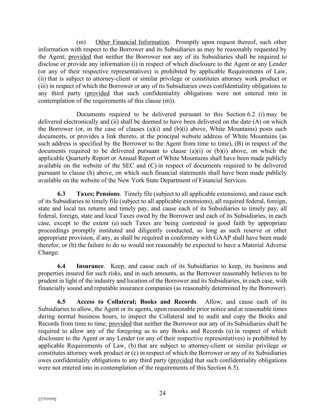 24 [[5791959]] (m) Other Financial Information. Promptly upon request thereof, such other information with respect to the Borrower and its Subsidiaries as may be reasonably requested by the Agent; provided that neither the Borrower nor any of its Subsidiaries shall be required to disclose or provide any information (i) in respect of which disclosure to the Agent or any Lender (or any of their respective representatives) is prohibited by applicable Requirements of Law, (ii) that is subject to attorney-client or similar privilege or constitutes attorney work product or (iii) in respect of which the Borrower or any of its Subsidiaries owes confidentiality obligations to any third party (provided that such confidentiality obligations were not entered into in contemplation of the requirements of this clause (m)). Documents required to be delivered pursuant to this Section 6.2 (i) may be delivered electronically and (ii) shall be deemed to have been delivered on the date (A) on which the Borrower (or, in the case of clauses (a)(i) and (b)(i) above, White Mountains) posts such documents, or provides a link thereto, at the principal website address of White Mountains (as such address is specified by the Borrower to the Agent from time to time), (B) in respect of the documents required to be delivered pursuant to clause (a)(i) or (b)(i) above, on which the applicable Quarterly Report or Annual Report of White Mountains shall have been made publicly available on the website of the SEC and (C) in respect of documents required to be delivered pursuant to clause (h) above, on which such financial statements shall have been made publicly available on the website of the New York State Department of Financial Services. 6.3 Taxes; Pensions. Timely file (subject to all applicable extensions), and cause each of its Subsidiaries to timely file (subject to all applicable extensions), all required federal, foreign, state and local tax returns and timely pay, and cause each of its Subsidiaries to timely pay, all federal, foreign, state and local Taxes owed by the Borrower and each of its Subsidiaries, in each case, except to the extent (a) such Taxes are being contested in good faith by appropriate proceedings promptly instituted and diligently conducted, so long as such reserve or other appropriate provision, if any, as shall be required in conformity with GAAP shall have been made therefor, or (b) the failure to do so would not reasonably be expected to have a Material Adverse Change. 6.4 Insurance. Keep, and cause each of its Subsidiaries to keep, its business and properties insured for such risks, and in such amounts, as the Borrower reasonably believes to be prudent in light of the industry and location of the Borrower and its Subsidiaries, in each case, with financially sound and reputable insurance companies (as reasonably determined by the Borrower). 6.5 Access to Collateral; Books and Records. Allow, and cause each of its Subsidiaries to allow, the Agent or its agents, upon reasonable prior notice and at reasonable times during normal business hours, to inspect the Collateral and to audit and copy the Books and Records from time to time; provided that neither the Borrower nor any of its Subsidiaries shall be required to allow any of the foregoing as to any Books and Records (a) in respect of which disclosure to the Agent or any Lender (or any of their respective representatives) is prohibited by applicable Requirements of Law, (b) that are subject to attorney-client or similar privilege or constitutes attorney work product or (c) in respect of which the Borrower or any of its Subsidiaries owes confidentiality obligations to any third party (provided that such confidentiality obligations were not entered into in contemplation of the requirements of this Section 6.5).