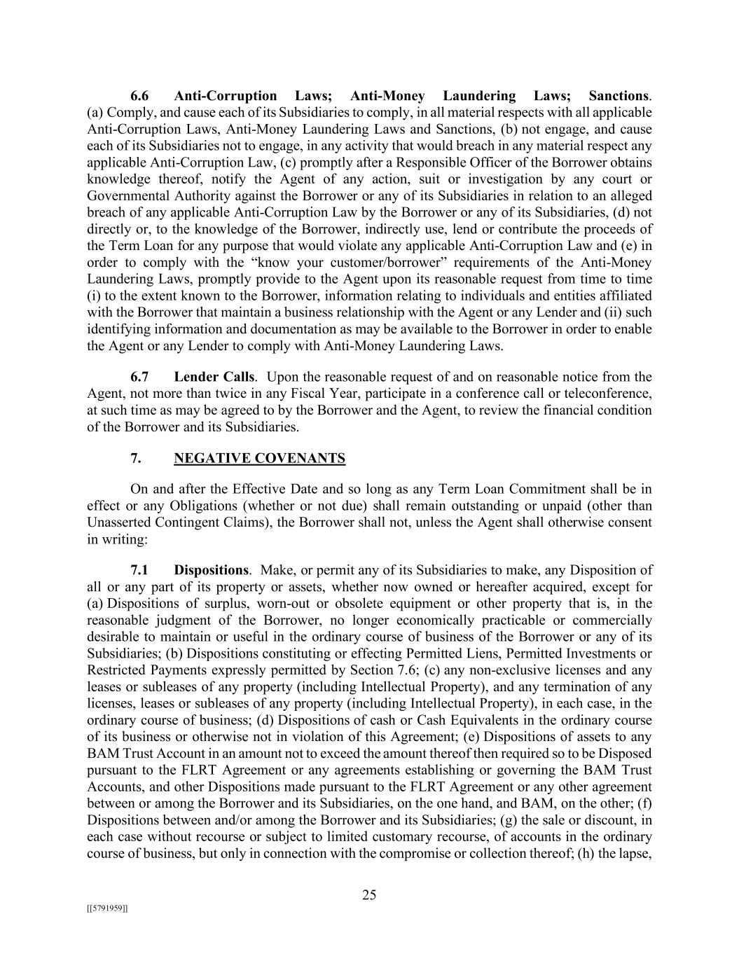 25 [[5791959]] 6.6 Anti-Corruption Laws; Anti-Money Laundering Laws; Sanctions. (a) Comply, and cause each of its Subsidiaries to comply, in all material respects with all applicable Anti-Corruption Laws, Anti-Money Laundering Laws and Sanctions, (b) not engage, and cause each of its Subsidiaries not to engage, in any activity that would breach in any material respect any applicable Anti-Corruption Law, (c) promptly after a Responsible Officer of the Borrower obtains knowledge thereof, notify the Agent of any action, suit or investigation by any court or Governmental Authority against the Borrower or any of its Subsidiaries in relation to an alleged breach of any applicable Anti-Corruption Law by the Borrower or any of its Subsidiaries, (d) not directly or, to the knowledge of the Borrower, indirectly use, lend or contribute the proceeds of the Term Loan for any purpose that would violate any applicable Anti-Corruption Law and (e) in order to comply with the “know your customer/borrower” requirements of the Anti-Money Laundering Laws, promptly provide to the Agent upon its reasonable request from time to time (i) to the extent known to the Borrower, information relating to individuals and entities affiliated with the Borrower that maintain a business relationship with the Agent or any Lender and (ii) such identifying information and documentation as may be available to the Borrower in order to enable the Agent or any Lender to comply with Anti-Money Laundering Laws. 6.7 Lender Calls. Upon the reasonable request of and on reasonable notice from the Agent, not more than twice in any Fiscal Year, participate in a conference call or teleconference, at such time as may be agreed to by the Borrower and the Agent, to review the financial condition of the Borrower and its Subsidiaries. 7. NEGATIVE COVENANTS On and after the Effective Date and so long as any Term Loan Commitment shall be in effect or any Obligations (whether or not due) shall remain outstanding or unpaid (other than Unasserted Contingent Claims), the Borrower shall not, unless the Agent shall otherwise consent in writing: 7.1 Dispositions. Make, or permit any of its Subsidiaries to make, any Disposition of all or any part of its property or assets, whether now owned or hereafter acquired, except for (a) Dispositions of surplus, worn-out or obsolete equipment or other property that is, in the reasonable judgment of the Borrower, no longer economically practicable or commercially desirable to maintain or useful in the ordinary course of business of the Borrower or any of its Subsidiaries; (b) Dispositions constituting or effecting Permitted Liens, Permitted Investments or Restricted Payments expressly permitted by Section 7.6; (c) any non-exclusive licenses and any leases or subleases of any property (including Intellectual Property), and any termination of any licenses, leases or subleases of any property (including Intellectual Property), in each case, in the ordinary course of business; (d) Dispositions of cash or Cash Equivalents in the ordinary course of its business or otherwise not in violation of this Agreement; (e) Dispositions of assets to any BAM Trust Account in an amount not to exceed the amount thereof then required so to be Disposed pursuant to the FLRT Agreement or any agreements establishing or governing the BAM Trust Accounts, and other Dispositions made pursuant to the FLRT Agreement or any other agreement between or among the Borrower and its Subsidiaries, on the one hand, and BAM, on the other; (f) Dispositions between and/or among the Borrower and its Subsidiaries; (g) the sale or discount, in each case without recourse or subject to limited customary recourse, of accounts in the ordinary course of business, but only in connection with the compromise or collection thereof; (h) the lapse,