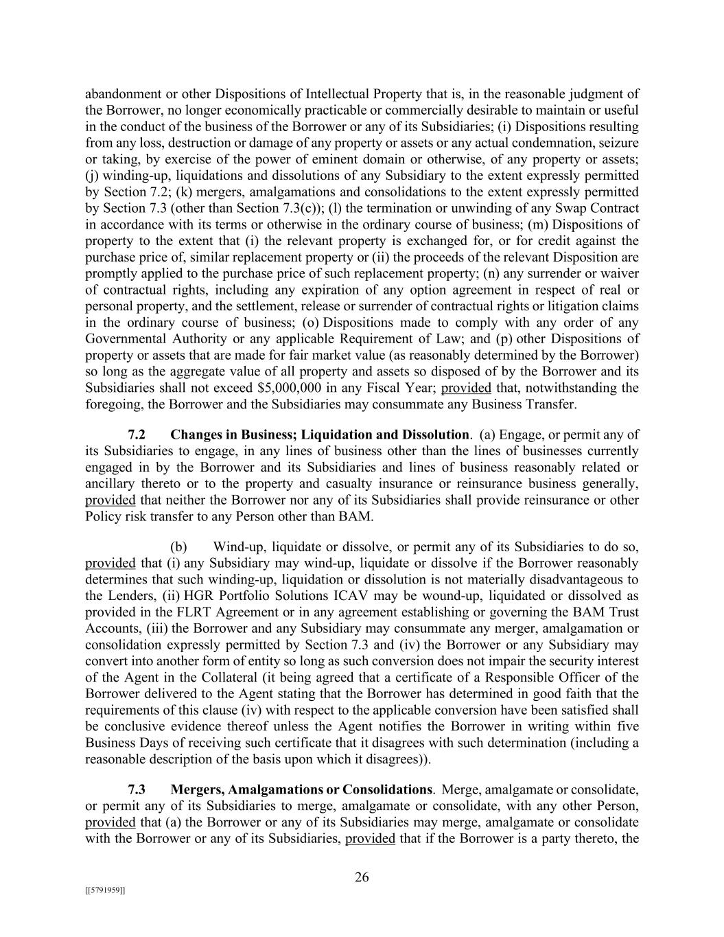 26 [[5791959]] abandonment or other Dispositions of Intellectual Property that is, in the reasonable judgment of the Borrower, no longer economically practicable or commercially desirable to maintain or useful in the conduct of the business of the Borrower or any of its Subsidiaries; (i) Dispositions resulting from any loss, destruction or damage of any property or assets or any actual condemnation, seizure or taking, by exercise of the power of eminent domain or otherwise, of any property or assets; (j) winding-up, liquidations and dissolutions of any Subsidiary to the extent expressly permitted by Section 7.2; (k) mergers, amalgamations and consolidations to the extent expressly permitted by Section 7.3 (other than Section 7.3(c)); (l) the termination or unwinding of any Swap Contract in accordance with its terms or otherwise in the ordinary course of business; (m) Dispositions of property to the extent that (i) the relevant property is exchanged for, or for credit against the purchase price of, similar replacement property or (ii) the proceeds of the relevant Disposition are promptly applied to the purchase price of such replacement property; (n) any surrender or waiver of contractual rights, including any expiration of any option agreement in respect of real or personal property, and the settlement, release or surrender of contractual rights or litigation claims in the ordinary course of business; (o) Dispositions made to comply with any order of any Governmental Authority or any applicable Requirement of Law; and (p) other Dispositions of property or assets that are made for fair market value (as reasonably determined by the Borrower) so long as the aggregate value of all property and assets so disposed of by the Borrower and its Subsidiaries shall not exceed $5,000,000 in any Fiscal Year; provided that, notwithstanding the foregoing, the Borrower and the Subsidiaries may consummate any Business Transfer. 7.2 Changes in Business; Liquidation and Dissolution. (a) Engage, or permit any of its Subsidiaries to engage, in any lines of business other than the lines of businesses currently engaged in by the Borrower and its Subsidiaries and lines of business reasonably related or ancillary thereto or to the property and casualty insurance or reinsurance business generally, provided that neither the Borrower nor any of its Subsidiaries shall provide reinsurance or other Policy risk transfer to any Person other than BAM. (b) Wind-up, liquidate or dissolve, or permit any of its Subsidiaries to do so, provided that (i) any Subsidiary may wind-up, liquidate or dissolve if the Borrower reasonably determines that such winding-up, liquidation or dissolution is not materially disadvantageous to the Lenders, (ii) HGR Portfolio Solutions ICAV may be wound-up, liquidated or dissolved as provided in the FLRT Agreement or in any agreement establishing or governing the BAM Trust Accounts, (iii) the Borrower and any Subsidiary may consummate any merger, amalgamation or consolidation expressly permitted by Section 7.3 and (iv) the Borrower or any Subsidiary may convert into another form of entity so long as such conversion does not impair the security interest of the Agent in the Collateral (it being agreed that a certificate of a Responsible Officer of the Borrower delivered to the Agent stating that the Borrower has determined in good faith that the requirements of this clause (iv) with respect to the applicable conversion have been satisfied shall be conclusive evidence thereof unless the Agent notifies the Borrower in writing within five Business Days of receiving such certificate that it disagrees with such determination (including a reasonable description of the basis upon which it disagrees)). 7.3 Mergers, Amalgamations or Consolidations. Merge, amalgamate or consolidate, or permit any of its Subsidiaries to merge, amalgamate or consolidate, with any other Person, provided that (a) the Borrower or any of its Subsidiaries may merge, amalgamate or consolidate with the Borrower or any of its Subsidiaries, provided that if the Borrower is a party thereto, the