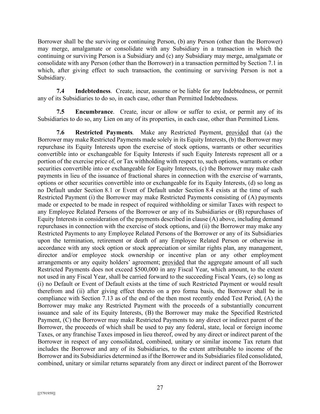 27 [[5791959]] Borrower shall be the surviving or continuing Person, (b) any Person (other than the Borrower) may merge, amalgamate or consolidate with any Subsidiary in a transaction in which the continuing or surviving Person is a Subsidiary and (c) any Subsidiary may merge, amalgamate or consolidate with any Person (other than the Borrower) in a transaction permitted by Section 7.1 in which, after giving effect to such transaction, the continuing or surviving Person is not a Subsidiary. 7.4 Indebtedness. Create, incur, assume or be liable for any Indebtedness, or permit any of its Subsidiaries to do so, in each case, other than Permitted Indebtedness. 7.5 Encumbrance. Create, incur or allow or suffer to exist, or permit any of its Subsidiaries to do so, any Lien on any of its properties, in each case, other than Permitted Liens. 7.6 Restricted Payments. Make any Restricted Payment, provided that (a) the Borrower may make Restricted Payments made solely in its Equity Interests, (b) the Borrower may repurchase its Equity Interests upon the exercise of stock options, warrants or other securities convertible into or exchangeable for Equity Interests if such Equity Interests represent all or a portion of the exercise price of, or Tax withholding with respect to, such options, warrants or other securities convertible into or exchangeable for Equity Interests, (c) the Borrower may make cash payments in lieu of the issuance of fractional shares in connection with the exercise of warrants, options or other securities convertible into or exchangeable for its Equity Interests, (d) so long as no Default under Section 8.1 or Event of Default under Section 8.4 exists at the time of such Restricted Payment (i) the Borrower may make Restricted Payments consisting of (A) payments made or expected to be made in respect of required withholding or similar Taxes with respect to any Employee Related Persons of the Borrower or any of its Subsidiaries or (B) repurchases of Equity Interests in consideration of the payments described in clause (A) above, including demand repurchases in connection with the exercise of stock options, and (ii) the Borrower may make any Restricted Payments to any Employee Related Persons of the Borrower or any of its Subsidiaries upon the termination, retirement or death of any Employee Related Person or otherwise in accordance with any stock option or stock appreciation or similar rights plan, any management, director and/or employee stock ownership or incentive plan or any other employment arrangements or any equity holders’ agreement; provided that the aggregate amount of all such Restricted Payments does not exceed $500,000 in any Fiscal Year, which amount, to the extent not used in any Fiscal Year, shall be carried forward to the succeeding Fiscal Years, (e) so long as (i) no Default or Event of Default exists at the time of such Restricted Payment or would result therefrom and (ii) after giving effect thereto on a pro forma basis, the Borrower shall be in compliance with Section 7.13 as of the end of the then most recently ended Test Period, (A) the Borrower may make any Restricted Payment with the proceeds of a substantially concurrent issuance and sale of its Equity Interests, (B) the Borrower may make the Specified Restricted Payment, (C) the Borrower may make Restricted Payments to any direct or indirect parent of the Borrower, the proceeds of which shall be used to pay any federal, state, local or foreign income Taxes, or any franchise Taxes imposed in lieu thereof, owed by any direct or indirect parent of the Borrower in respect of any consolidated, combined, unitary or similar income Tax return that includes the Borrower and any of its Subsidiaries, to the extent attributable to income of the Borrower and its Subsidiaries determined as if the Borrower and its Subsidiaries filed consolidated, combined, unitary or similar returns separately from any direct or indirect parent of the Borrower