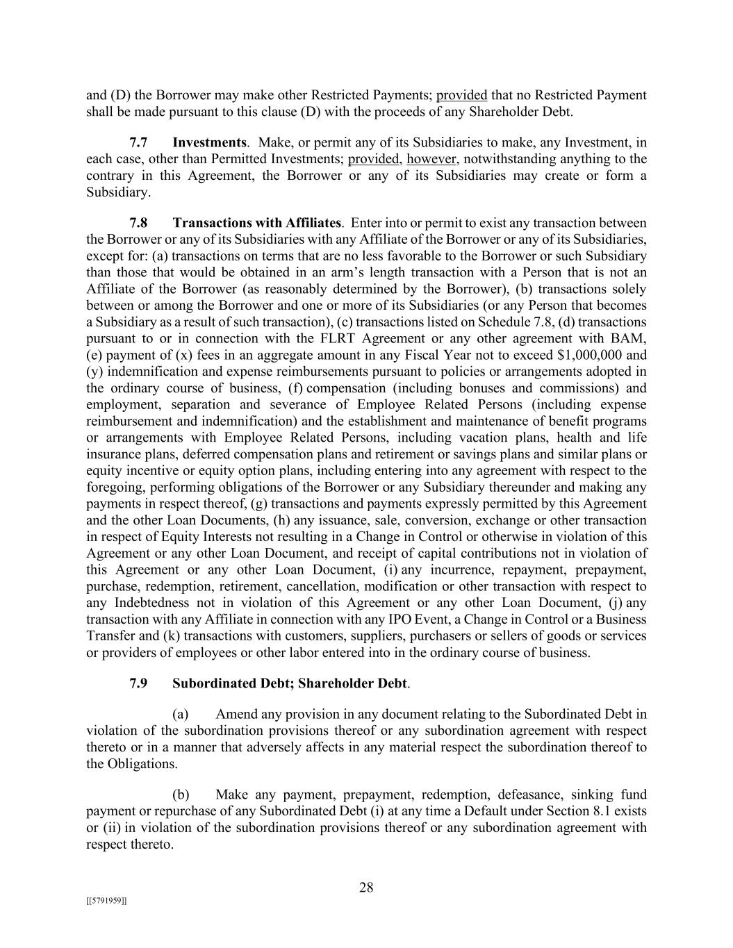 28 [[5791959]] and (D) the Borrower may make other Restricted Payments; provided that no Restricted Payment shall be made pursuant to this clause (D) with the proceeds of any Shareholder Debt. 7.7 Investments. Make, or permit any of its Subsidiaries to make, any Investment, in each case, other than Permitted Investments; provided, however, notwithstanding anything to the contrary in this Agreement, the Borrower or any of its Subsidiaries may create or form a Subsidiary. 7.8 Transactions with Affiliates. Enter into or permit to exist any transaction between the Borrower or any of its Subsidiaries with any Affiliate of the Borrower or any of its Subsidiaries, except for: (a) transactions on terms that are no less favorable to the Borrower or such Subsidiary than those that would be obtained in an arm’s length transaction with a Person that is not an Affiliate of the Borrower (as reasonably determined by the Borrower), (b) transactions solely between or among the Borrower and one or more of its Subsidiaries (or any Person that becomes a Subsidiary as a result of such transaction), (c) transactions listed on Schedule 7.8, (d) transactions pursuant to or in connection with the FLRT Agreement or any other agreement with BAM, (e) payment of (x) fees in an aggregate amount in any Fiscal Year not to exceed $1,000,000 and (y) indemnification and expense reimbursements pursuant to policies or arrangements adopted in the ordinary course of business, (f) compensation (including bonuses and commissions) and employment, separation and severance of Employee Related Persons (including expense reimbursement and indemnification) and the establishment and maintenance of benefit programs or arrangements with Employee Related Persons, including vacation plans, health and life insurance plans, deferred compensation plans and retirement or savings plans and similar plans or equity incentive or equity option plans, including entering into any agreement with respect to the foregoing, performing obligations of the Borrower or any Subsidiary thereunder and making any payments in respect thereof, (g) transactions and payments expressly permitted by this Agreement and the other Loan Documents, (h) any issuance, sale, conversion, exchange or other transaction in respect of Equity Interests not resulting in a Change in Control or otherwise in violation of this Agreement or any other Loan Document, and receipt of capital contributions not in violation of this Agreement or any other Loan Document, (i) any incurrence, repayment, prepayment, purchase, redemption, retirement, cancellation, modification or other transaction with respect to any Indebtedness not in violation of this Agreement or any other Loan Document, (j) any transaction with any Affiliate in connection with any IPO Event, a Change in Control or a Business Transfer and (k) transactions with customers, suppliers, purchasers or sellers of goods or services or providers of employees or other labor entered into in the ordinary course of business. 7.9 Subordinated Debt; Shareholder Debt. (a) Amend any provision in any document relating to the Subordinated Debt in violation of the subordination provisions thereof or any subordination agreement with respect thereto or in a manner that adversely affects in any material respect the subordination thereof to the Obligations. (b) Make any payment, prepayment, redemption, defeasance, sinking fund payment or repurchase of any Subordinated Debt (i) at any time a Default under Section 8.1 exists or (ii) in violation of the subordination provisions thereof or any subordination agreement with respect thereto.
