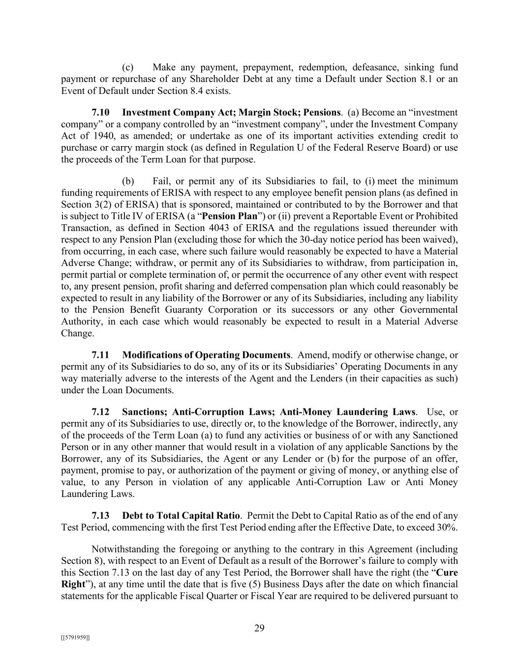 29 [[5791959]] (c) Make any payment, prepayment, redemption, defeasance, sinking fund payment or repurchase of any Shareholder Debt at any time a Default under Section 8.1 or an Event of Default under Section 8.4 exists. 7.10 Investment Company Act; Margin Stock; Pensions. (a) Become an “investment company” or a company controlled by an “investment company”, under the Investment Company Act of 1940, as amended; or undertake as one of its important activities extending credit to purchase or carry margin stock (as defined in Regulation U of the Federal Reserve Board) or use the proceeds of the Term Loan for that purpose. (b) Fail, or permit any of its Subsidiaries to fail, to (i) meet the minimum funding requirements of ERISA with respect to any employee benefit pension plans (as defined in Section 3(2) of ERISA) that is sponsored, maintained or contributed to by the Borrower and that is subject to Title IV of ERISA (a “Pension Plan”) or (ii) prevent a Reportable Event or Prohibited Transaction, as defined in Section 4043 of ERISA and the regulations issued thereunder with respect to any Pension Plan (excluding those for which the 30-day notice period has been waived), from occurring, in each case, where such failure would reasonably be expected to have a Material Adverse Change; withdraw, or permit any of its Subsidiaries to withdraw, from participation in, permit partial or complete termination of, or permit the occurrence of any other event with respect to, any present pension, profit sharing and deferred compensation plan which could reasonably be expected to result in any liability of the Borrower or any of its Subsidiaries, including any liability to the Pension Benefit Guaranty Corporation or its successors or any other Governmental Authority, in each case which would reasonably be expected to result in a Material Adverse Change. 7.11 Modifications of Operating Documents. Amend, modify or otherwise change, or permit any of its Subsidiaries to do so, any of its or its Subsidiaries’ Operating Documents in any way materially adverse to the interests of the Agent and the Lenders (in their capacities as such) under the Loan Documents. 7.12 Sanctions; Anti-Corruption Laws; Anti-Money Laundering Laws. Use, or permit any of its Subsidiaries to use, directly or, to the knowledge of the Borrower, indirectly, any of the proceeds of the Term Loan (a) to fund any activities or business of or with any Sanctioned Person or in any other manner that would result in a violation of any applicable Sanctions by the Borrower, any of its Subsidiaries, the Agent or any Lender or (b) for the purpose of an offer, payment, promise to pay, or authorization of the payment or giving of money, or anything else of value, to any Person in violation of any applicable Anti-Corruption Law or Anti Money Laundering Laws. 7.13 Debt to Total Capital Ratio. Permit the Debt to Capital Ratio as of the end of any Test Period, commencing with the first Test Period ending after the Effective Date, to exceed 30%. Notwithstanding the foregoing or anything to the contrary in this Agreement (including Section 8), with respect to an Event of Default as a result of the Borrower’s failure to comply with this Section 7.13 on the last day of any Test Period, the Borrower shall have the right (the “Cure Right”), at any time until the date that is five (5) Business Days after the date on which financial statements for the applicable Fiscal Quarter or Fiscal Year are required to be delivered pursuant to